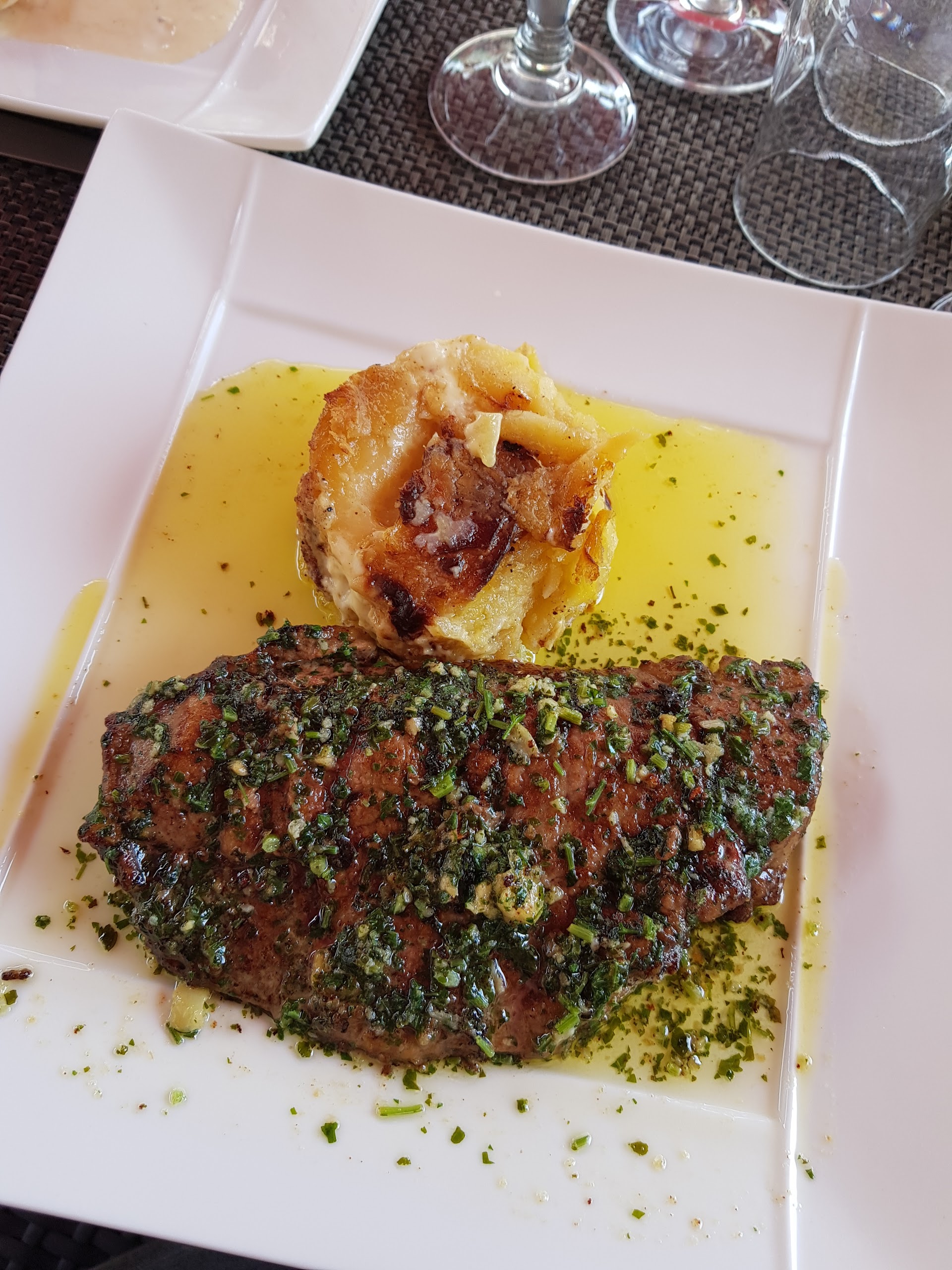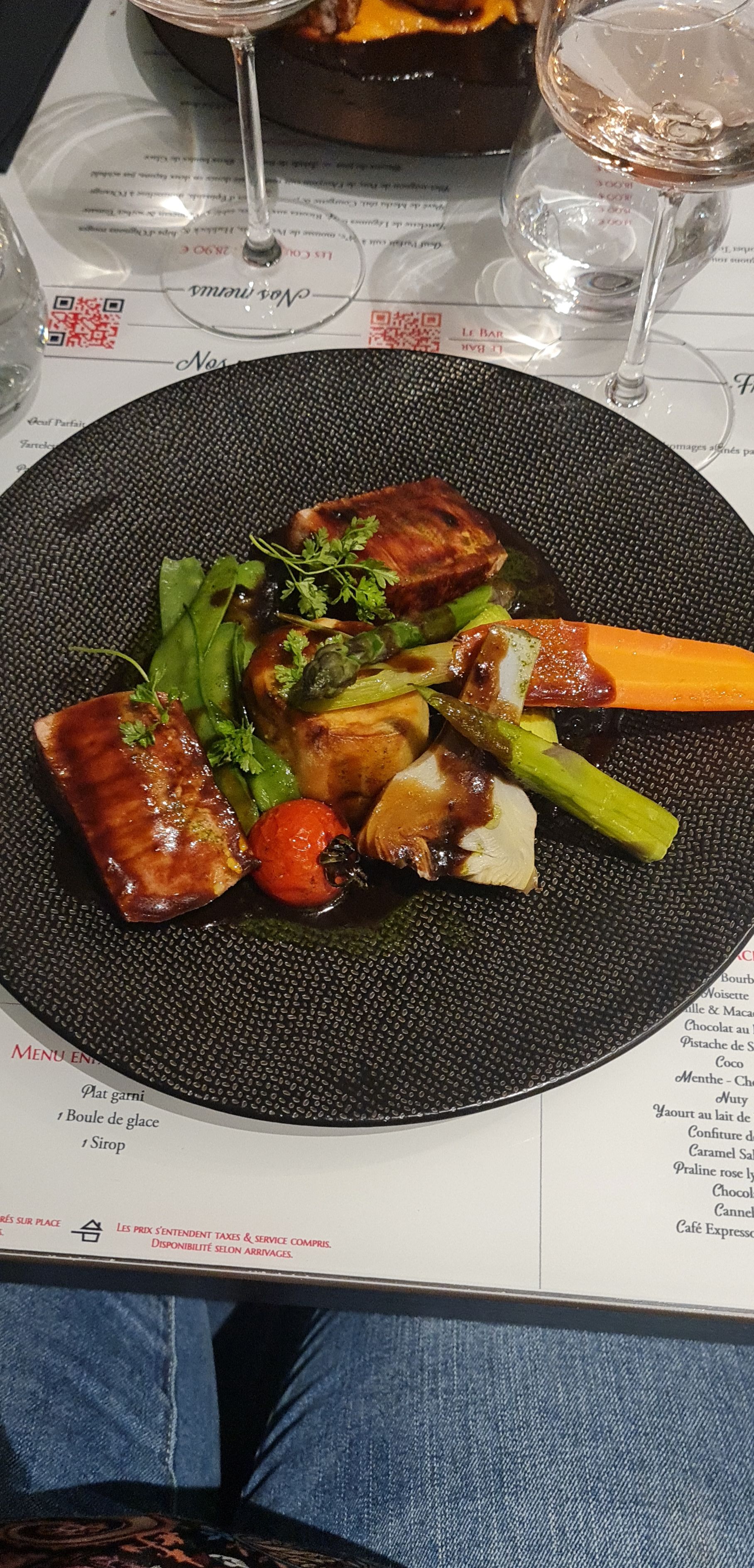 Pas terrible, en entrée mon épouse à pris le foie gras à la carte et moi au menu même quantité la moitié d'une tranche facturé 20euros à la carte. en suite ma femme à pris le filet mignon de porc accompagné de polente. la polente ne se fait pas comme çà, très sèche et le fond noir. moi j'ai pris le croustillant de paleron, viande trop cuite pour de la viande rouge très sec aucun intérêt. Par contre les dessert sont très bon et une très belle carte des vins.