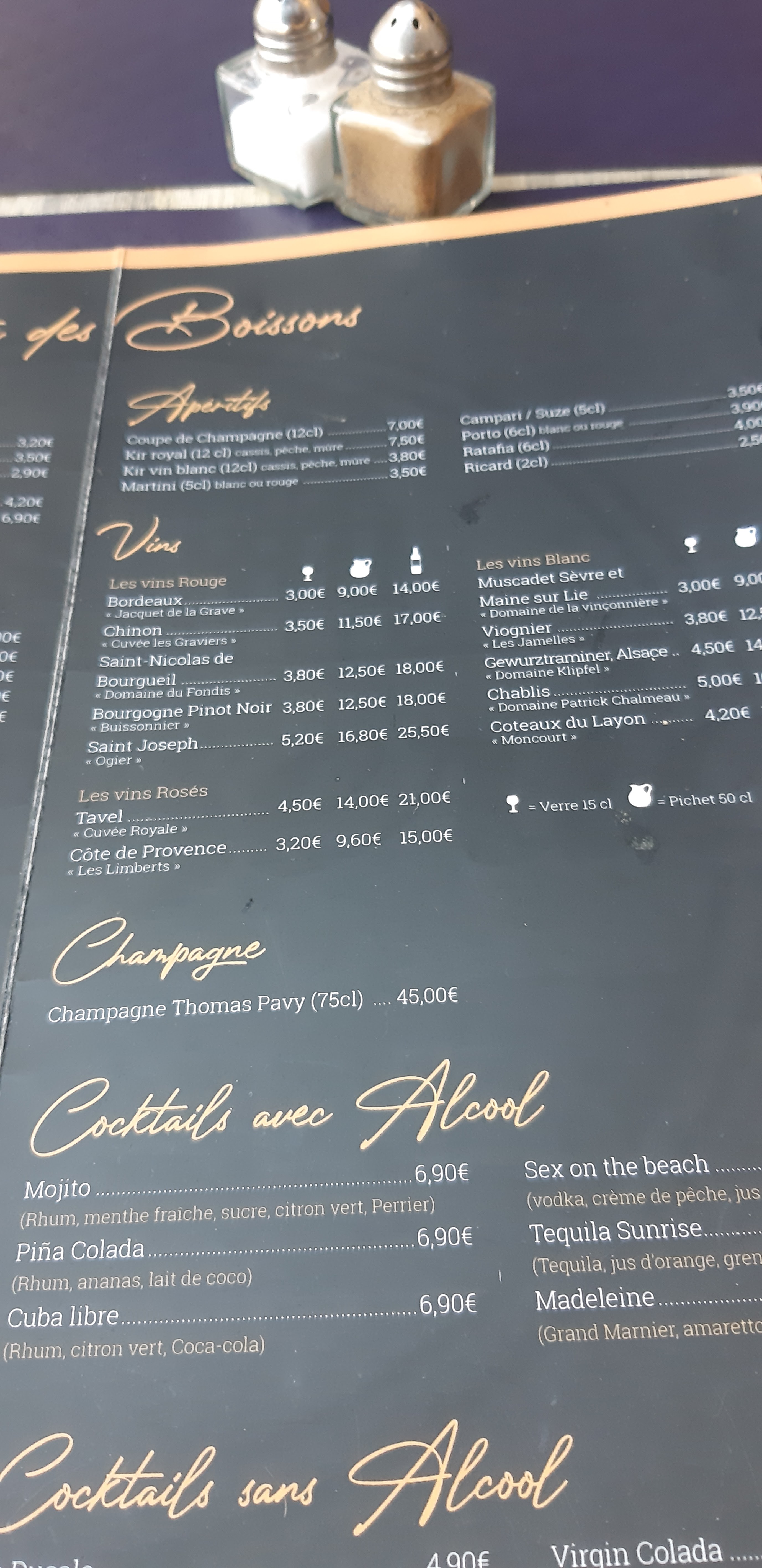 Comment dire ... Pour une première fois, des moules étaient affichées sur le tableau ardoise dehors, j en avais très envie, mais à l intérieur, ha bah non on en a pas ... dessert maison , tarte aux poires, ha bah non en fait on en a pas .... Apéro servi dans un verre largement ébréché ... Bref j en suis ressorti déçu ... Au contraire de mon épouse qui elle a apprécié sa suggestion et sa mousse au chocolat. Je ne pense pas renouveler l expérience.