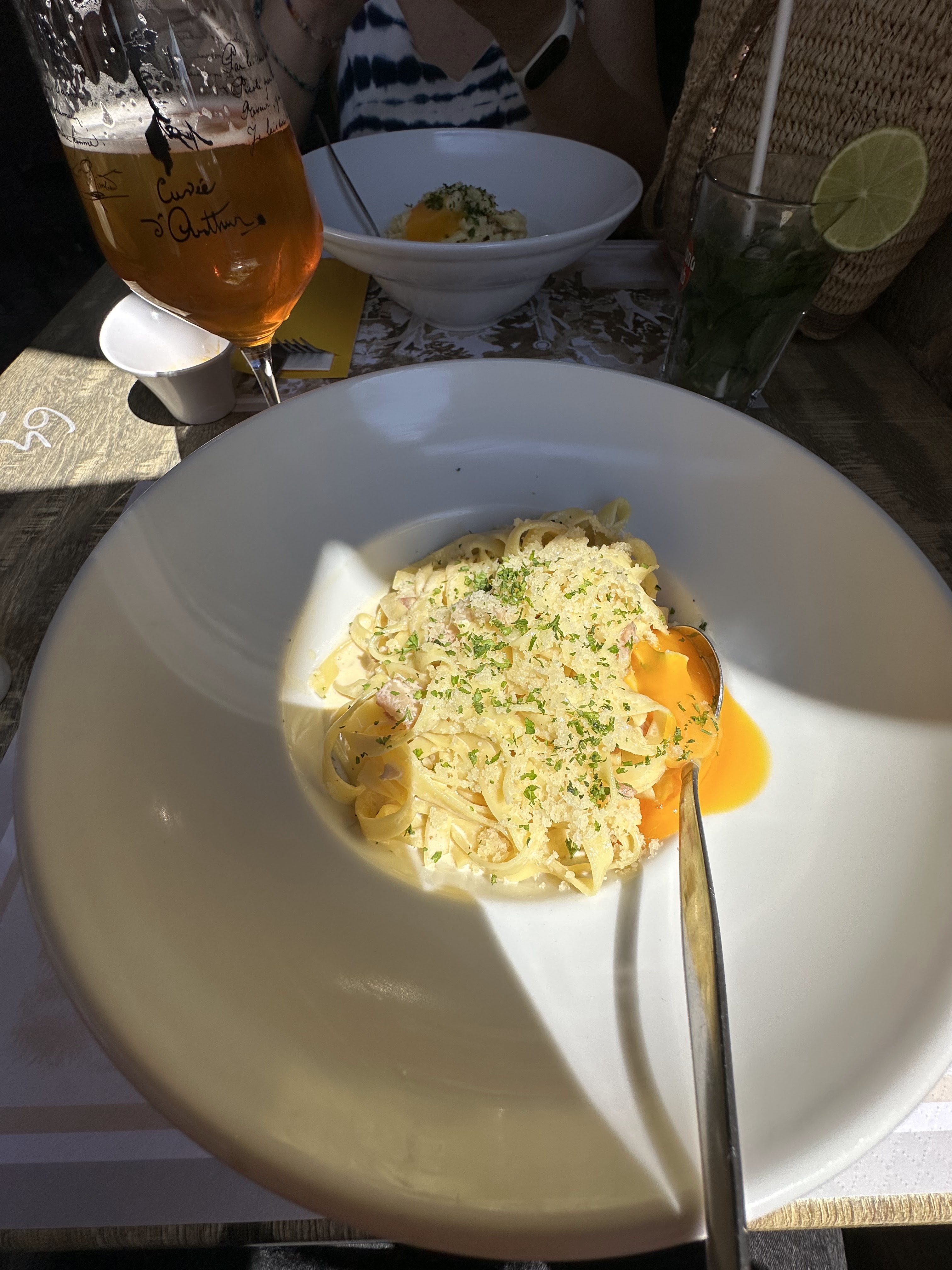 Je ne recommande en aucun cas ce lieu ! Le service beaucoup beaucoup trop long , 1h30 pour avoir seulement les plats . Pas de cartes lorsque l’on est arrivé.. Quand j’ai voulu commander un mojito il n’y avait plus de menthe . Et pour les plats , il n’y avait plus de steak haché pour les burgers ! J’ai alors pris des pâtes au saumon qui étaient immangeable sans exagération , j’ai demandé à ce qu’on me refasse le plat rien n’avais changé au niveau goût . Bref très déçu par lieu , seul point positif -10% pour le plat qui n’était pas bon .