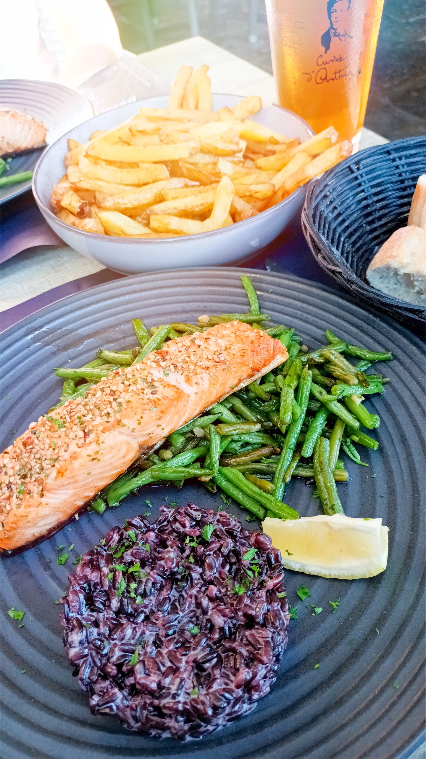 Absolument dégueulasse. Saumon élastique , pâte dans une sauce , plutôt à l’eau Hamburger avec pain rassis, viande avec odeur pas frais. Ce n’est pas frais, insipide, limite du mangeable. Verre de bourgogne, je veux bien voir la bouteille, connaisseur en bourgogne, je n’ai pas reconnu. La tarte toute plate, fade , sans doute achetée sous vide au supermarché du coin. Le point juste pour les frites et la san pellegrino