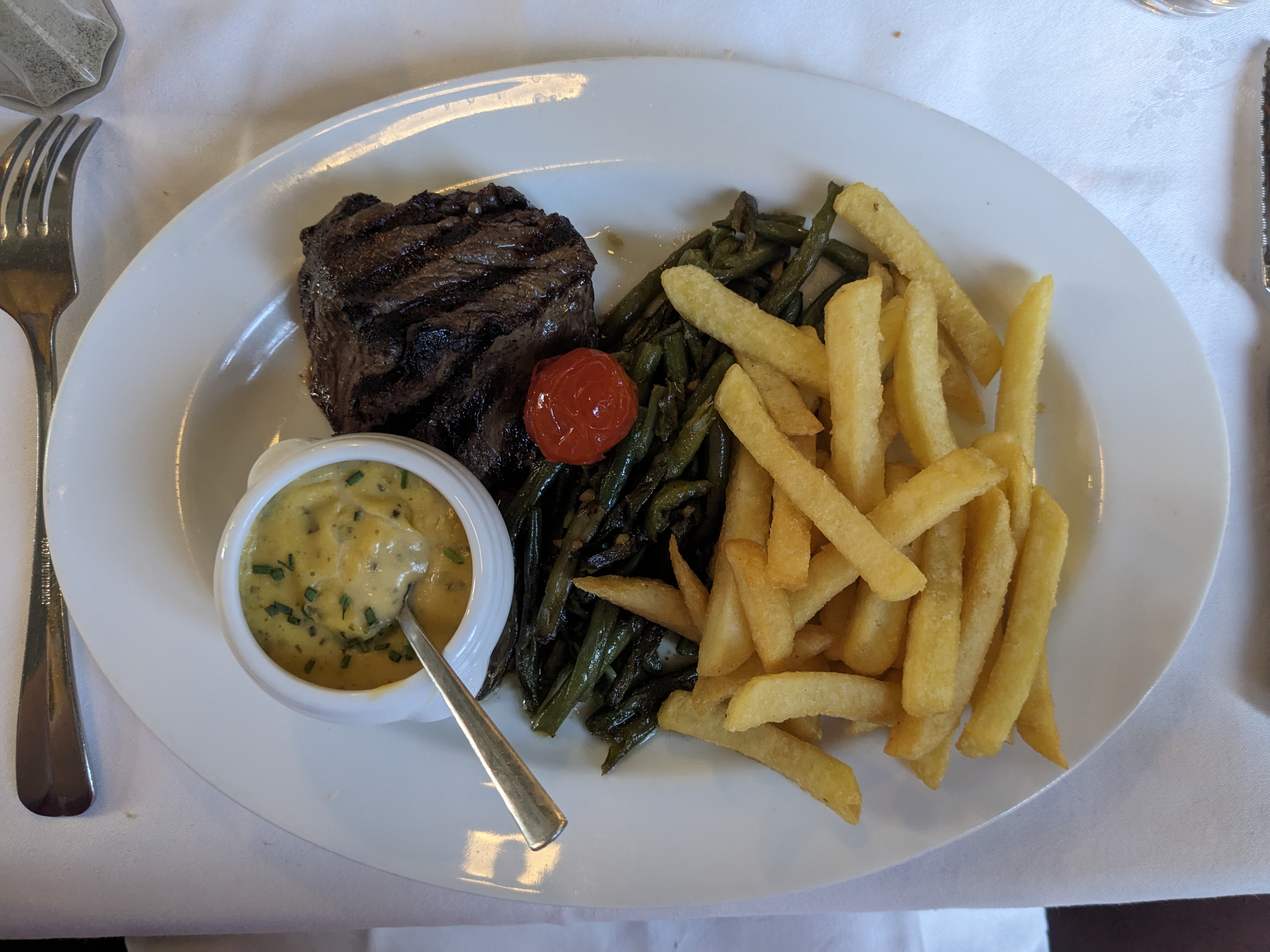 Menu Express de semaine plutôt basique , vin Médoc assez moyen, pièce de boeuf en lamelles mais pas en pavé, café gourmand pas mal, on paye le cadre très sympa. Dommage pour le plat principal et la qualité du vin