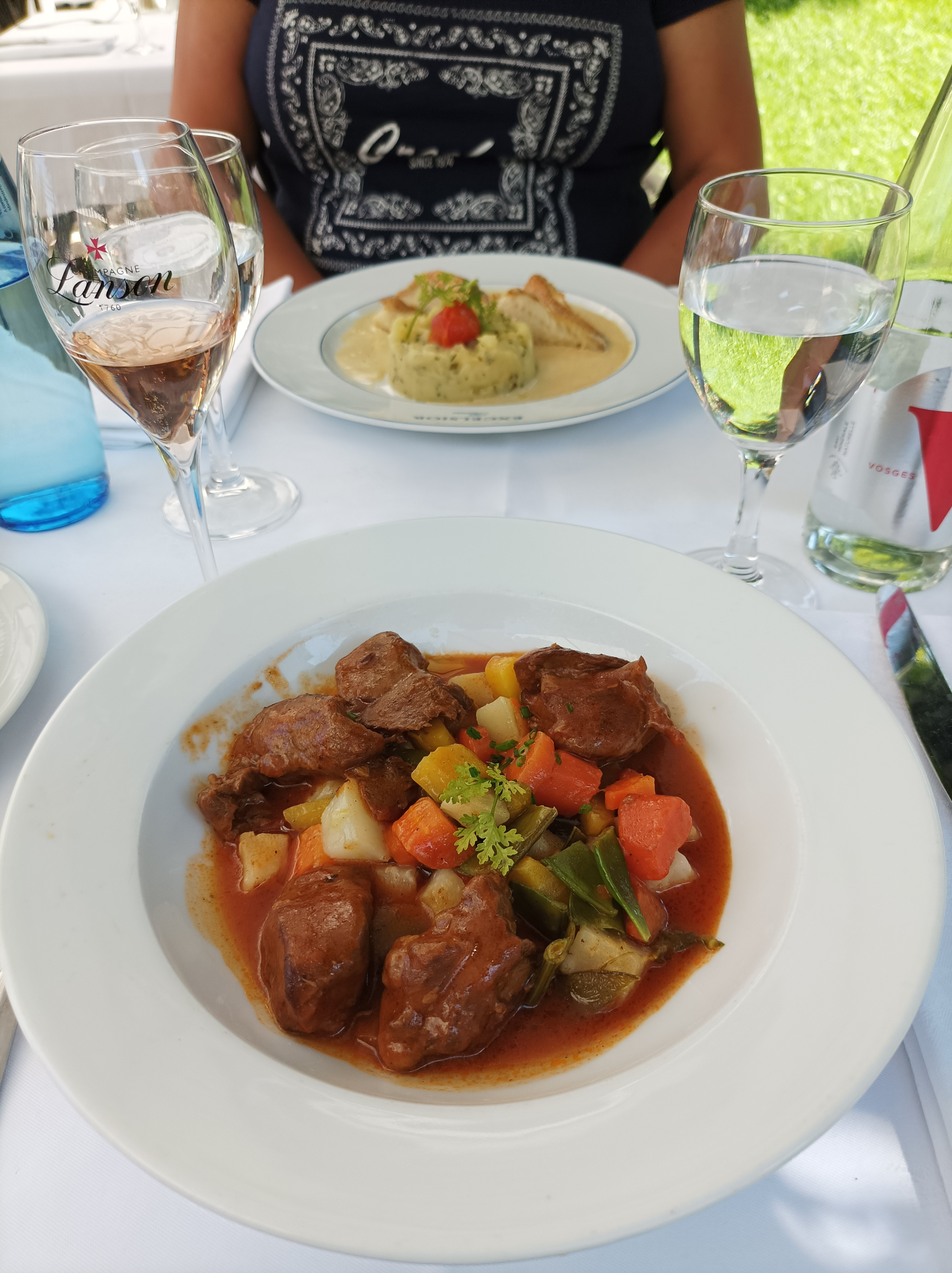 Nous avons dinner un midi sur la terrasse, très agréable musqué bien ombragée en plus des parasols. Quand les plats arrivent bonne surprise quant à le présentation par contre petite déception dans les quantités par rapport au prix demandé. Nous avons pris une grillade de poisson( bien)le risotto st Jacques( 3pauvres st Jacques et le riz pas assez cuit) et le magret de canard (très bonne cuisson mais des légumes trop huileux). Ensuite pour les desserts l’attente a été très longue mais bonne surprise le restaurant nous a offert une coupe de champagne pour nous remercier d’avoir tant attendu. Bon dinner pas exceptionnel mais le cadre est superbe.