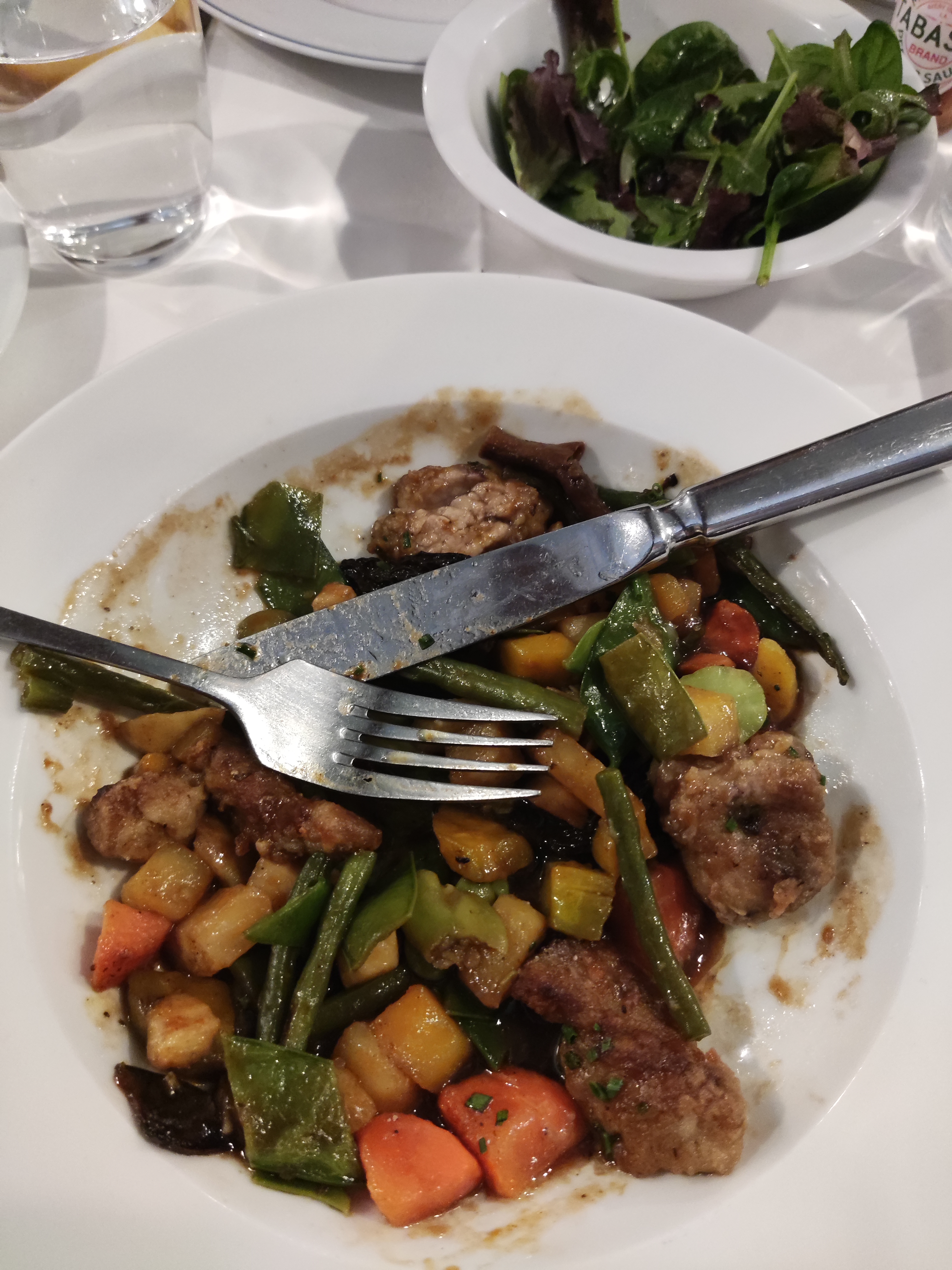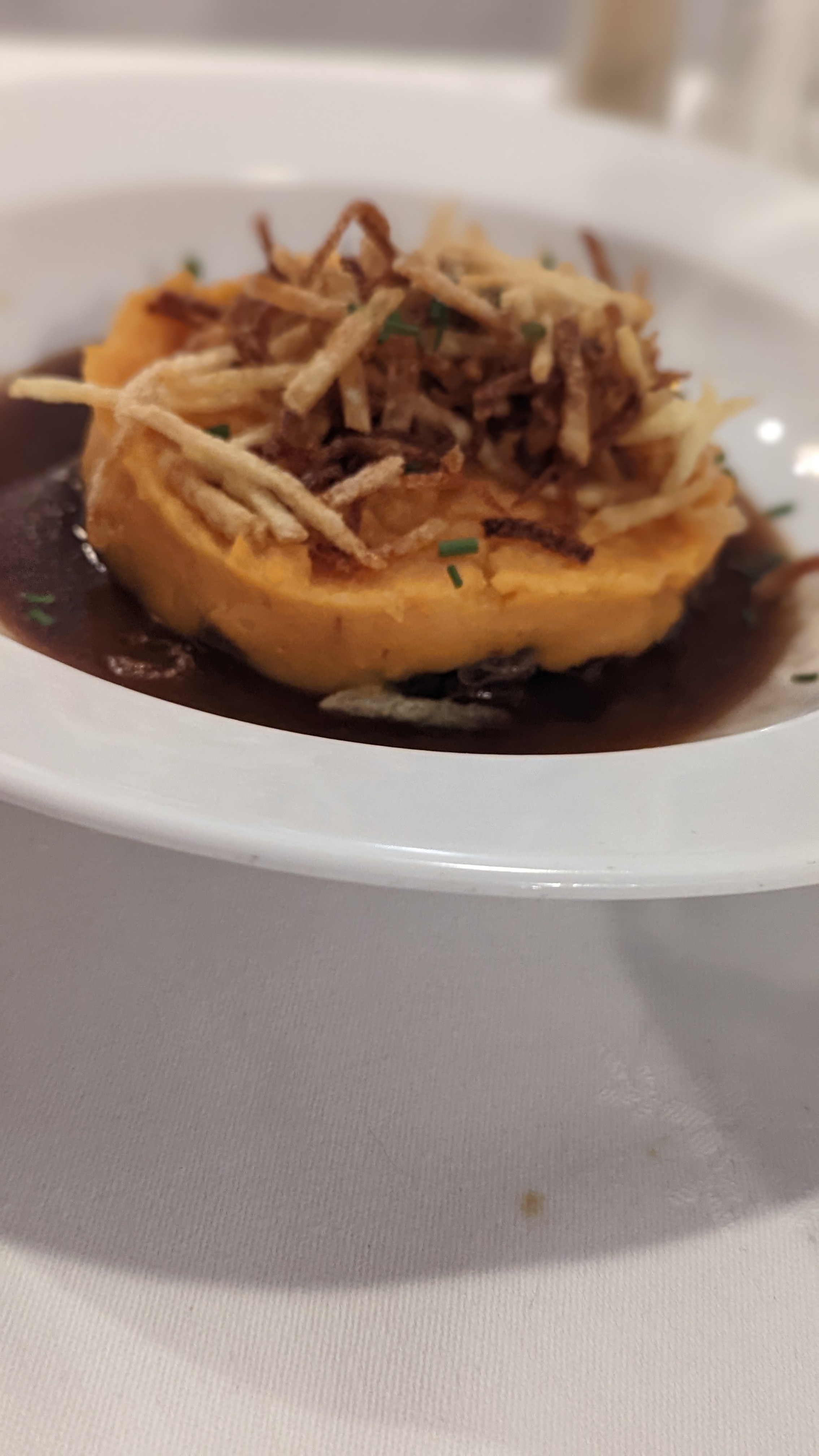 Tellement dommage avec un cadre aussi chouette que la cuisine ne suive pas. Les plats sont arrivés juste tièdes, le magret était ferme et sec, la purée avait « crouté » en surface de sécheresse, du surgelé et des sauces pas faites maison. Le parmentier de jarret de porc était franchement mauvais. Enfin pardon on ne dit c’est pas bon, on dit j’ai pas aimé… et bien les 10 personnes autour de la table n’ont pas aimé. Vraiment aucun intérêt, sauf pour le cadre qui mériterait tellement mieux