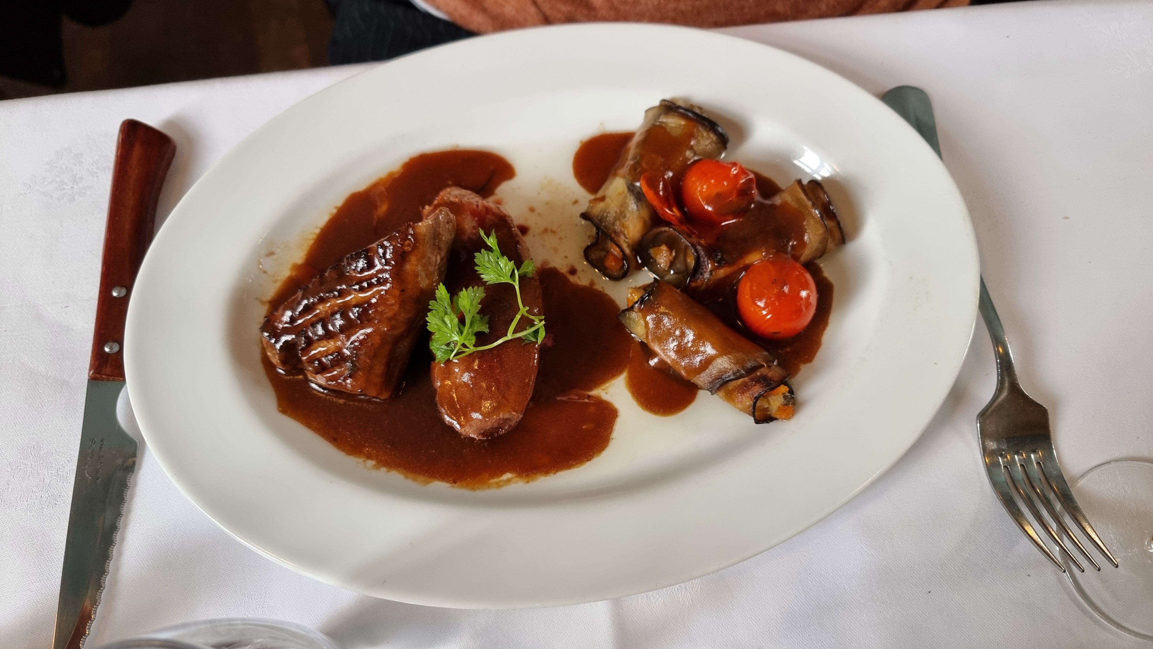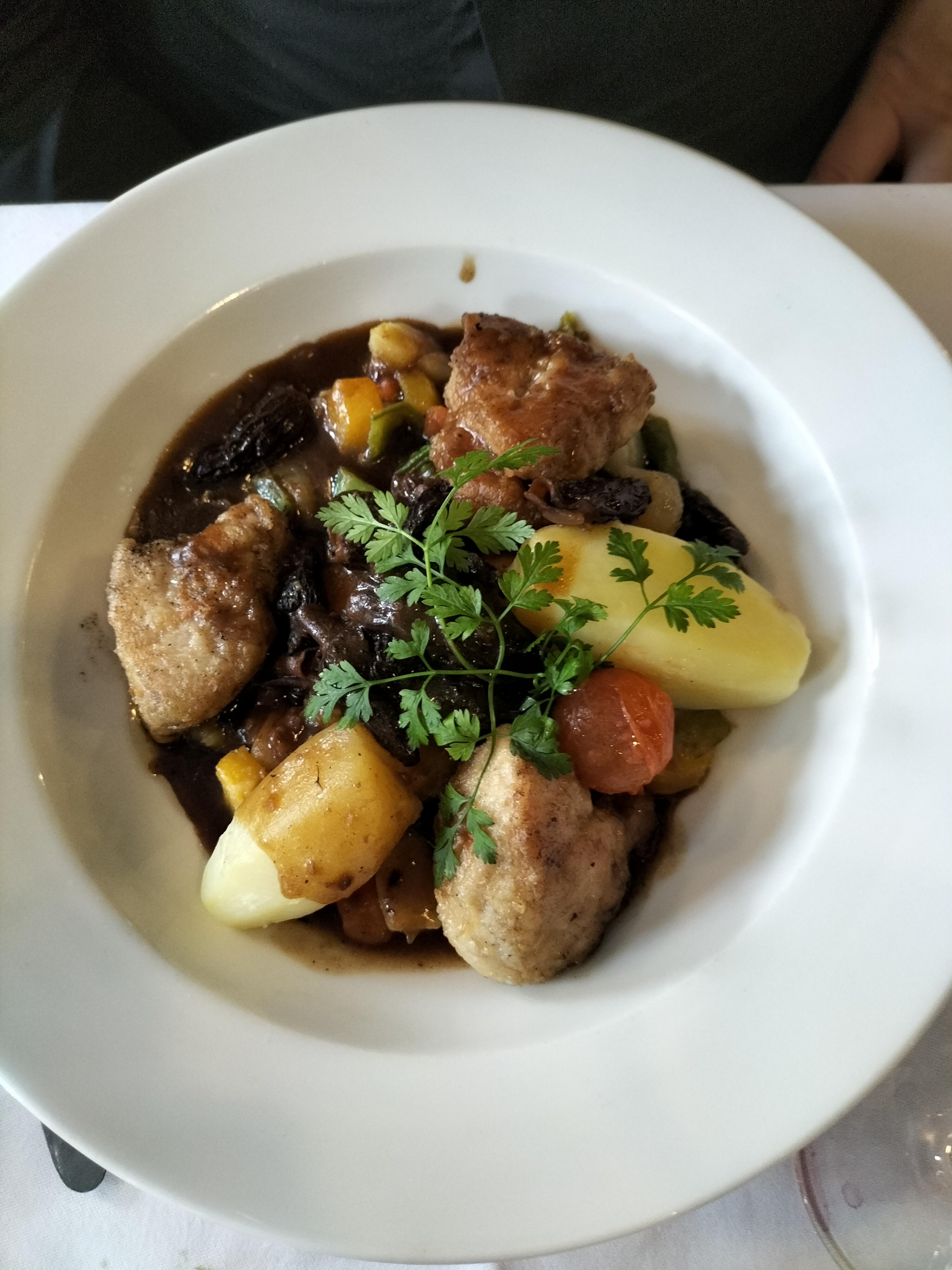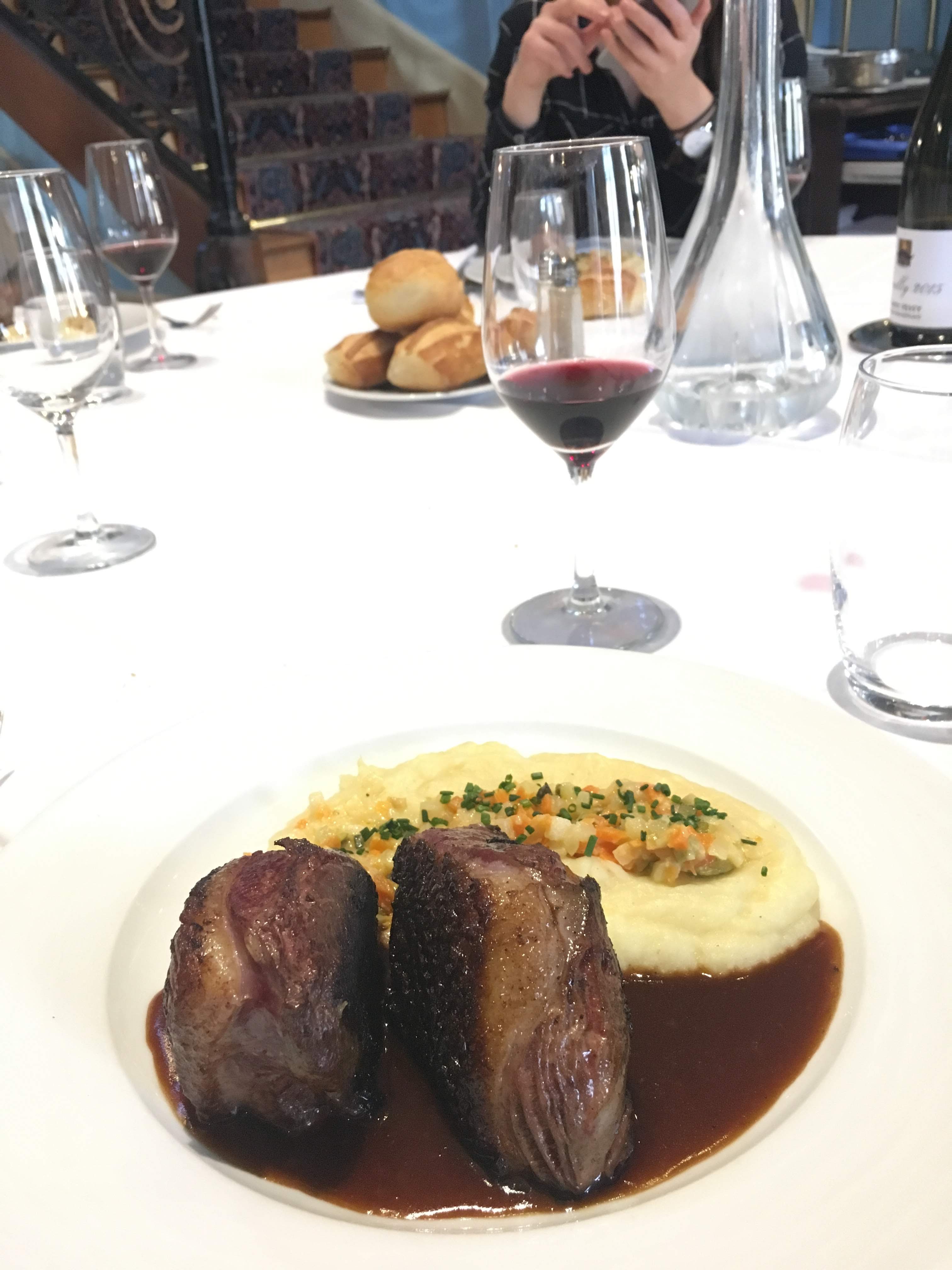 Le repas s’est bien passé, on était en groupe. Le magret de canard était trop sec et les pommes de terre en dessous incompréhensibles (purée faite en galère?), le crumble était seulement une salade de fruits tiède avec quelques miettes par dessus. Le responsable de salle hésitait pas à mal regarder quand on a pris du vin en supplément et sa présence autour des tables était stressante. Les serveurs à leur tour étaient agréables et souriants et nous ont offert une expérience positive.