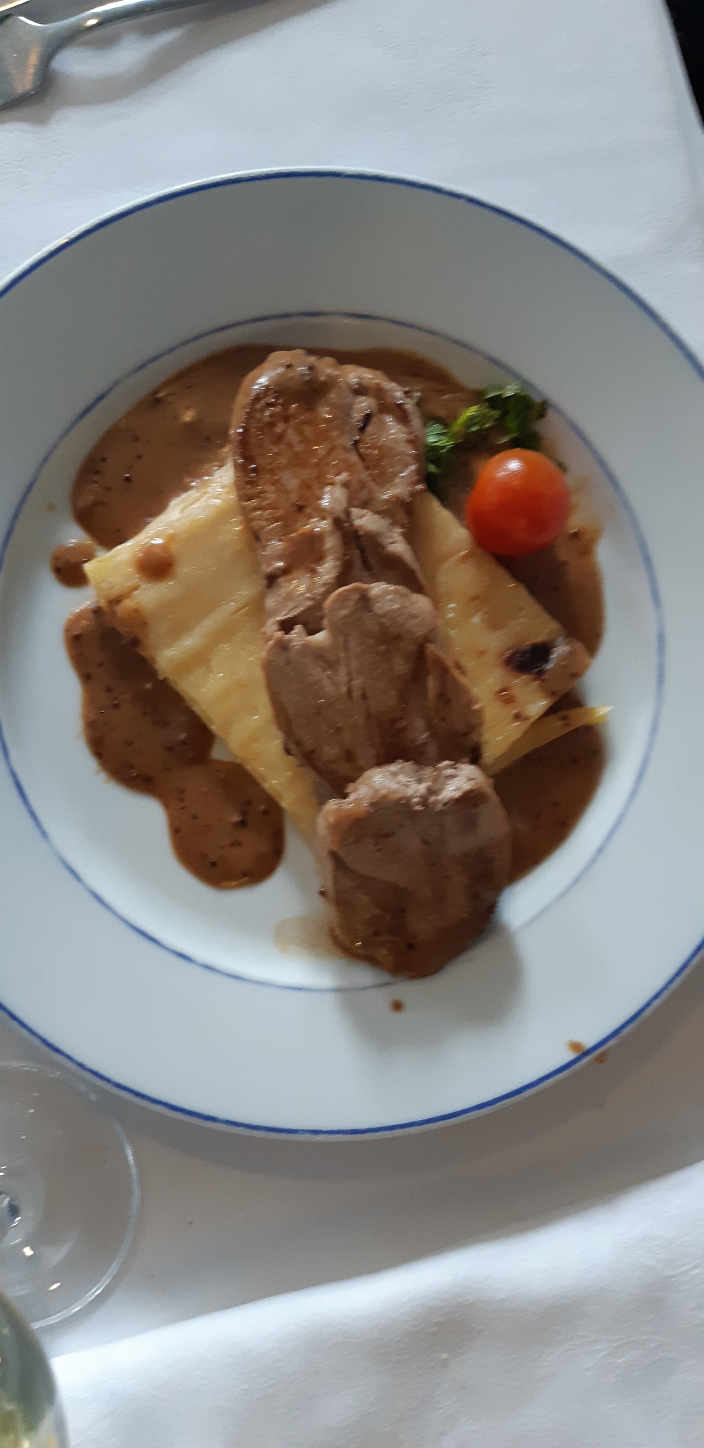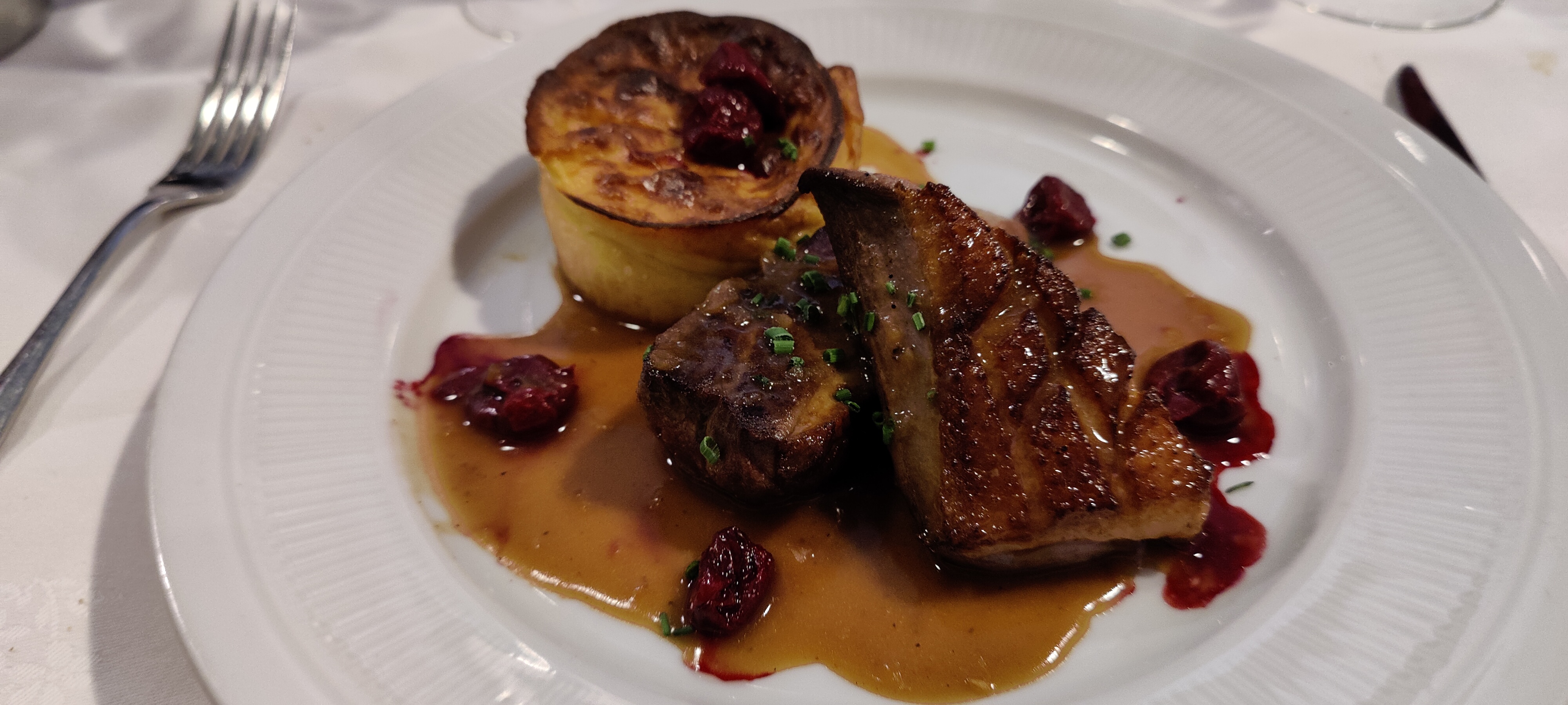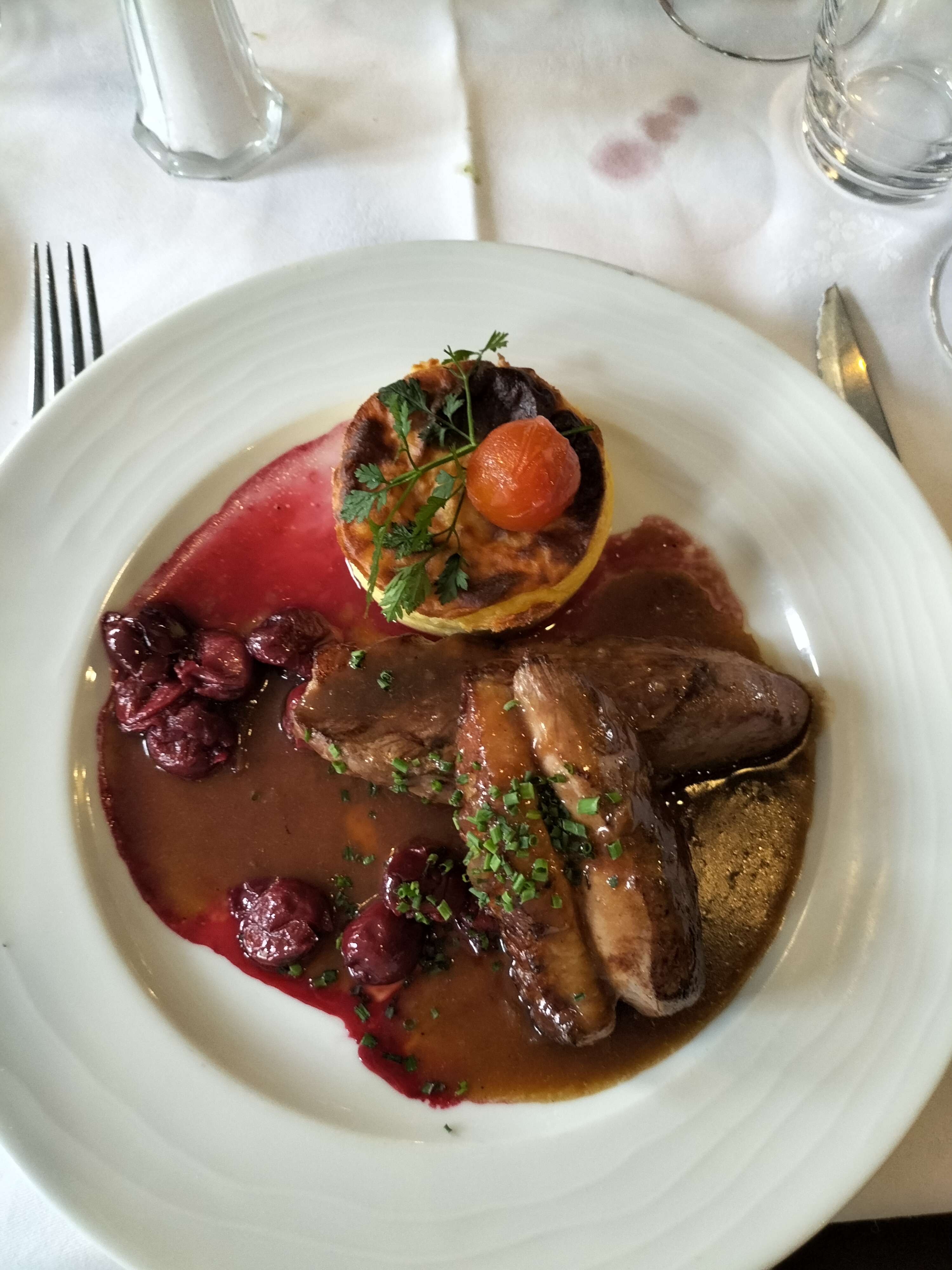 Assez déçu. Le magret de canard était trop sec et l'entrée quelconque. Le plat à base de noix de saint jacques etait un peu plus reussi. Nous avons du faire changer un verre qui était sale.