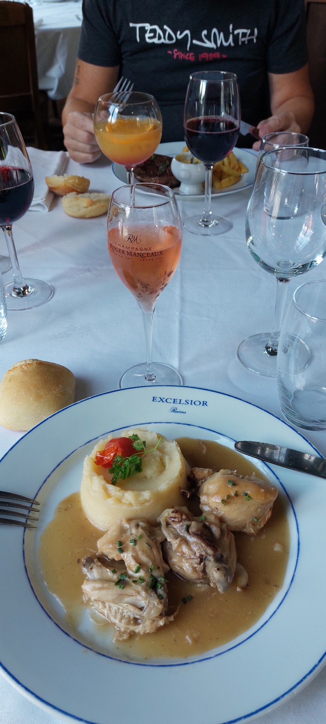 Très touristique mais bonne adresse. Un amuse bouche pour commencer, un jambon de Reims en entrée de tres bonne qualité, un tartare de bœuf bien préparé une glace et un café pour terminer le tout accompagné d'une bouteille de champagne. Belle soirée. Attention à réserver votre table en terrasse sinon vous devrez patienter.