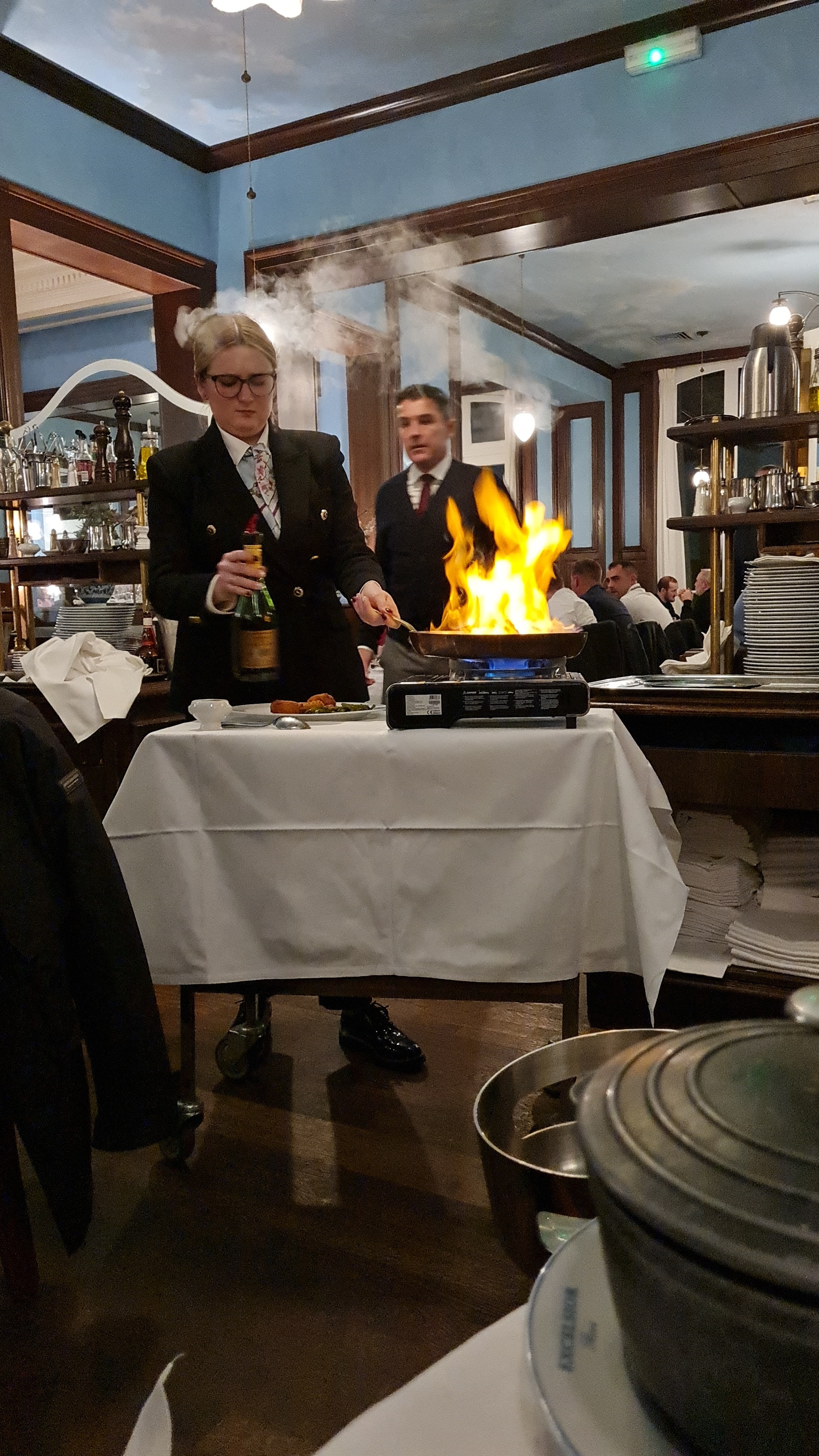 Lieu sympa par la déco et le style du monument. Les couteaux, doivent avoir l'âge de l'établissement... Concernant le menu, nous avions commandé du foie gras avec un chutney de fruit, à l'arrivée le chutney c'est transformé en oignons grossièrement découpé... Le plat, un onglet de boeuf, la viande est bonne, par contre les patates, qui accompagnent le boeuf, sont cuite dans l'eau... Aucun goût, fade, pas salée enfin bref pas l'top. Après l'avoir signalé au serveur, comme d'habitude, vous devenez un rebel et on vous sert en dernier. Sacré mentalité... Je n'y retournerai pas. Laurent