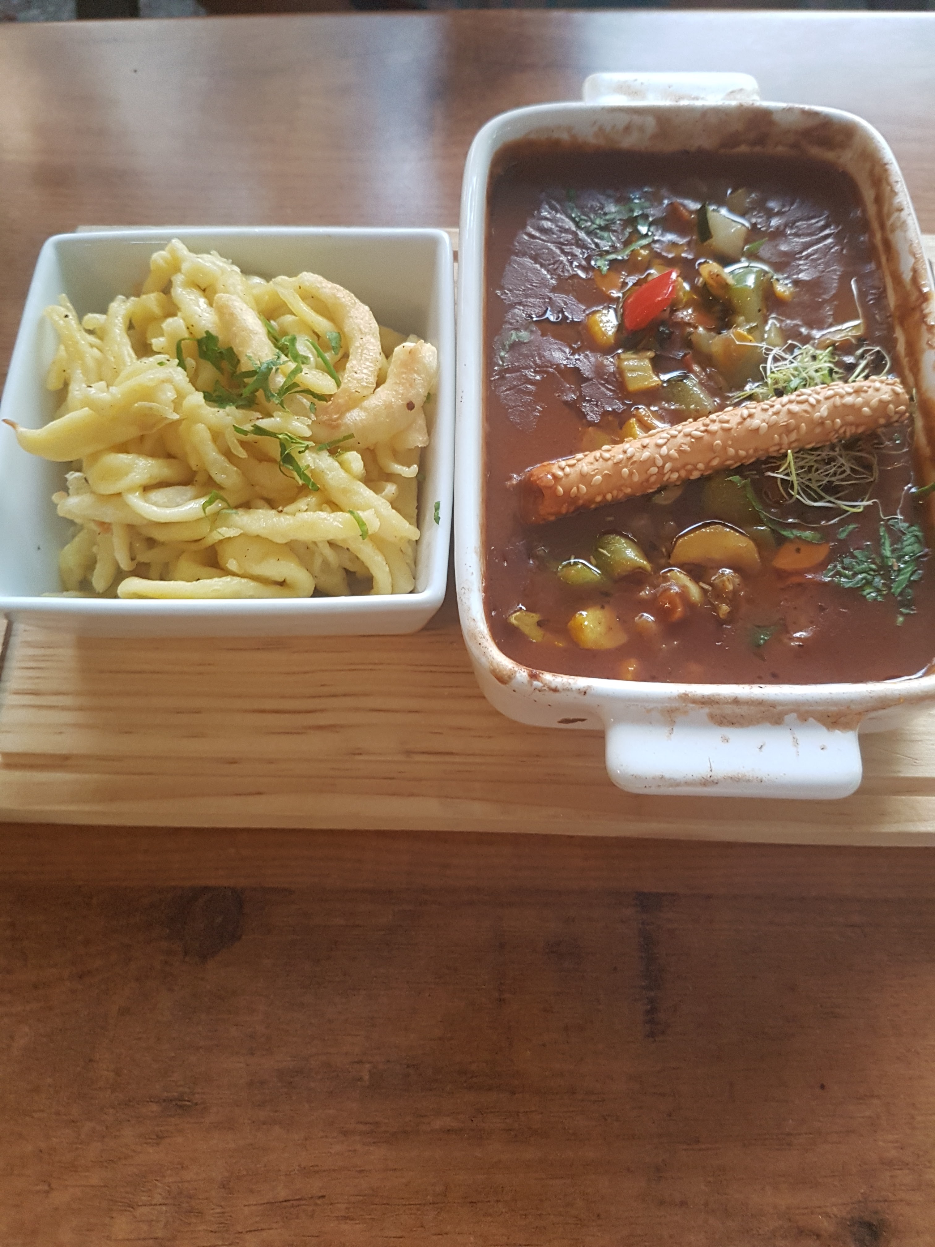 Fleischkiechle et Lewerknepfle accompagnés de Spaetzle maison de très bonne facture. Des bières maison savoureuses.