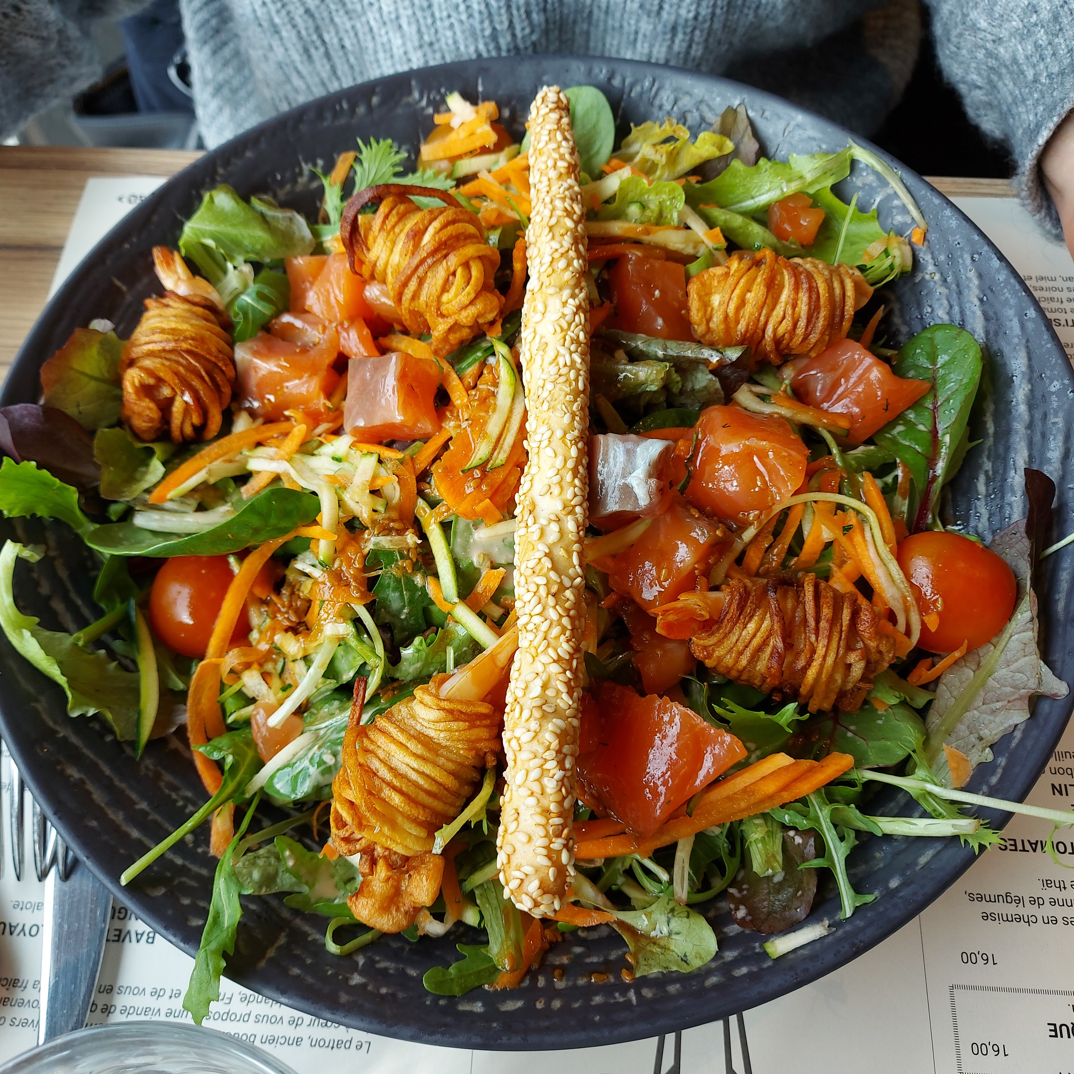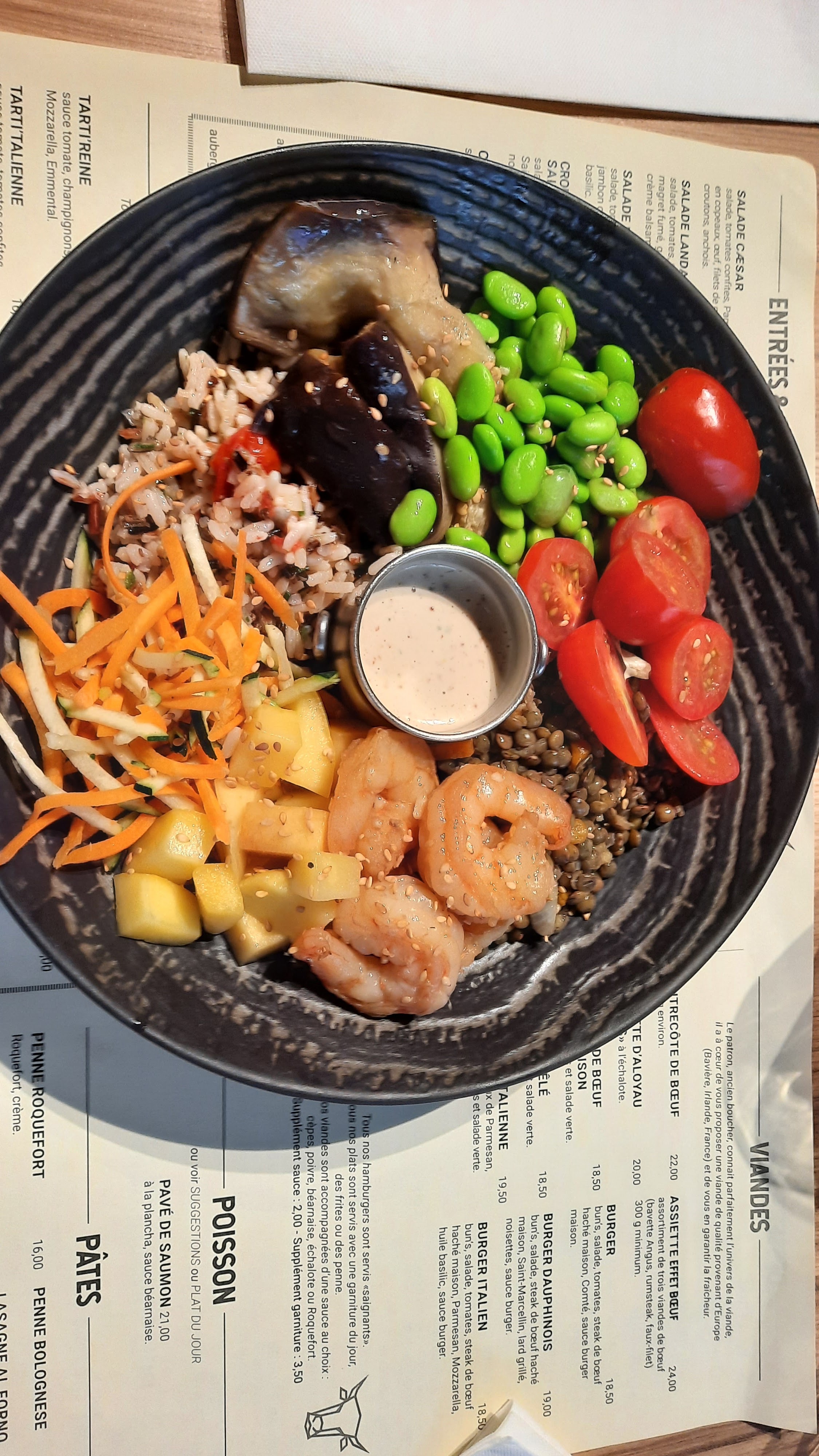 Très emballée par la carte, mais un peu déçu de voir l'assiette, poke bowl effet boeuf alléchant mais dans l'assiette très simple rien de travaillé et on reste un peu sur notre faim, les bugers bon mais pas pas exceptionnel, un peu chère pour ce qu'il y a dans l'assiette. Produits de qualité . Personnel agréable mais pas très commençant, un verre renverser, confusion dans les plats, nous étions une table consequent avec apéritifs, plats, vins dessert café et digestifs et pas de gestes particuliers (repas 40€ par personne )