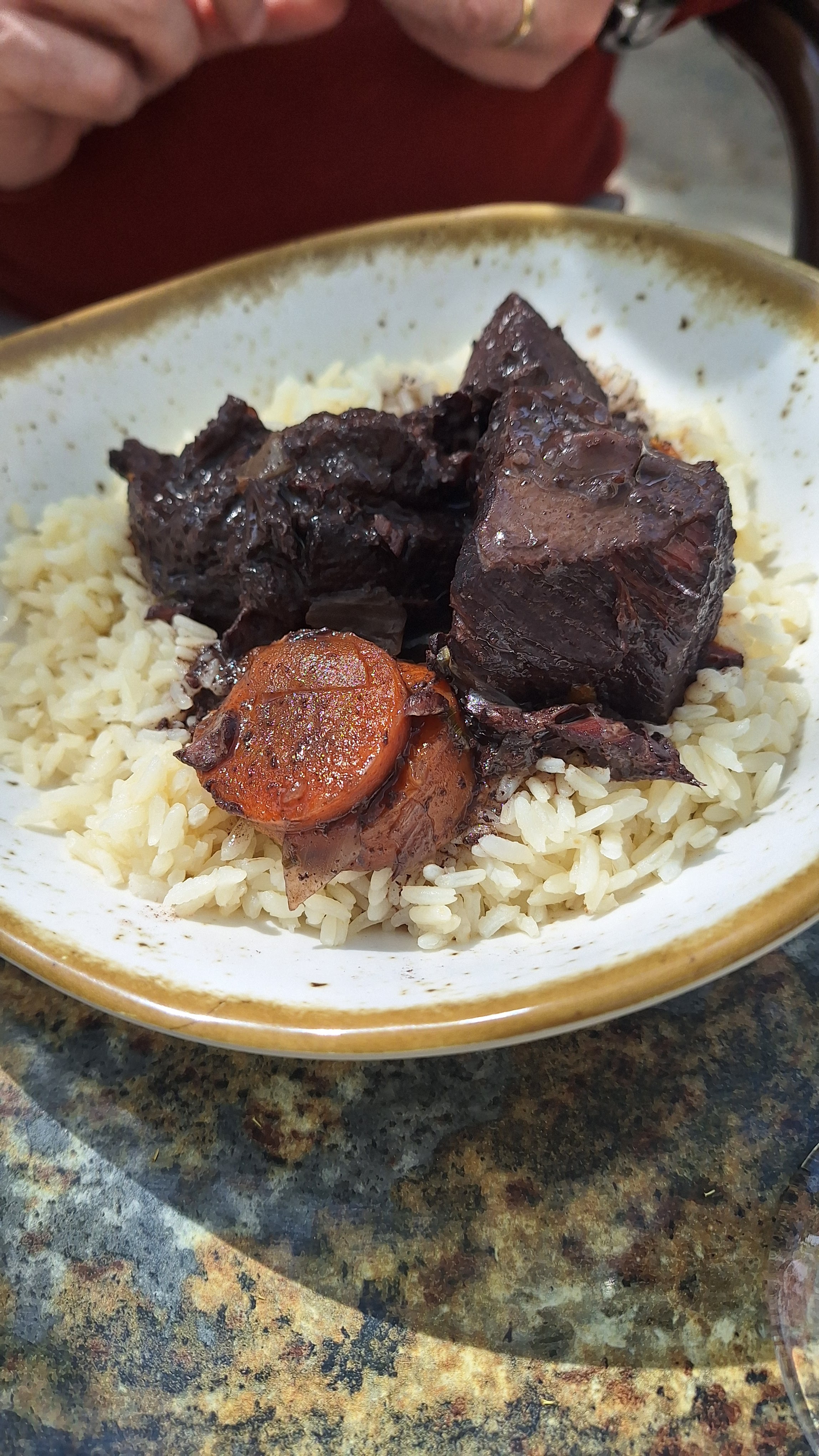 Janvier Ville déserte, normal hors saison. Une étape sur notre trajet pour le déjeuner. Un des rares resto.ouvert. Soleil abondand et je comprend que le service en terasse un midi avec un seul serveur ce n'est pas possible. Intérieur bondé. Plutôt bon signe habituellement. Commande steak de taureau..pas livré...et je passe sur la petitesse du whisky coca...comme en boîte de nuit. Pas de steak. On se rabat pour faire plus original que les pizzas qui embaument la salle sur une gardianne de taureau accompagnée de riz cammarguais....erreur fatale. Riz...oto sans sel. Sans saveur. Gardianne...juste un arrière goût de vin. Pas un légume mijote ou un aromate à l horizon.Deceptif au possible.