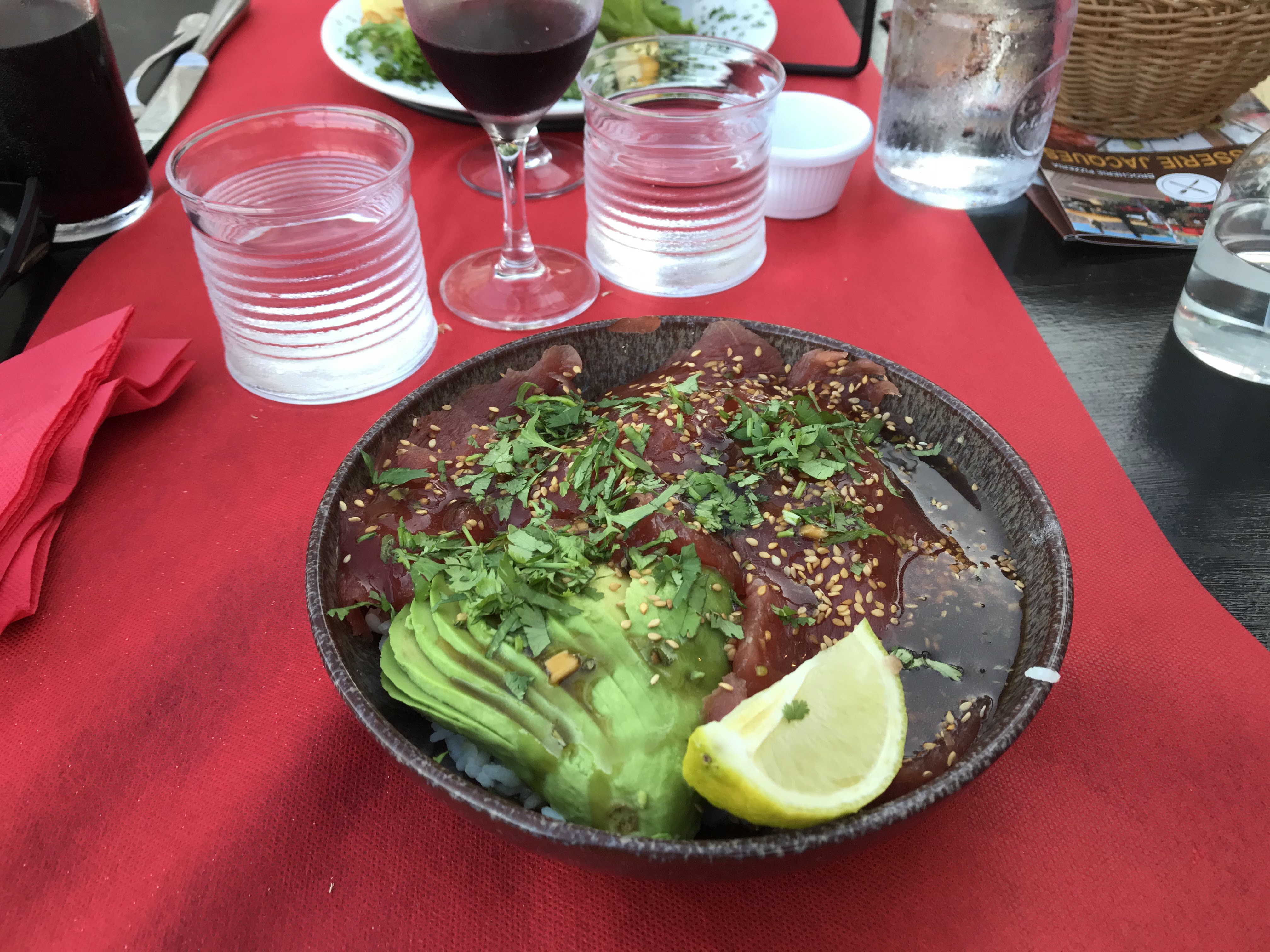 Poke bowl thon très bon pour personnellement j’aurai rajouté un peu de concombre ou autre verdure mais sympa. La présentation de la brochette saumon top et frite maison (vrai pomme de terre)... Pour ma part j’apprécie Ils ne prennent pas les tickets restaurant....
