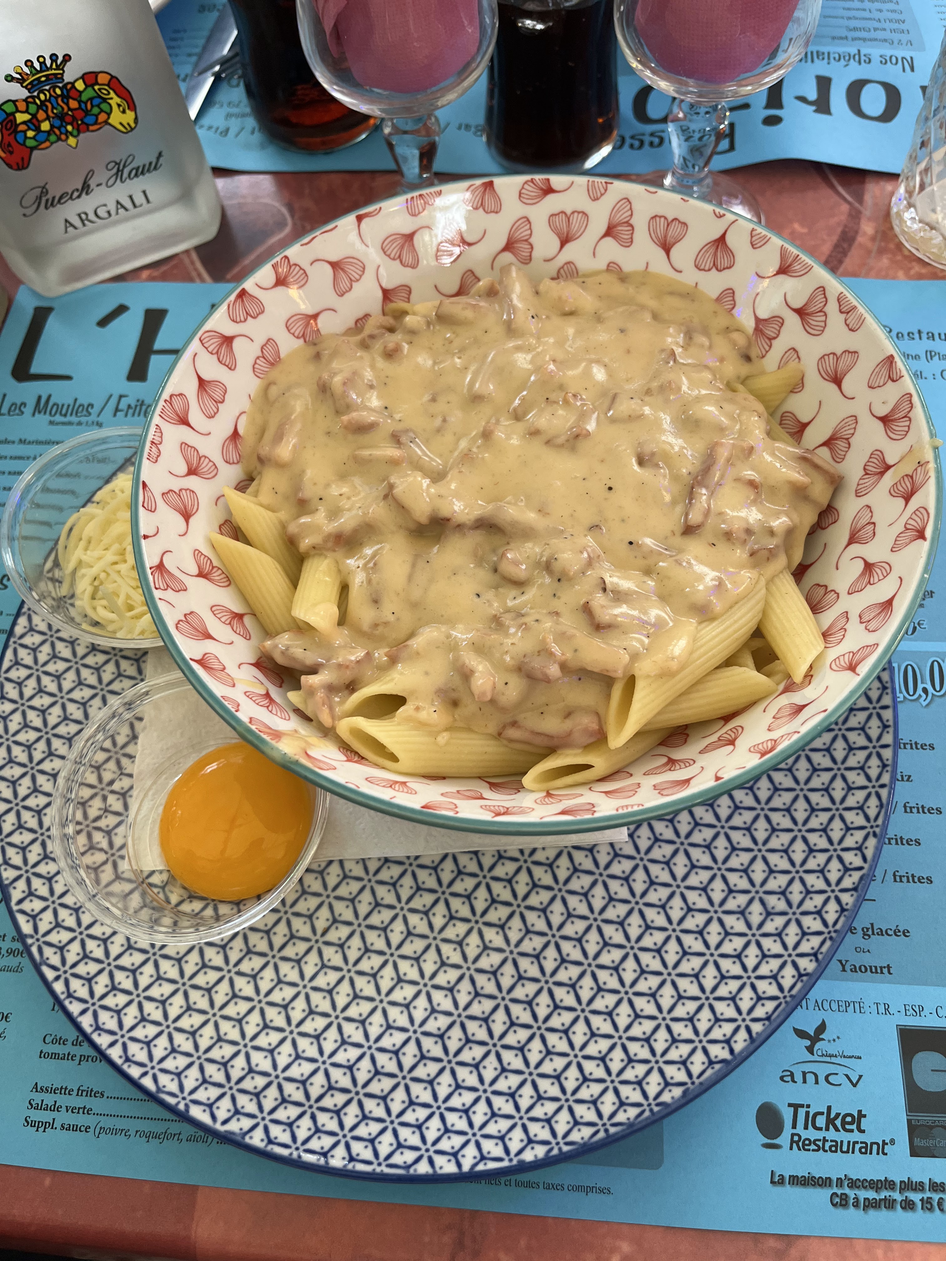 ATTRAPE TOURISTE ! J'ai pris des moules marinière à la crème et les moules n'étaient pas bien nettoyer, la sauce aucun goût on aurait dit de l'eau et les frites pas très bonnes non plus. Même le couple d'alsacien à coter de nous ont bien vus que les moules étaient sales. Du coup je n'ai pas manger les moules et j'ai pris des pâtes Carbo à la place qui étaient elles aussi très fades. Les pâtes trop cuites. Bref Très déçu, on ne recommande pas.