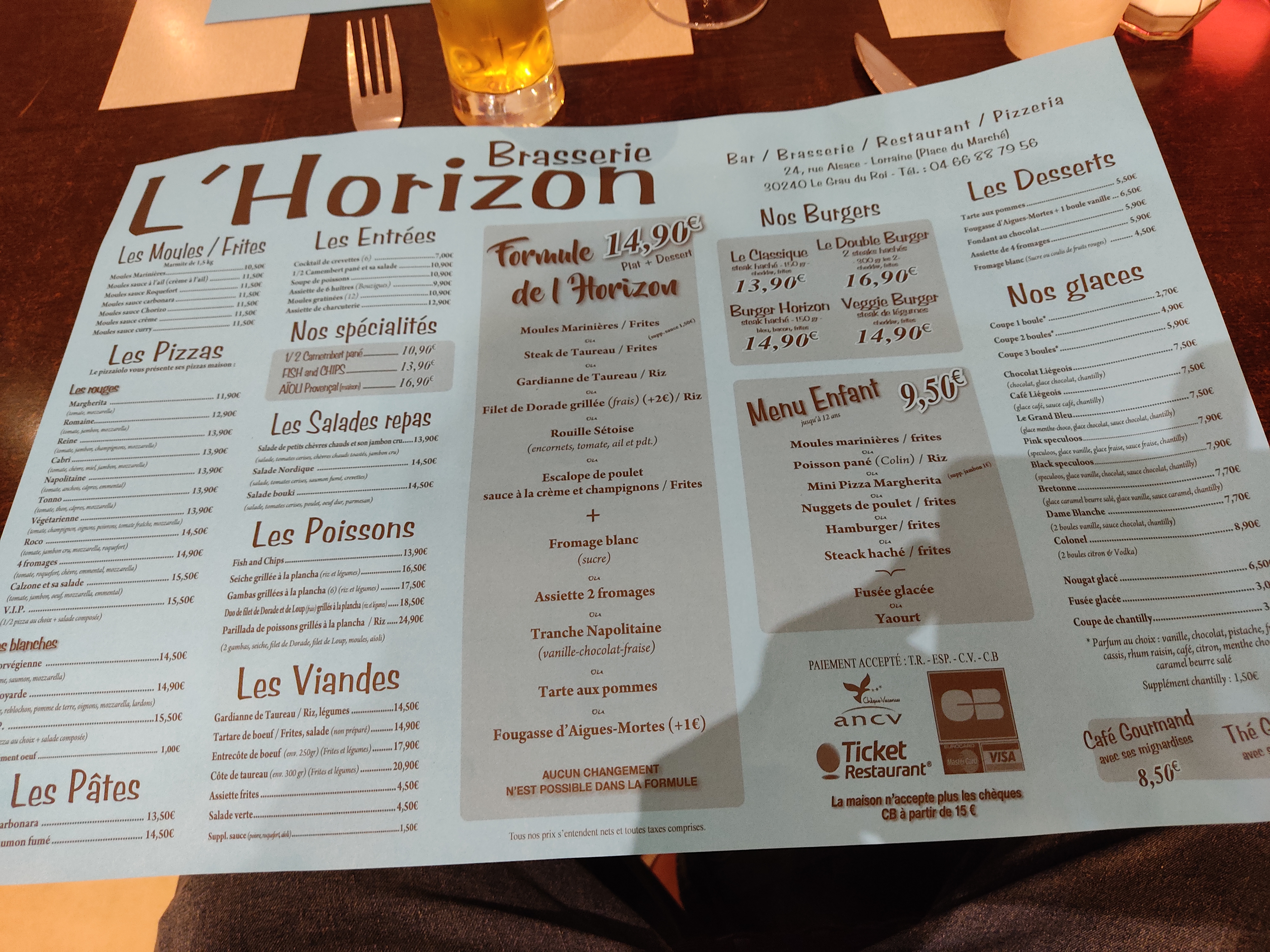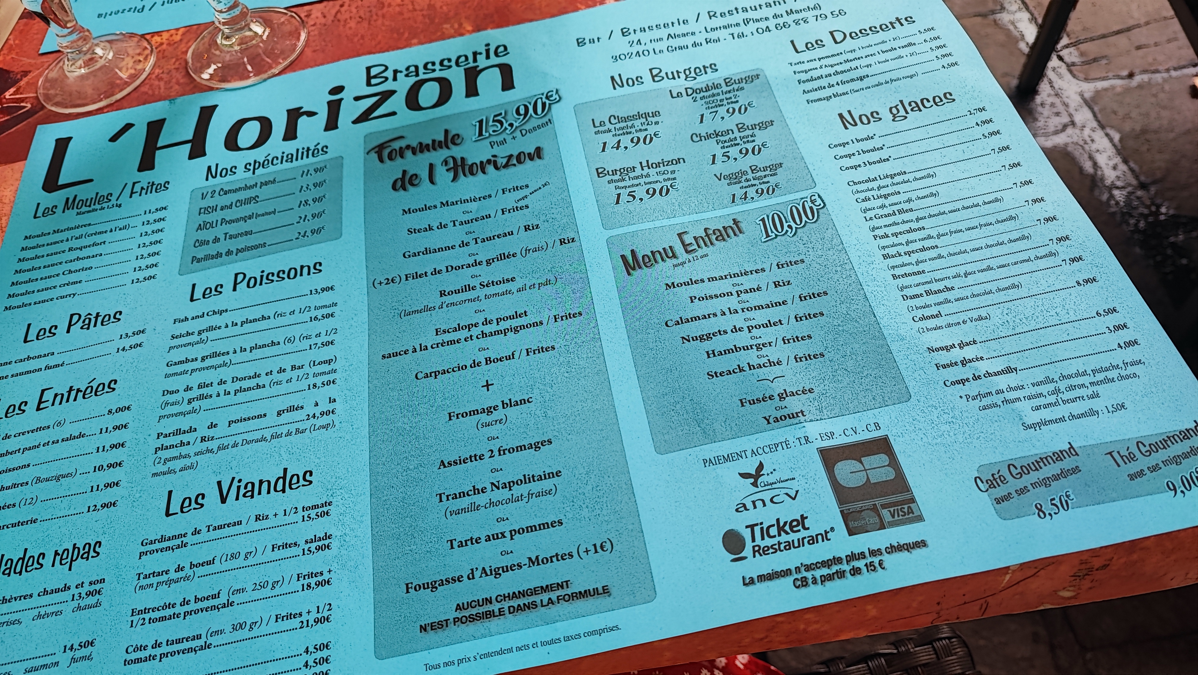 Prix élevé par rapport à la qualité servi. Présentation pas mieux que dans une cantine scolaire. Mon père a commandé une gardiane de taureaux, il a été très déçus (viande dur et mal assaisonnée, accompagnement à revoir, riz sec, aucuns légumes comparés à d'autres restaurants du Grau du roi). Quand à moi, j'ai commandé un burger et au niveau goût et présentation même ceux de Mcdo sont meilleurs. Très déçus de ce dernier restaurant de nos vacances. Je ne le recommande pas.
