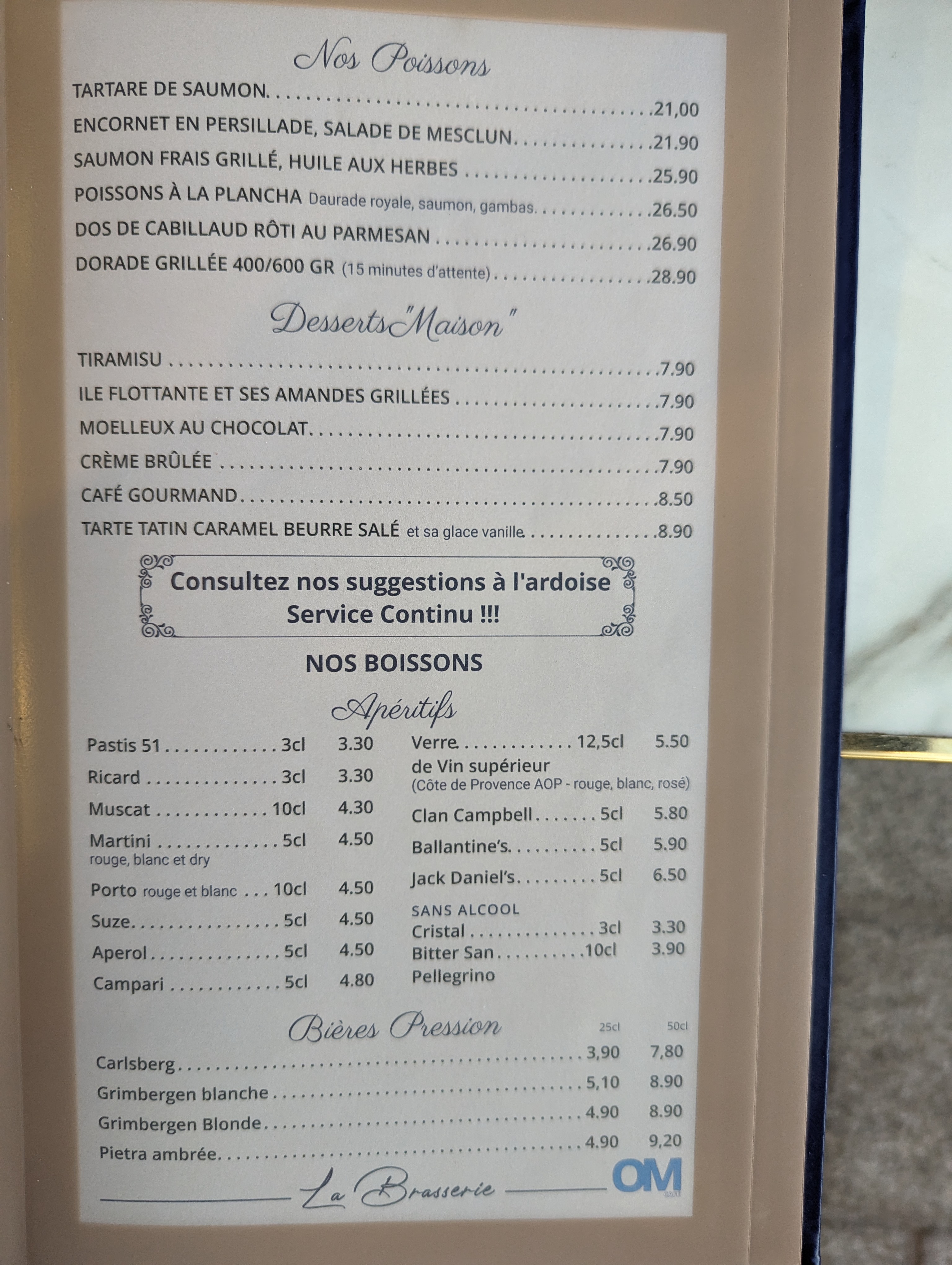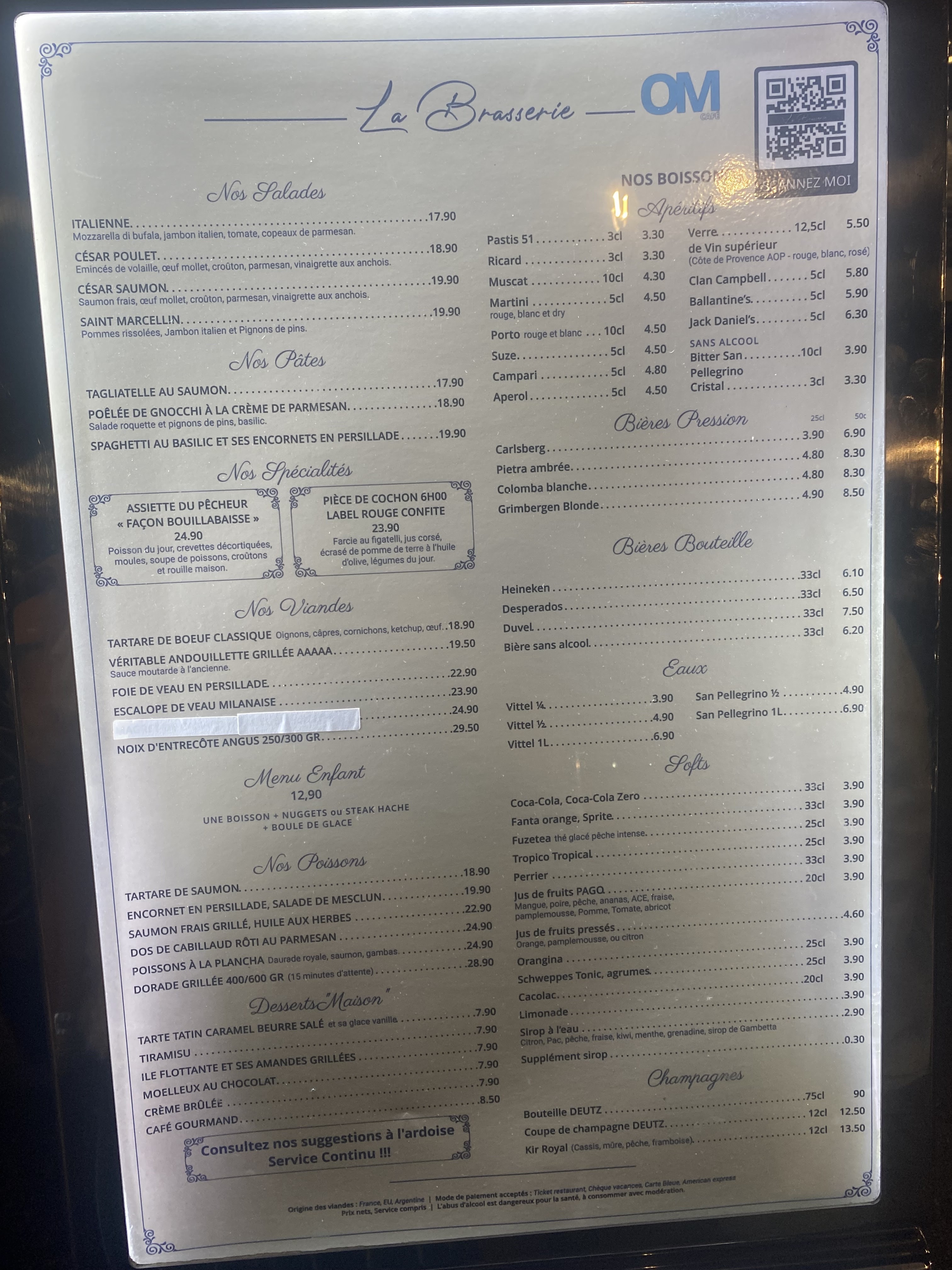 La Brasserie de l'OM on a vraiment adoré, nous sommes venu sur conseil de plusieurs amies Que ce soit l'ambiance de la salle, les plats et le service la vue sur le vieux port. Vous pouvez payer espèces carte bancaire. Merci aux cuisiners pour ses merveilleux plats et les montages des assiettes. Merci aux serveurs et serveuses Je pas hésiter a réserver c'est souvent très pris et de leurs demander des conseils sur les plats les boissons ainsi les visites en ville Je vous conseil vivement seul en couple ou même en groupe ainsi avec les enfants Il y a bien-sûr des diffusions de matchs OM