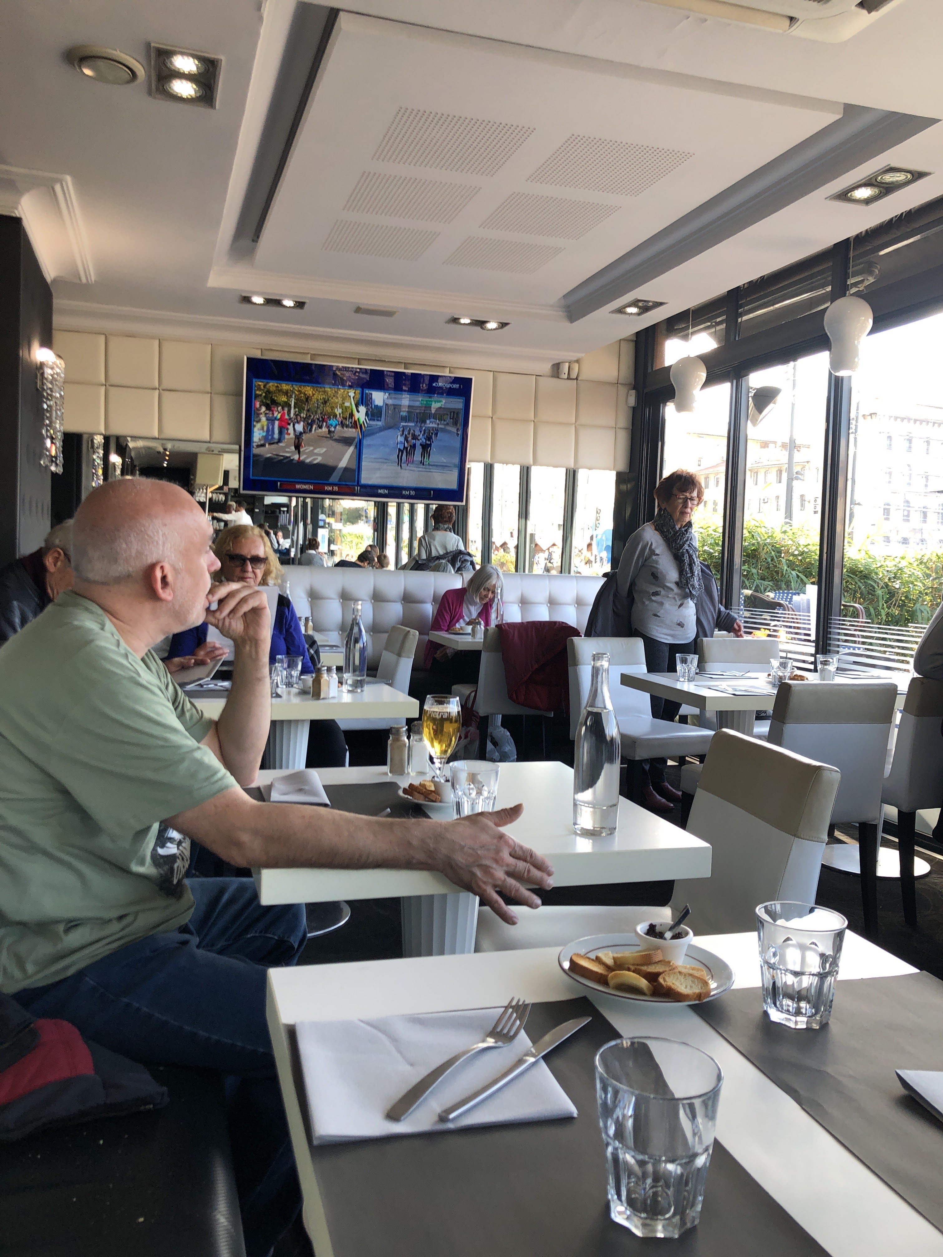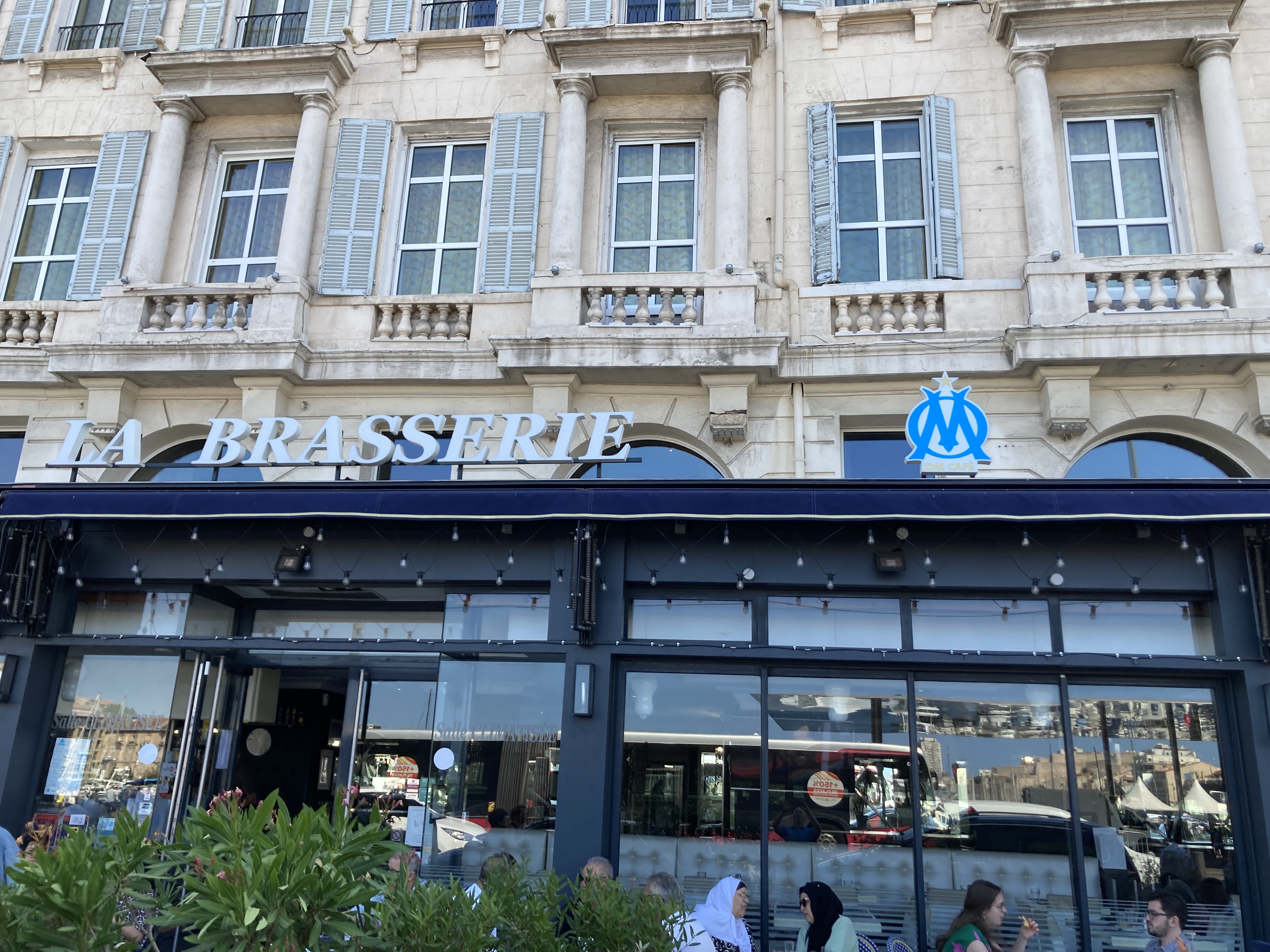 La brasserie de l’OM quai des belges sur le port de Marseille. Terrasse et grande double salle intérieure. Les serveurs sont sympas.