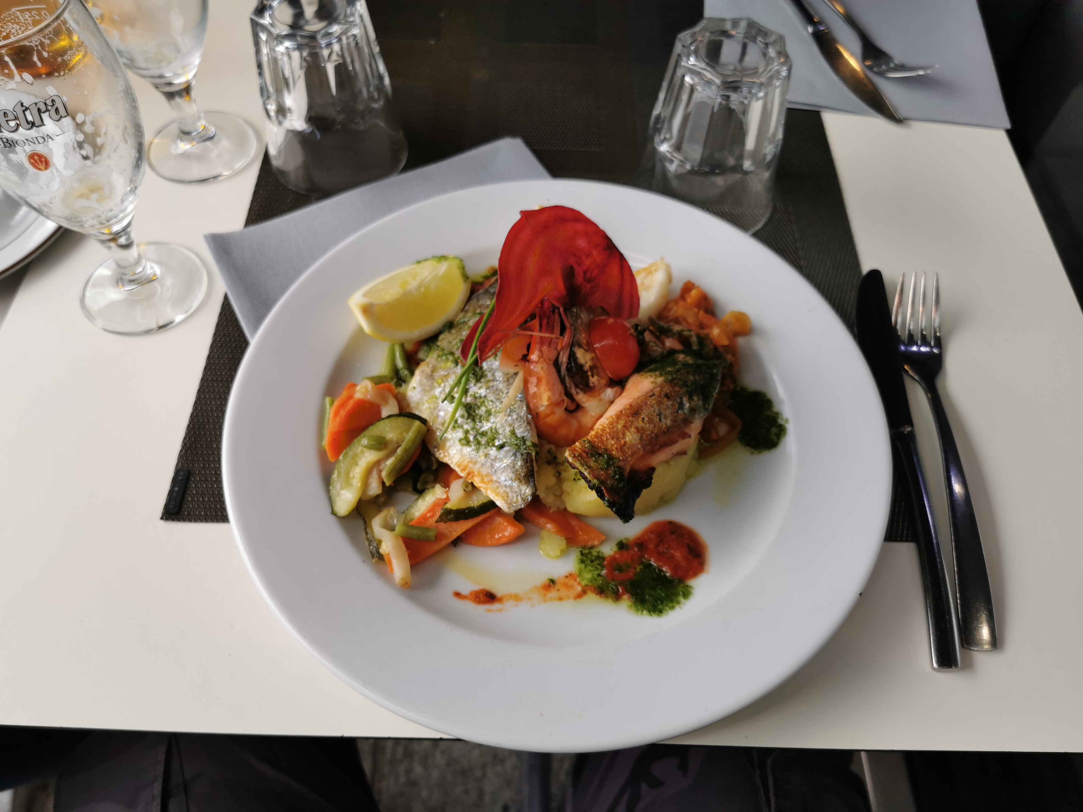 Emplacement idéal sur le vieux port, cadre très agréable, service très efficace et sympathique. (J’avoue serveur un peu lourd au niveau des blagues…) Sinon le repas était délicieux