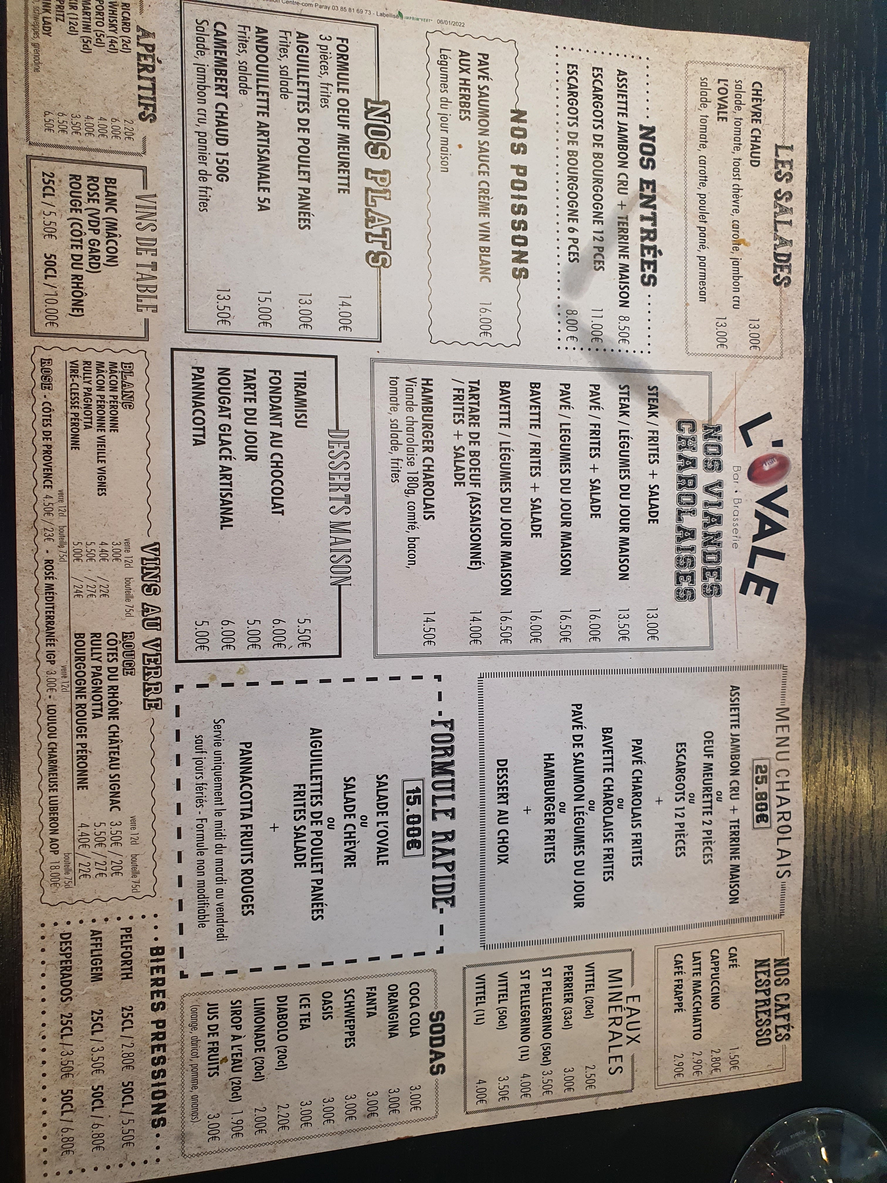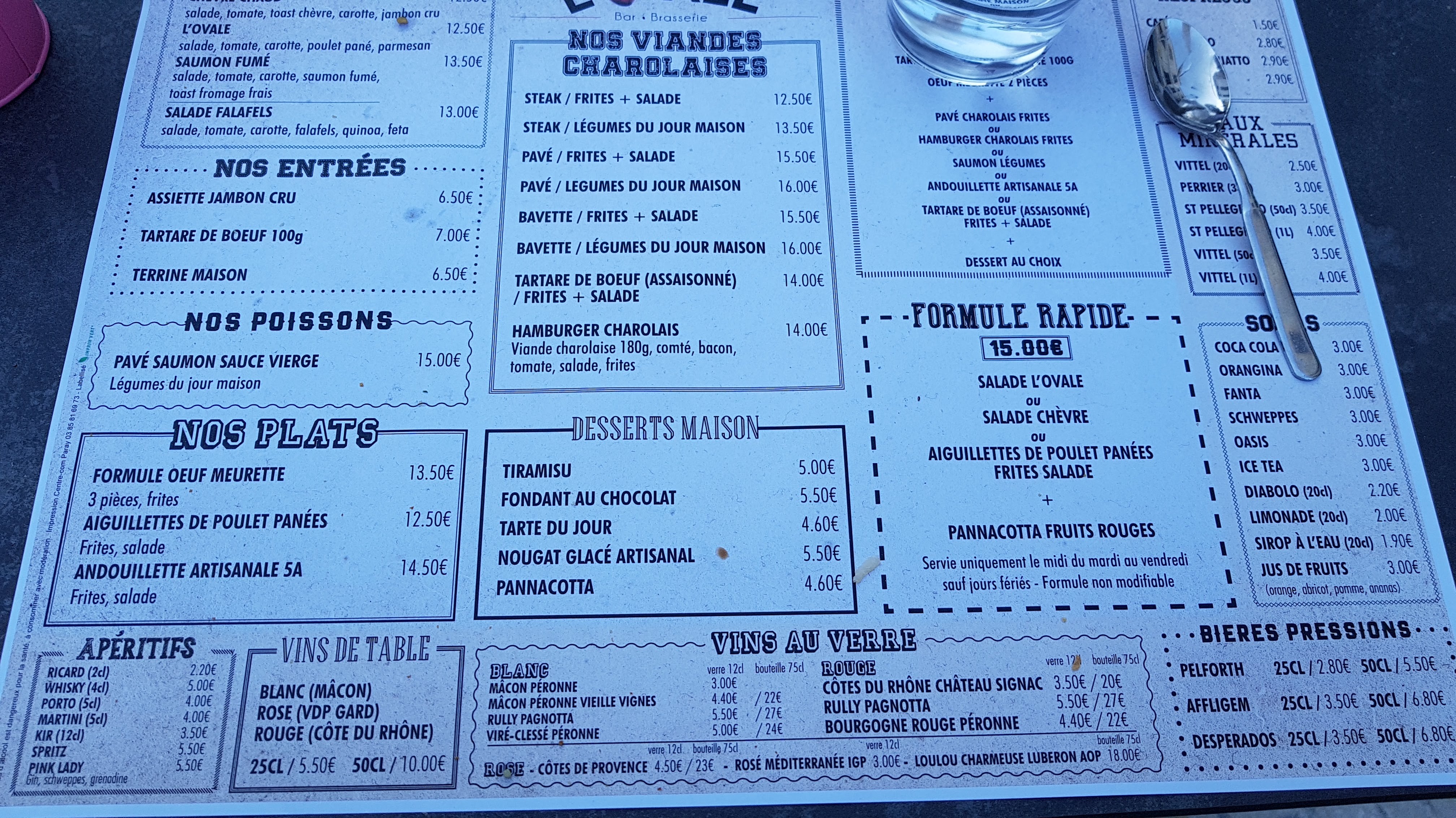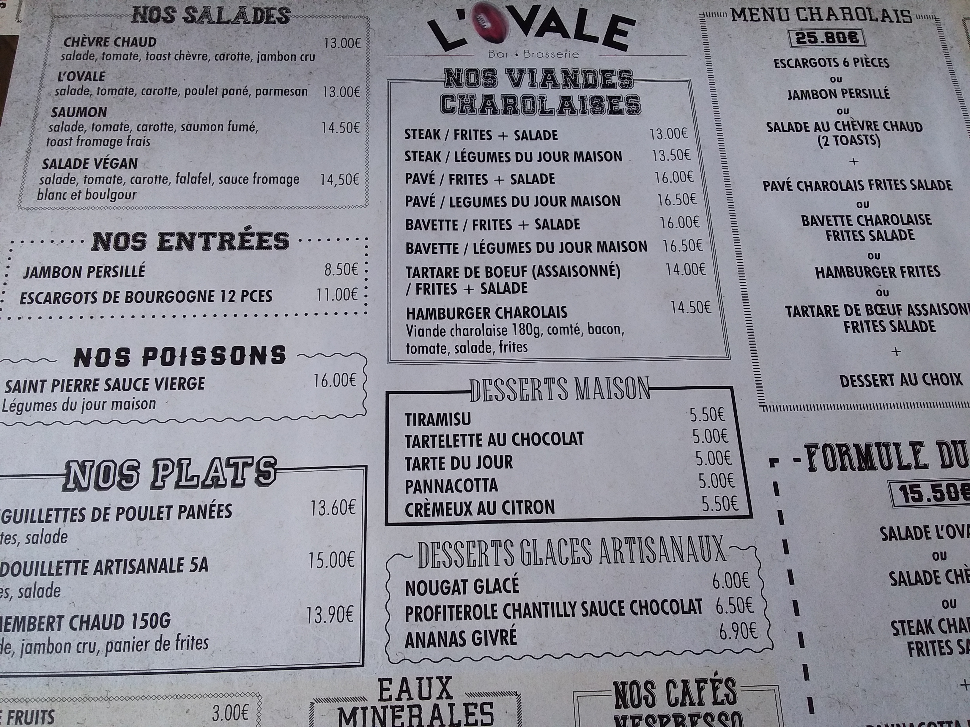 Parfait ! De passage à Paray le monial Nous essuyons deux refus de restaurateurs pour dîner car trop tard à 21h à la mi juillet !?! L'ovale, la brasserie située dans la rue piétonne nous reçoit et nous fûmes entièrement satisfaits par le service, les plats, le tartare est entre autre excellent et les desserts très bons également. Bref c'est une bonne adresse.