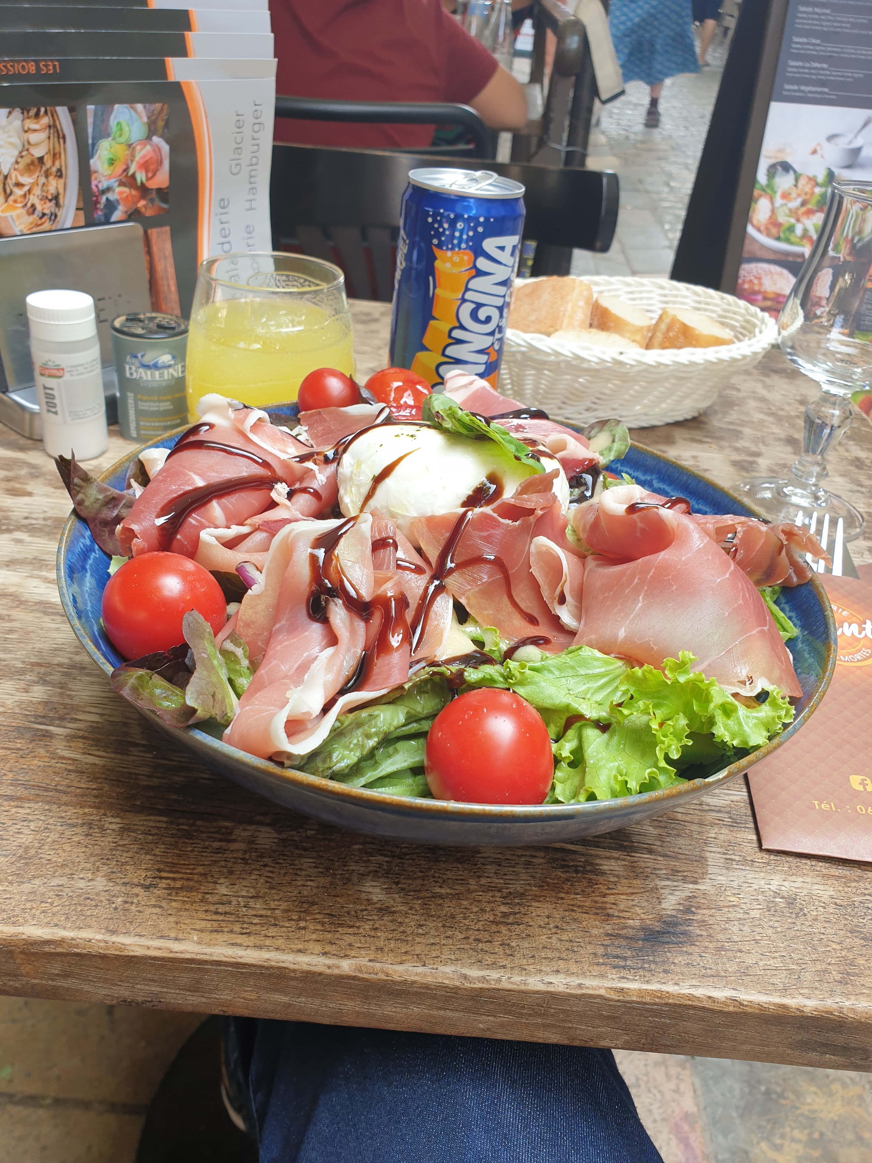 Je me suis arrêtée pour déjeuner, j'ai pris une très copieuse salade italienne avec un jambon italien de qualité, fin et servi en quantité, salade verte et tomates cerise et une burrata entière. Pour une salade plat c'était parfait et garni en conséquence. L'équipe est jeune et réactive, grande terrasse sur la place St Louis sous des parasols. Un très bon endroit pour déjeuner dans Aigues-Mortes
