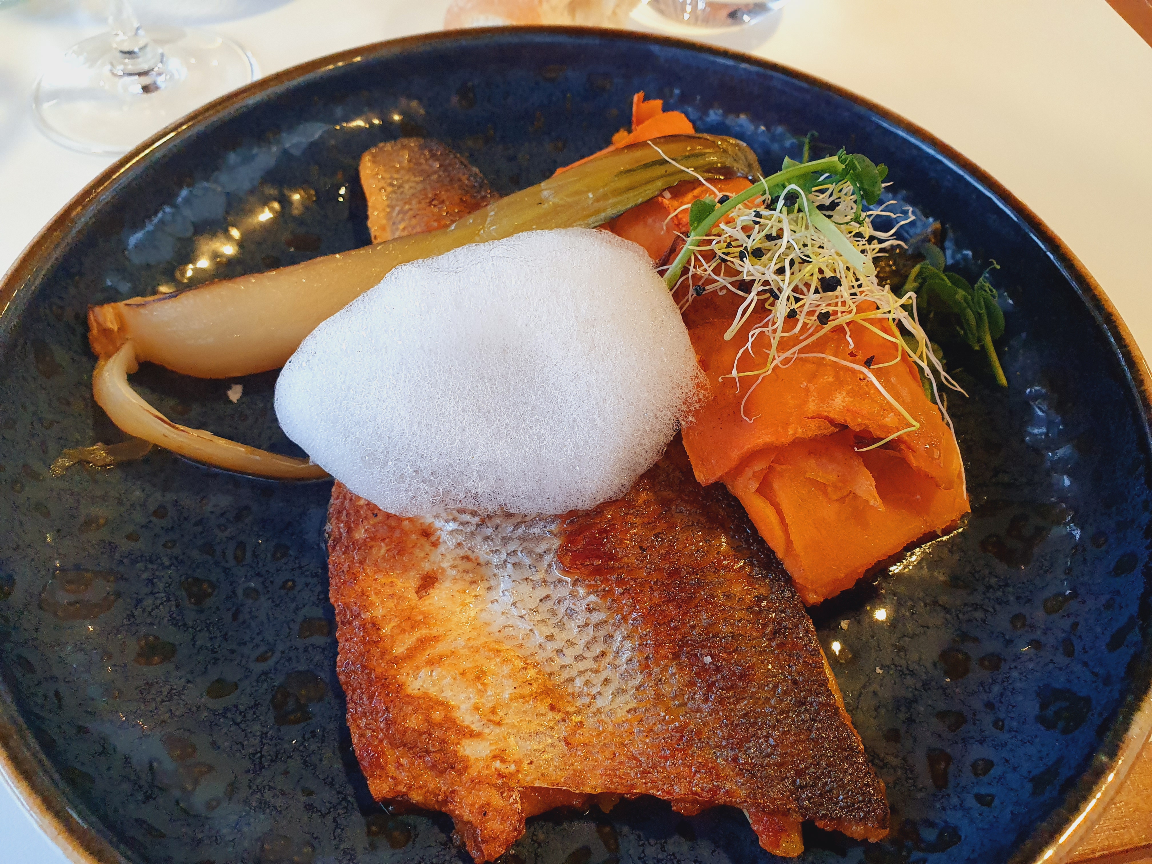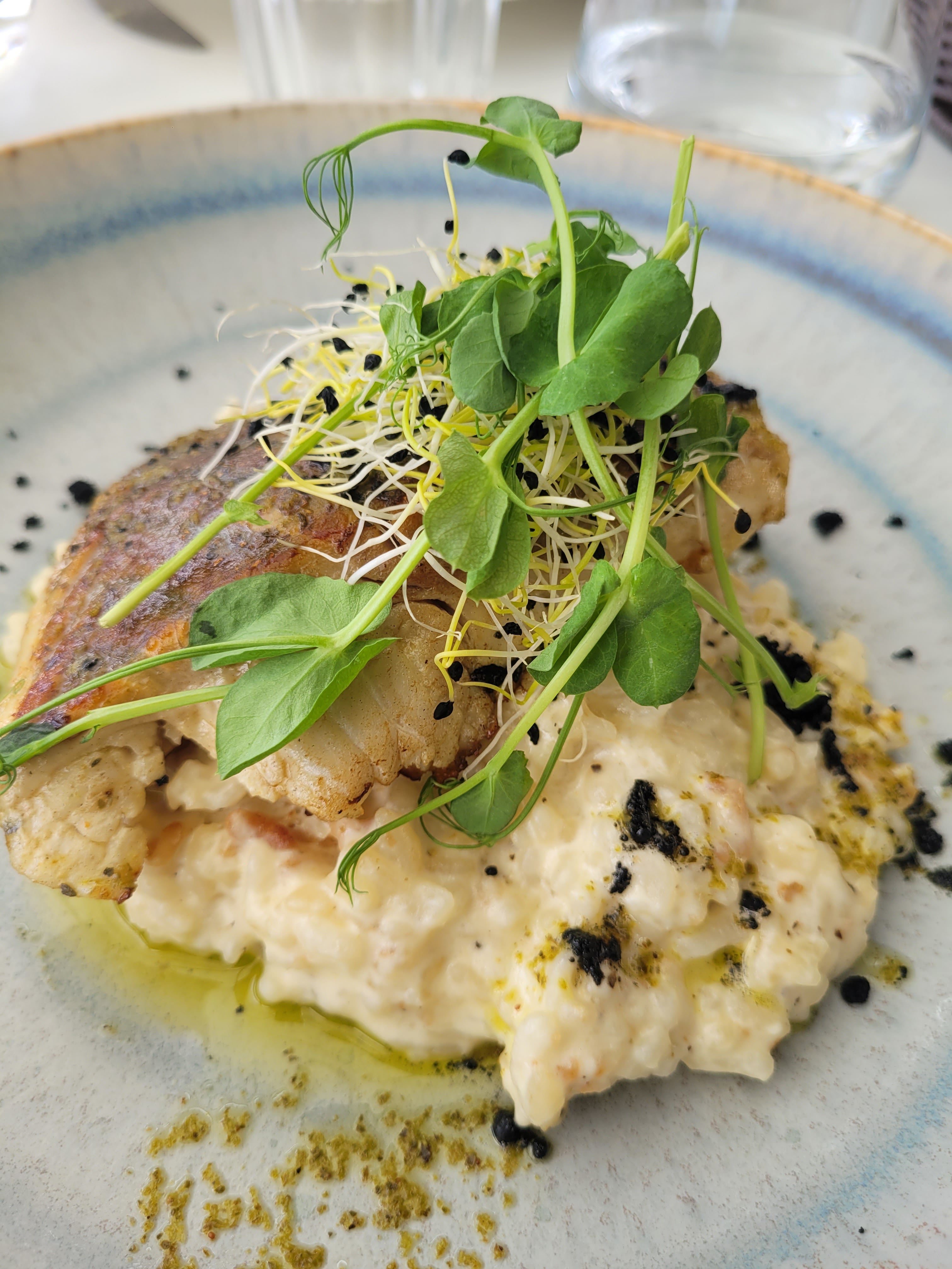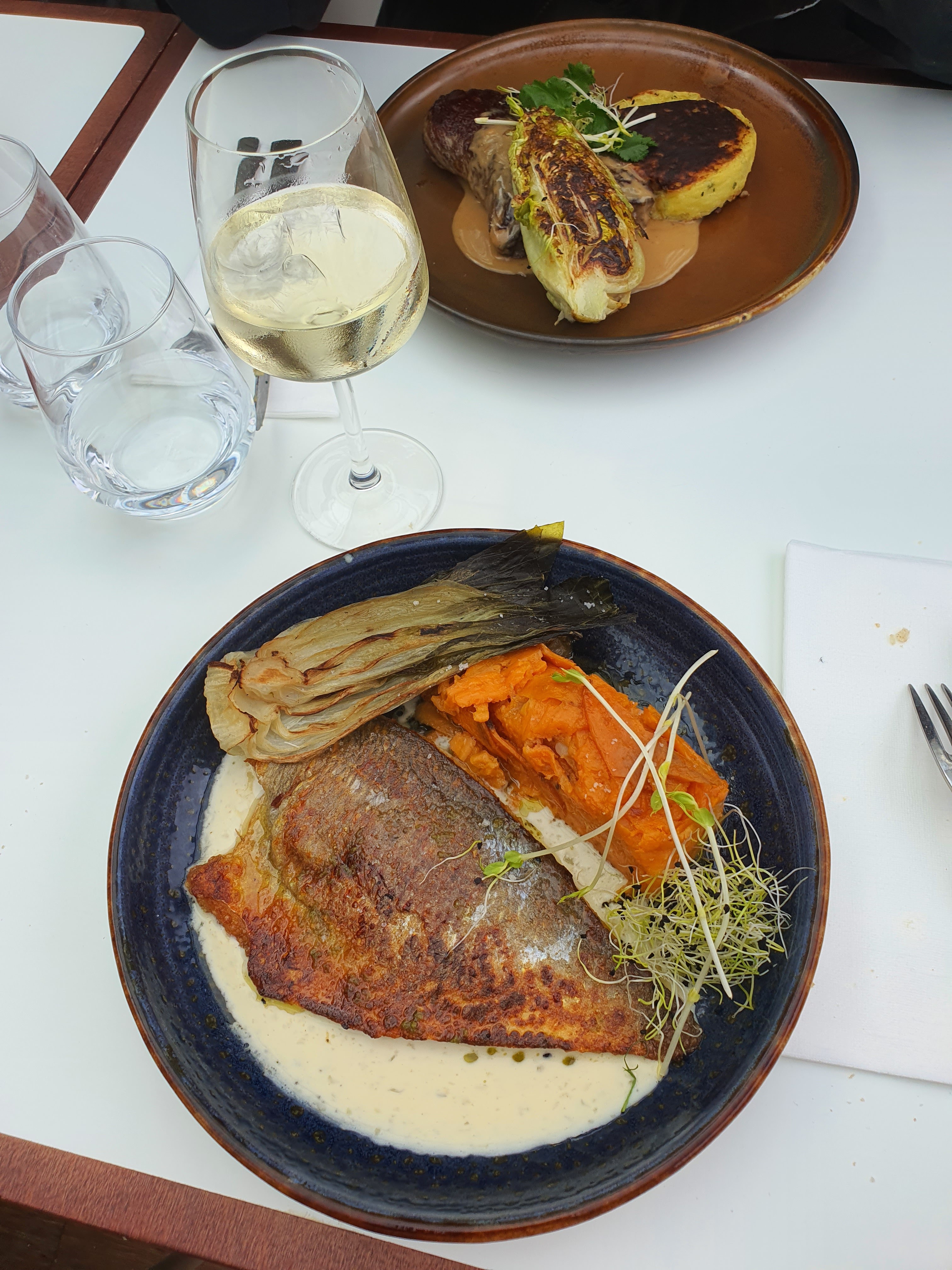 Excellent repas : esturgeon avec risotto pour moi, daurade et patate douce pour ma copine, avec une jolie vue !