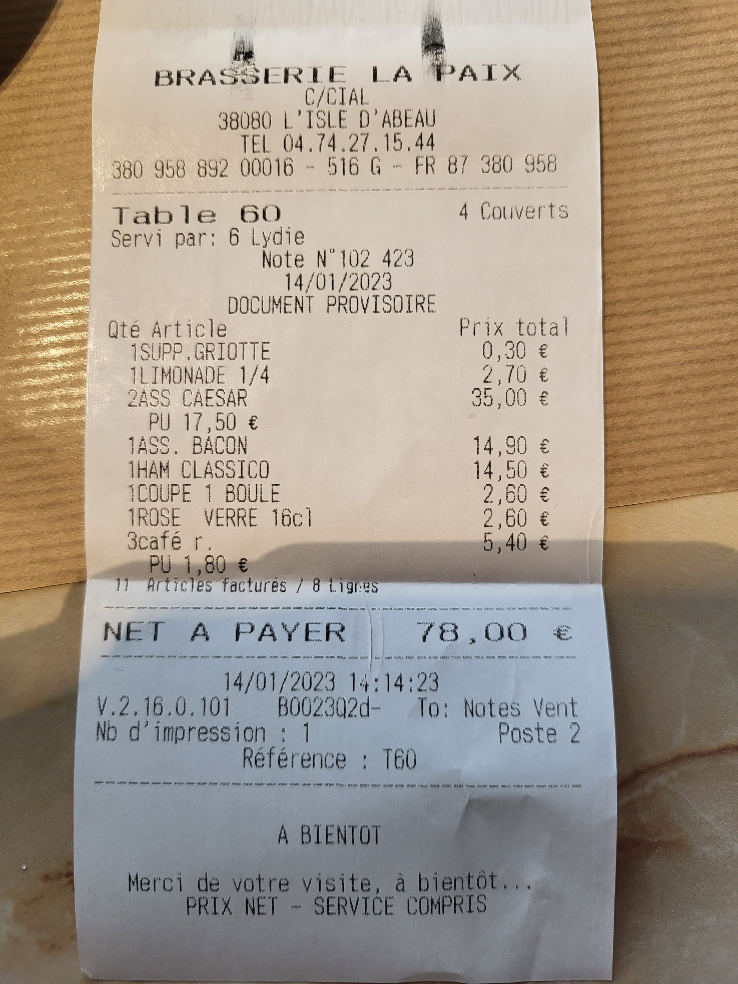 Très bon, rapide et pas excessif La salle était bien remplie cela n'a pas empêché le service d'être très rapide La serveuse aimable et très agréable On reviendra merci