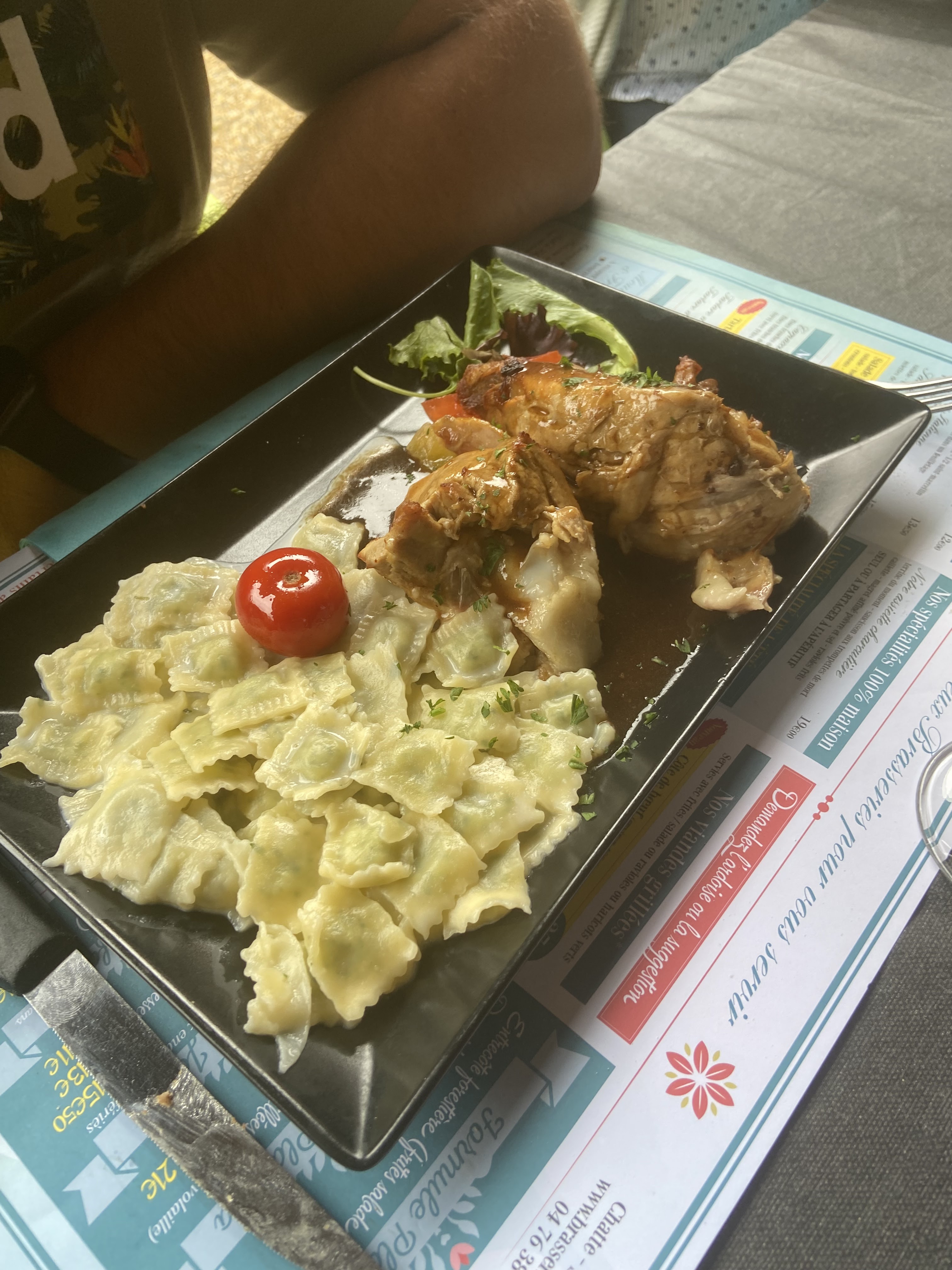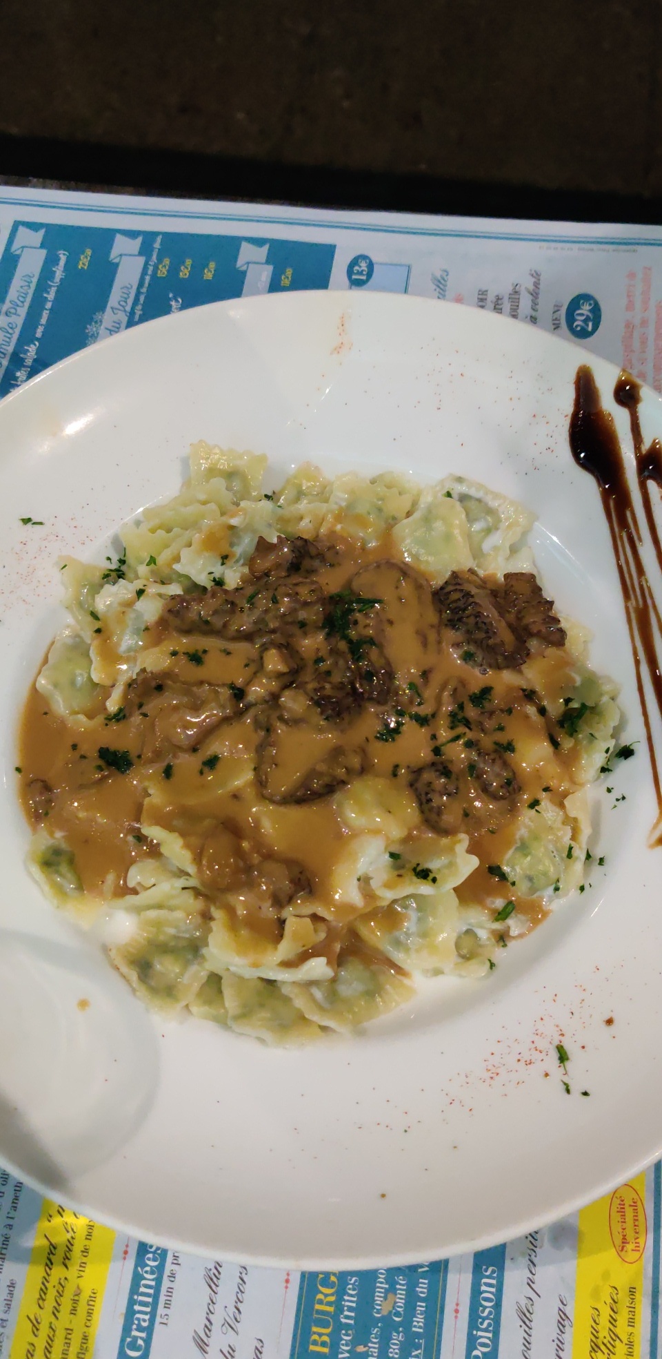 Un plat de ravioles aux morilles et un verre de rosé. Cher, ravioles et sauce au morilles sans goût et qui font mal au ventre avec 20cl de crème fraîche. 1h30 d’attente pour manger. Au moins on mange à l’extérieur.. Je ne recommande pas et n’y retournerai pas