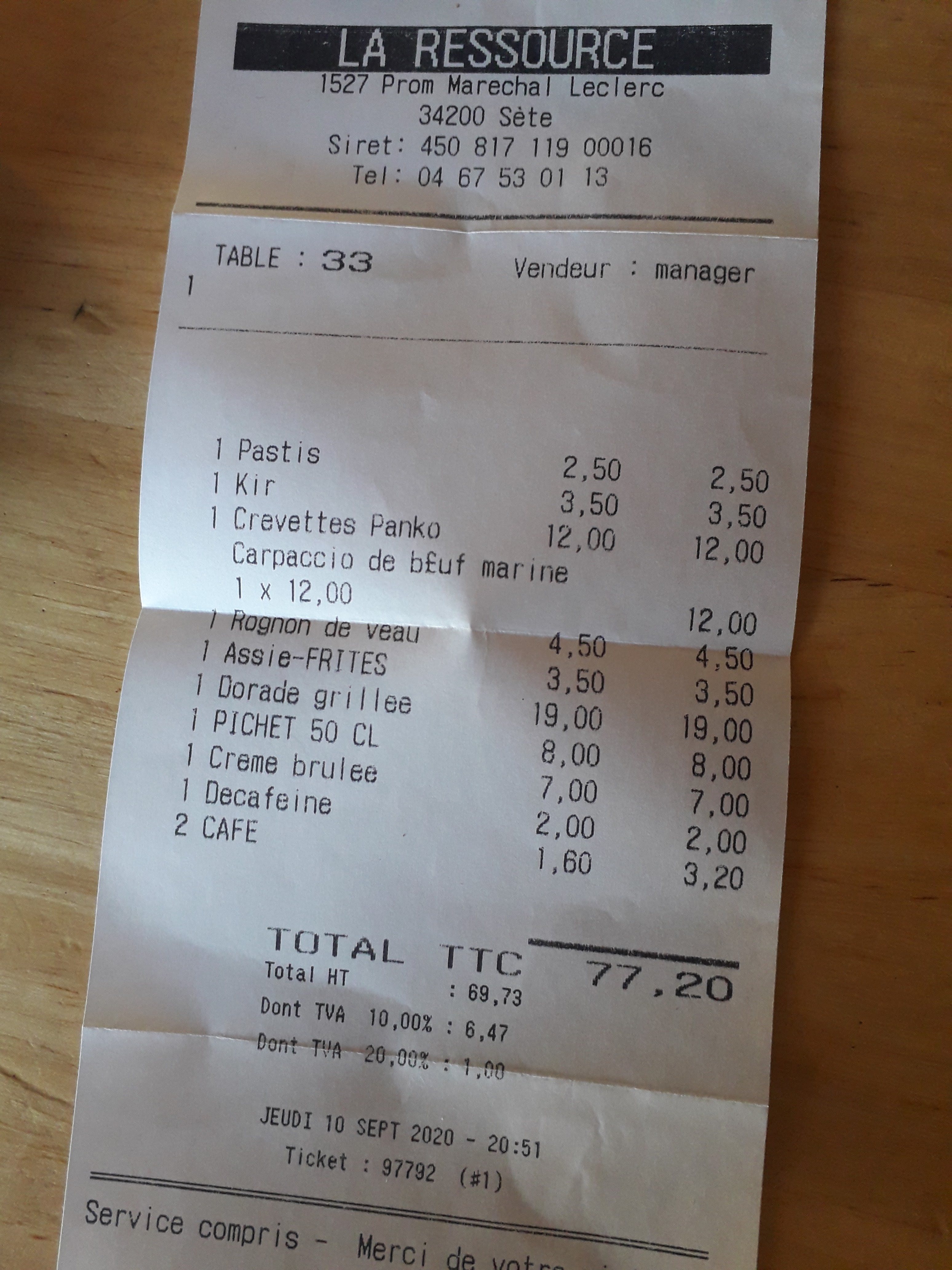 Restaurant tres bon mais les prix ne sont pas concret car a 13h30 le plat du jour est 9,90€ et a 15h00 on revient pour 2personnes on leur a conseiller le plat du jour et celui ci etait de 13€ il ne faut pas prendre les gens pour des touristes. Et on comprend l'attente pour le retour du ticket ou nous etions obliger daller le chercher au comptoir pour recuperer la monnaie.