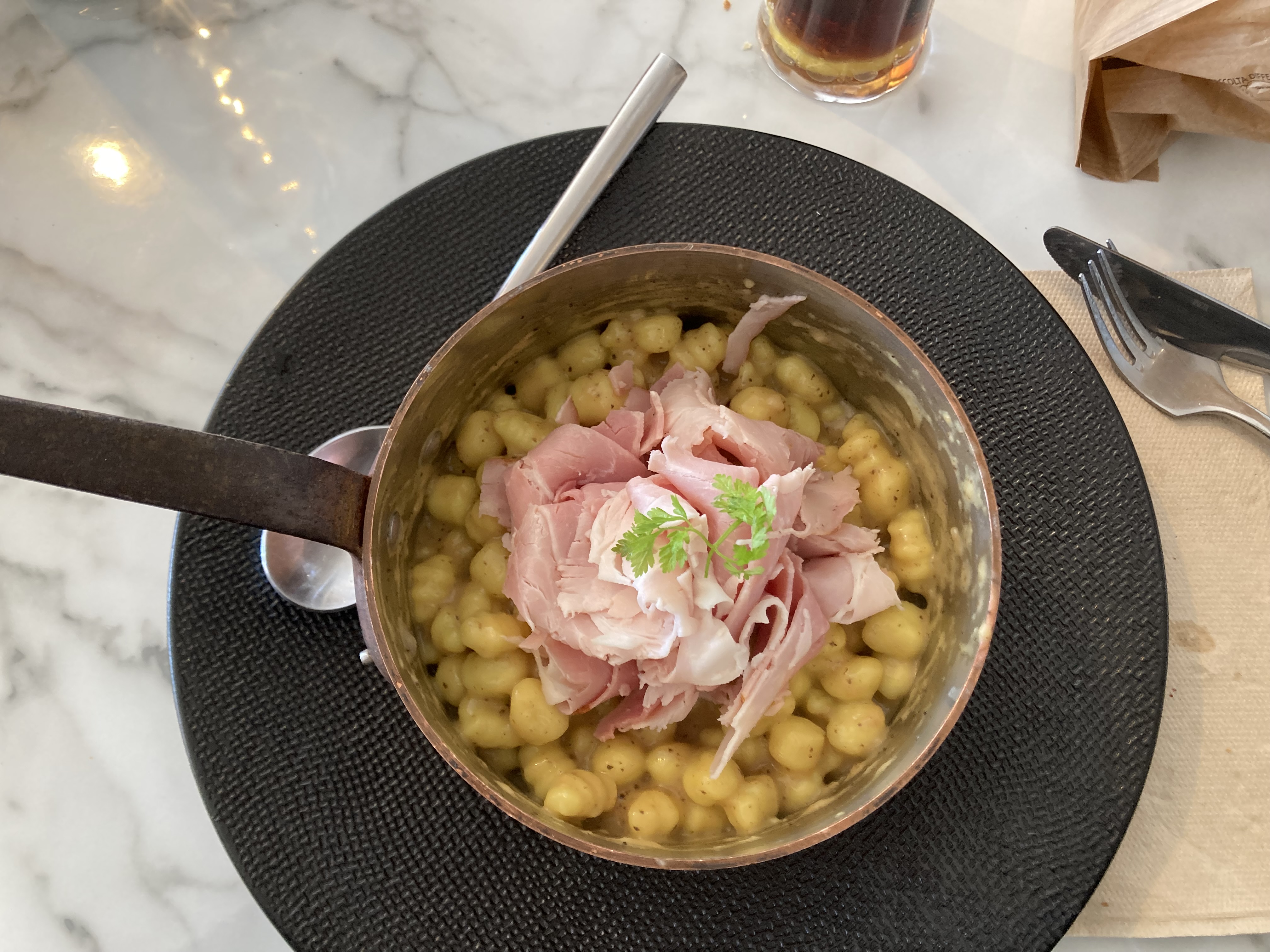 Restau très sympa avec une belle carte et un service de qualité. J'ai pris les gnocchis maison à la crème et au jambon : c'était délicieux. Présentation originale dans la casserole directement. J'ai fini avec un thé gourmand très bon également. Les profiteroles géants sont réellement gros.
