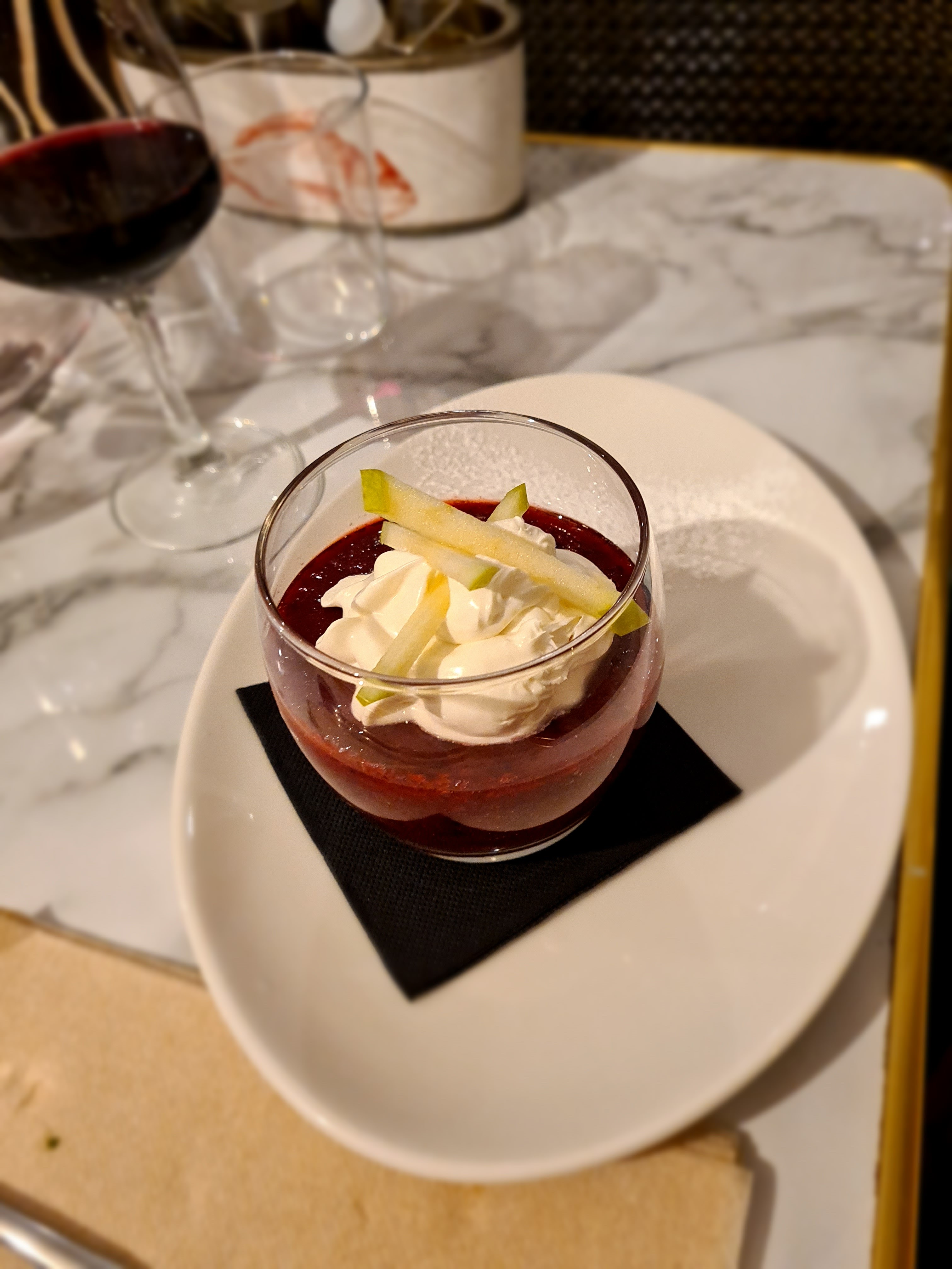 Très bon rapport qualité prix et service agréable Terrasse au soleil et abritée du mistral Vue sur le port c est top J ai oublié de prendre une photo du délicieux plat du jour (rougail saucisse) Voici le dessert de la formule : sabayon de fruits rouges . Délicieux