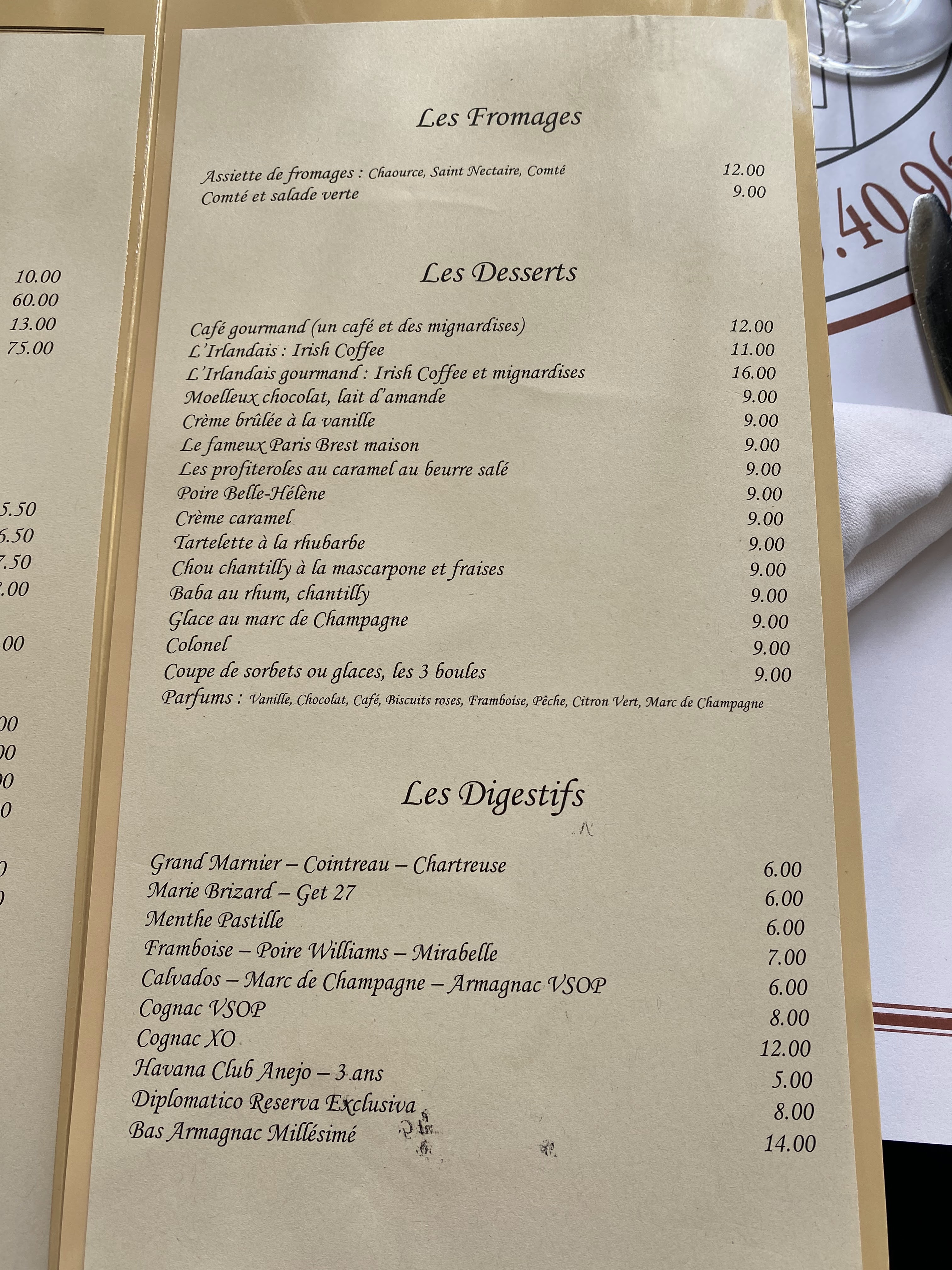 Aujourd’hui avec mes clients, nous avons décidé de connaître cet restaurant… mais on a parti très déçu. Pour le menu: la terrine de lapin, assez dure; le poisson avec des carottes, était très chaud, on ne pouvais même pas mètre en bouche et sans goût. Trop cuite ou peut-être réchauffé. Bref, dur dur dur. Le riz au lait, semblait comme une soupe. Du lait en état liquide avec des riz que flottaient dans le assiette. Sincèrement, triste de voir une maison avec tradition arriver à ce point.