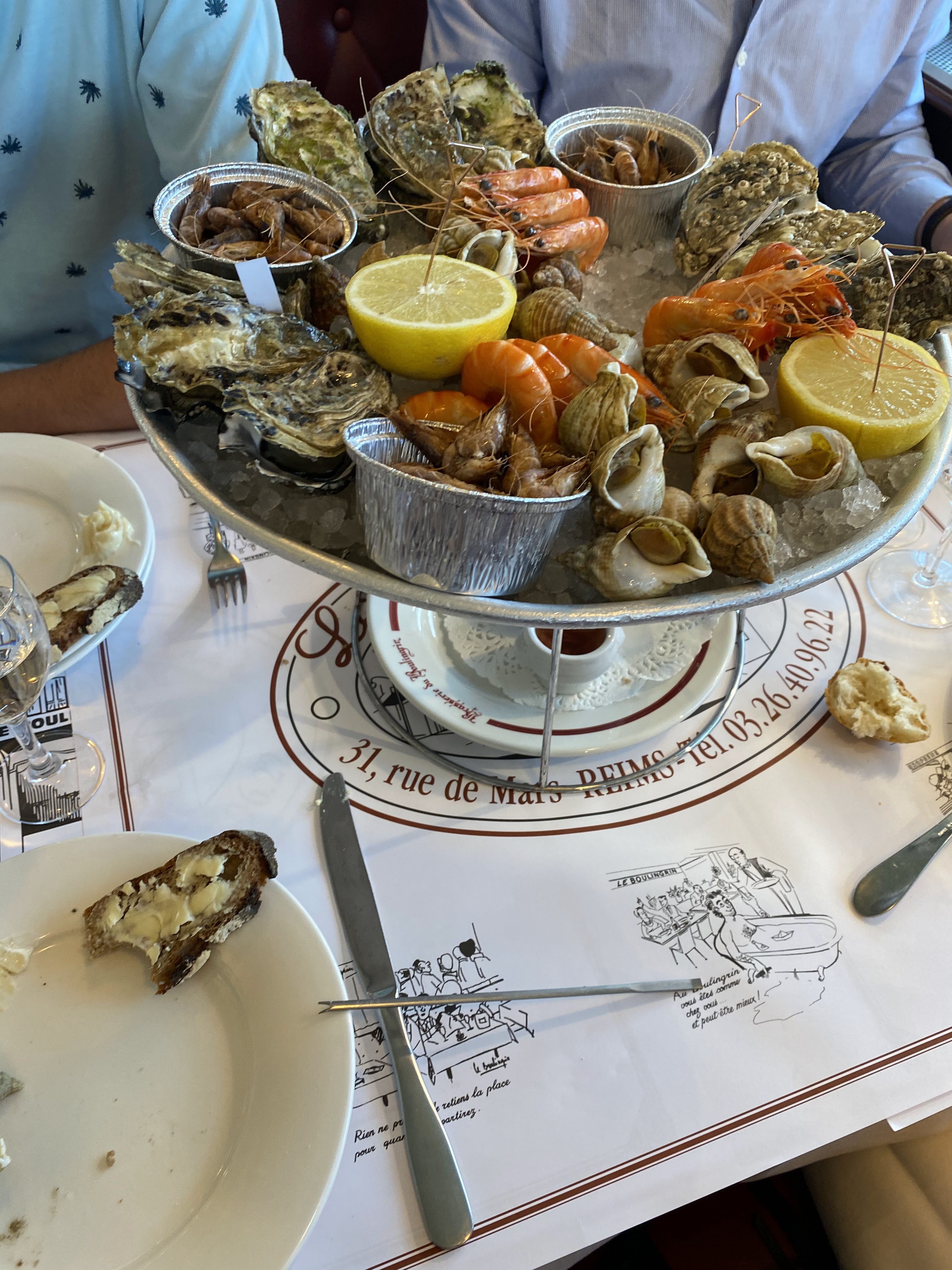 Une institution incontournable à Reims : accueil excellent, au petit soin, serviable, très aimable, efficace et discret et hyper professionnel. Rien n est laissé au hasard. L assiette de fruits de mer est d une fraîcheur irréprochable, aucune coquille laissée dans les huîtres (choix dans les provenances), mayonnaise maison... très bonne carte de vin. Le Paris Brest délicieux également. A ne pas manquer pour les touristes étrangers en escale à Reims pour déguster des spécialités françaises. Et pour les rémois à noter dans son carnet d adresse. Un seul regret : ne pas avoir pu dire en direct les louanges du service à notre serveur qui est parti avant la note. Dommage. J espère qu il lira le post ! Nous reviendrons dans tous les cas.