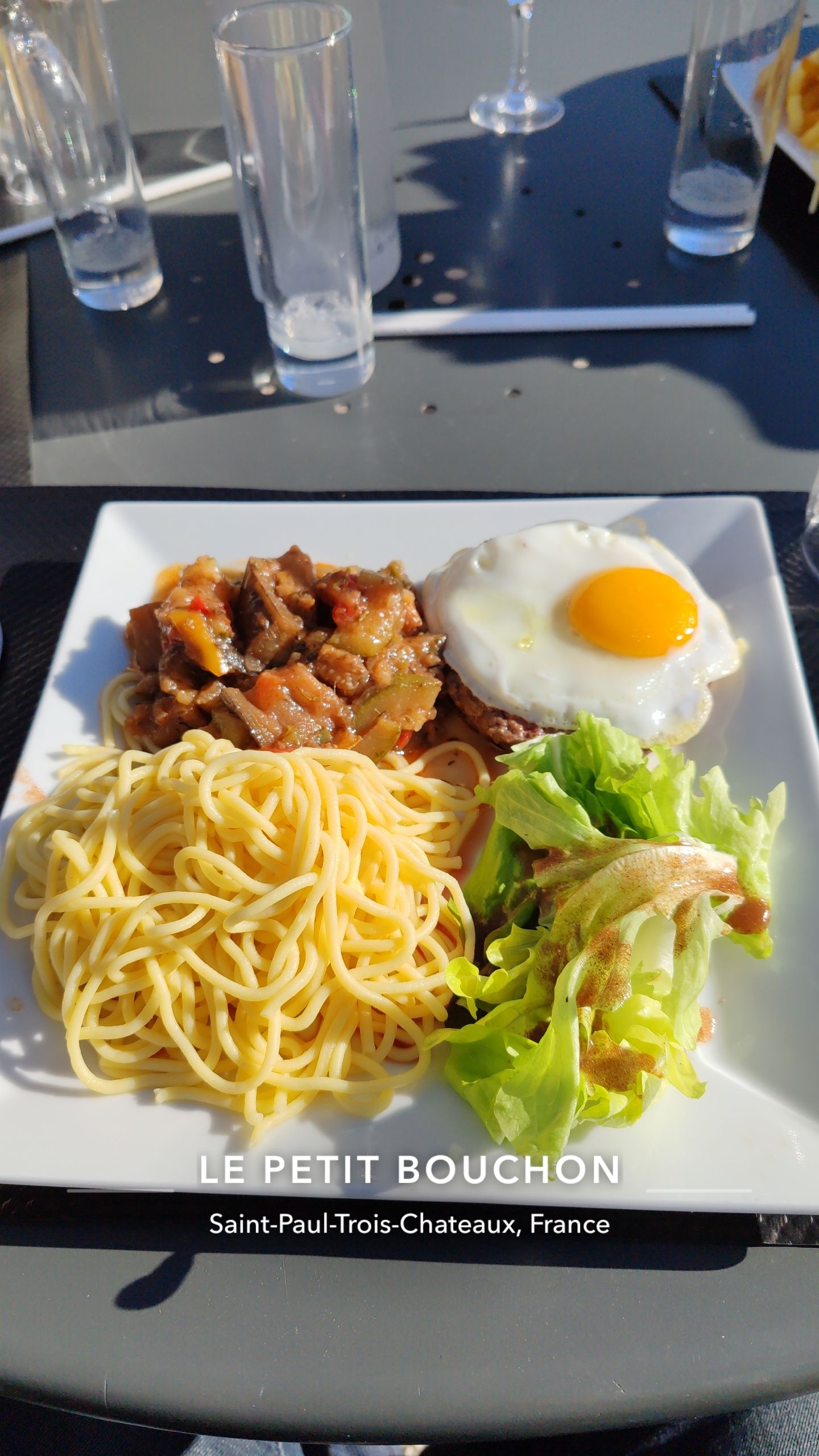 Super brasserie, les plats sont bon, bien servie et pas très chère. Serveuse agréable est souriante. Je recommande. (Photo : steak à cheval, ratatouille, patte, salade.)