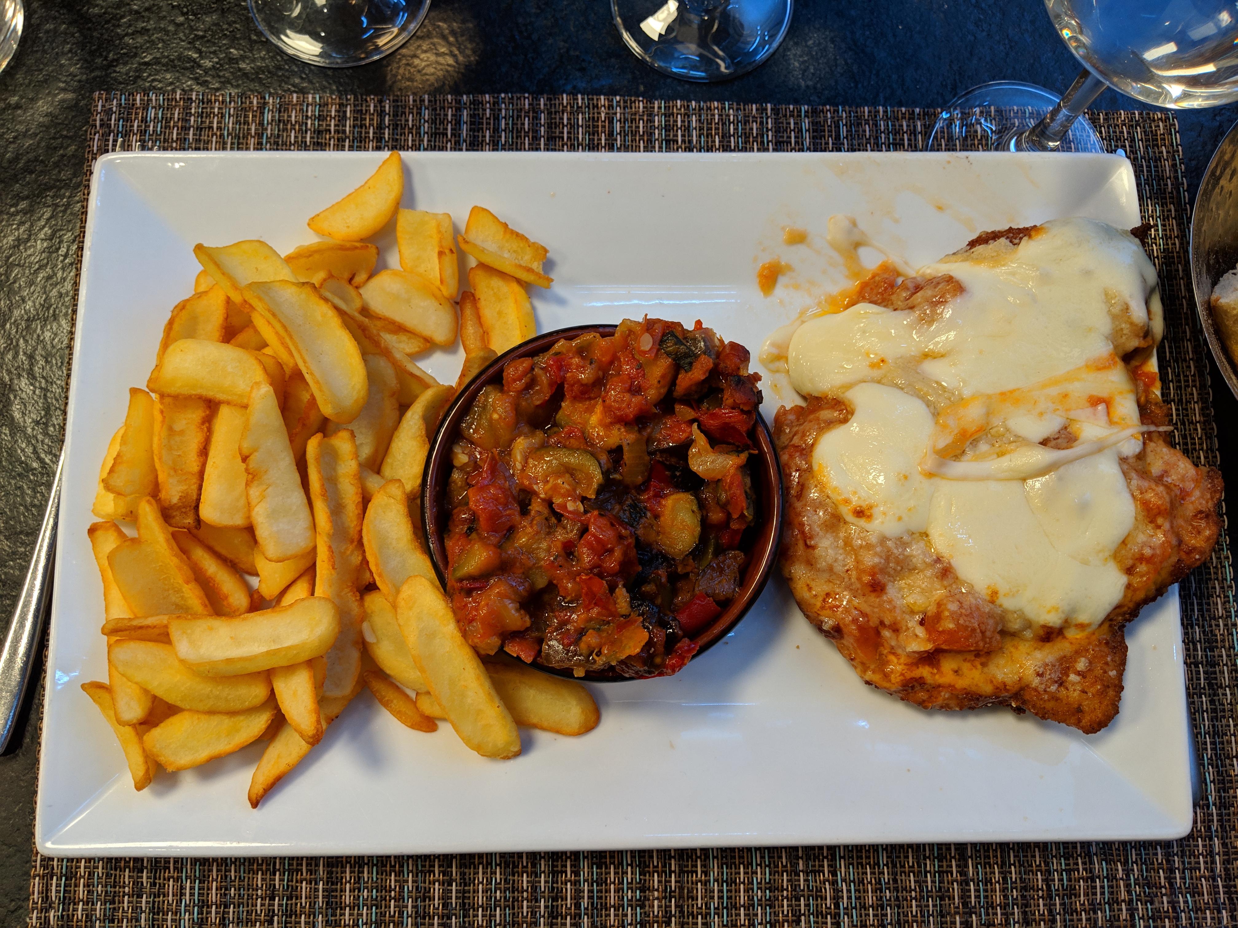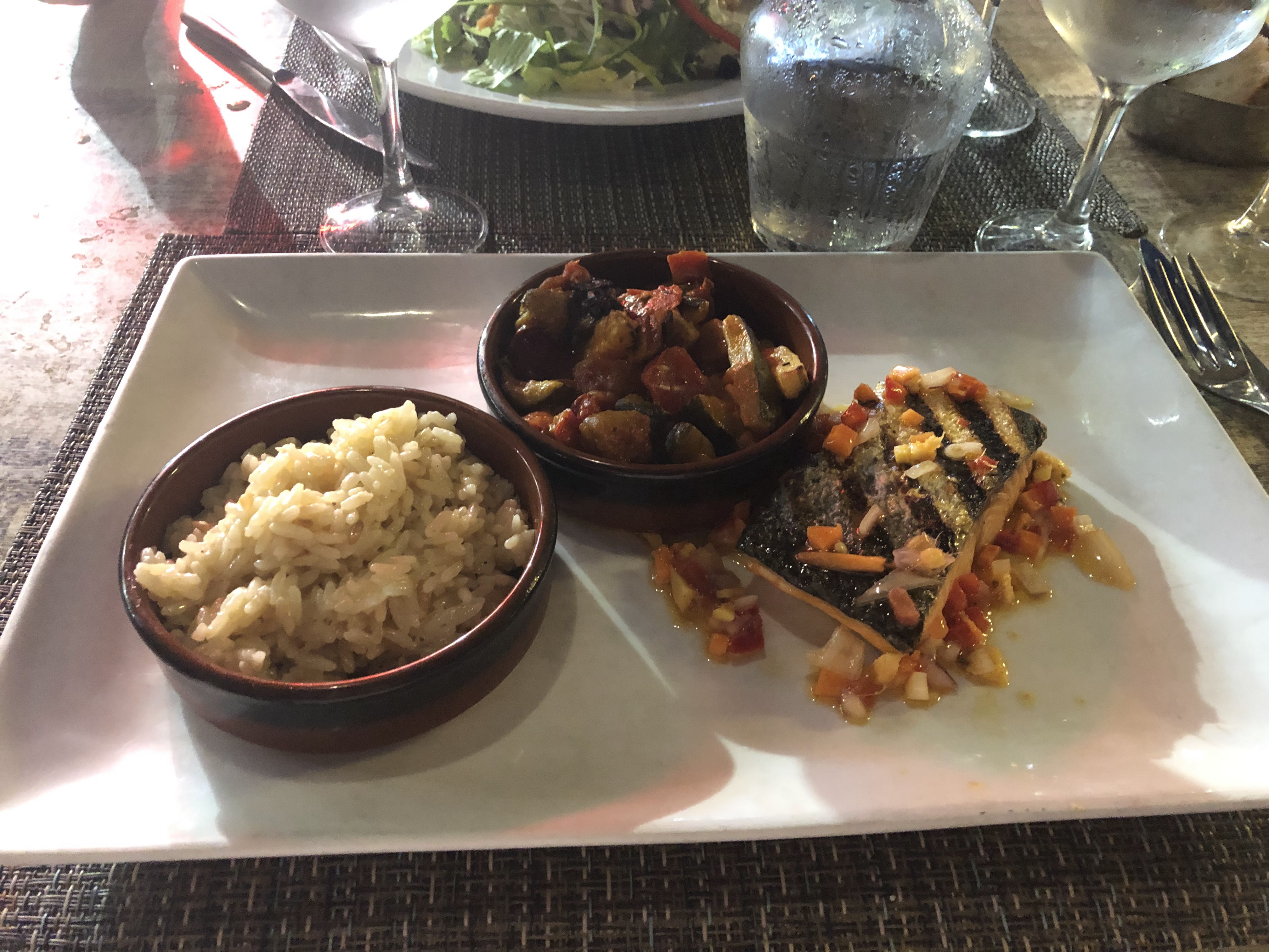 Il est décevant, voire franchement horrible, de prendre une réservation pour une table particulière et de ne pas la rendre disponible 10 minutes plus tard. Avec la mobilité limitée de nos amis avec qui nous espérions partager un déjeuner convivial, l'option alors proposée d'être transférés à l'étage n'était pas une solution. Au lieu de cela, nous nous sommes retrouvés dehors à une table préparée à la hâte. Ma femme et moi commandons la longe de morue. Ceci est venu avec du riz et une bonne ratatouille. La longe de morue était cependant bien sous-cuite. Vraiment généralement médiocre.