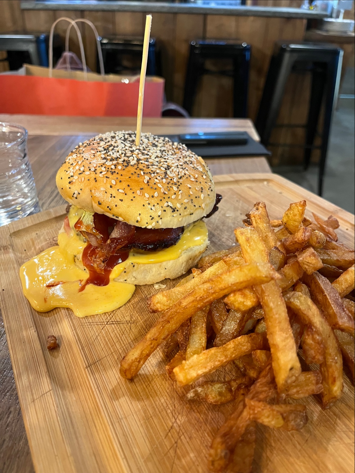 Très bonne nourriture et à un prix raisonnable (pour Val), le smash burger est honnêtement l'un des meilleurs que j'ai eu. Le service était très rapide, nous étions entrés et sortis en 50 minutes (table de 8), ce qui étant donné sa mi-parcours était impressionnant, voire un peu trop rapide. Le personnel était sympathique et arrangeant. J'y retournerais sans hésiter et s'il n'y avait pas une légère confusion sur les boissons (et elles sont toujours sur la facture à la fin), c'est facilement un endroit 5 étoiles !