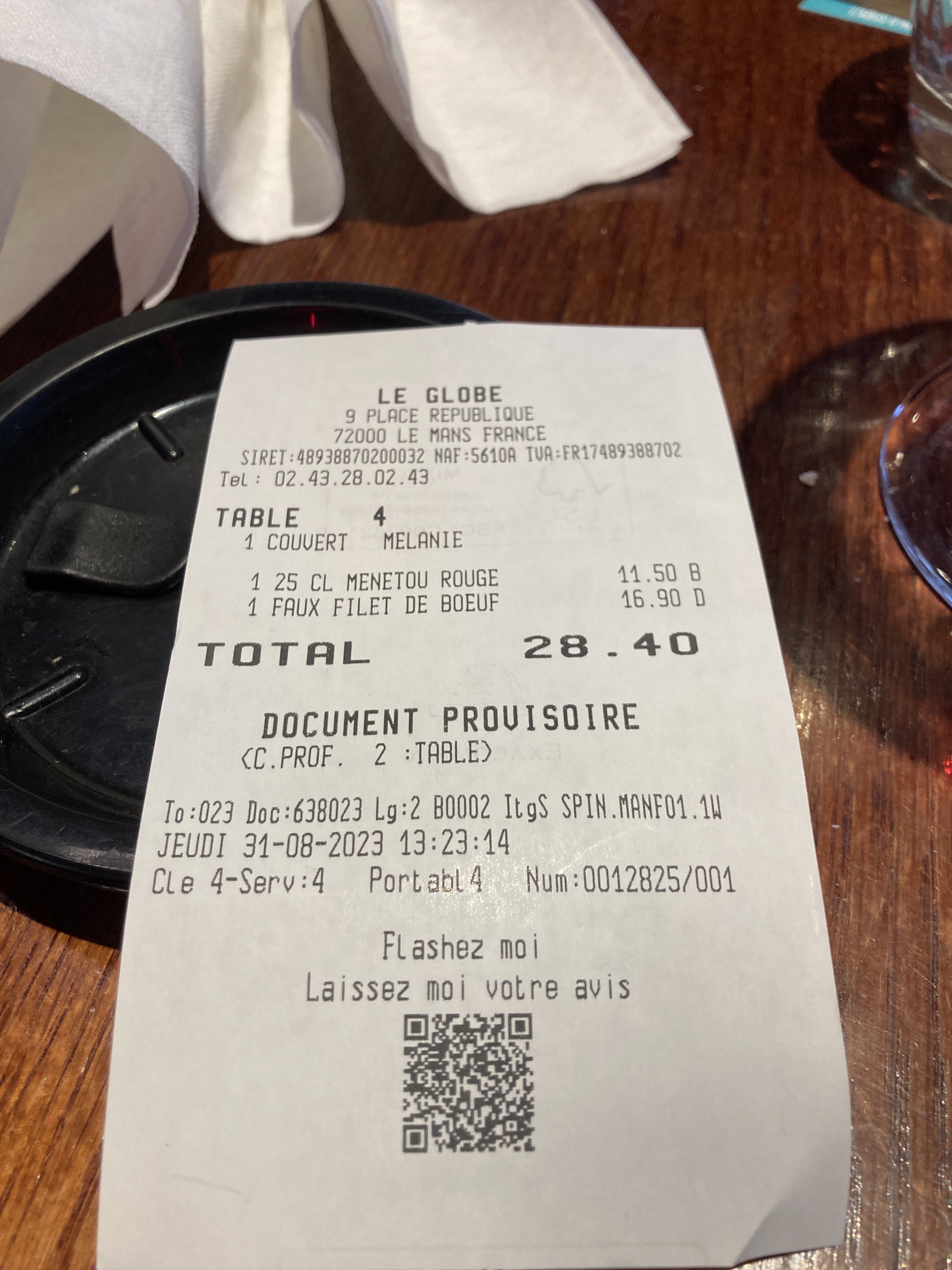Service laissant à désirer Note arrivée avant la fin du repas Prix exorbitant d un pichet ( 46€ le litre ) Client depuis plus de 30 ans: je n’avais jamais vu ça Je ne reviendrais plus