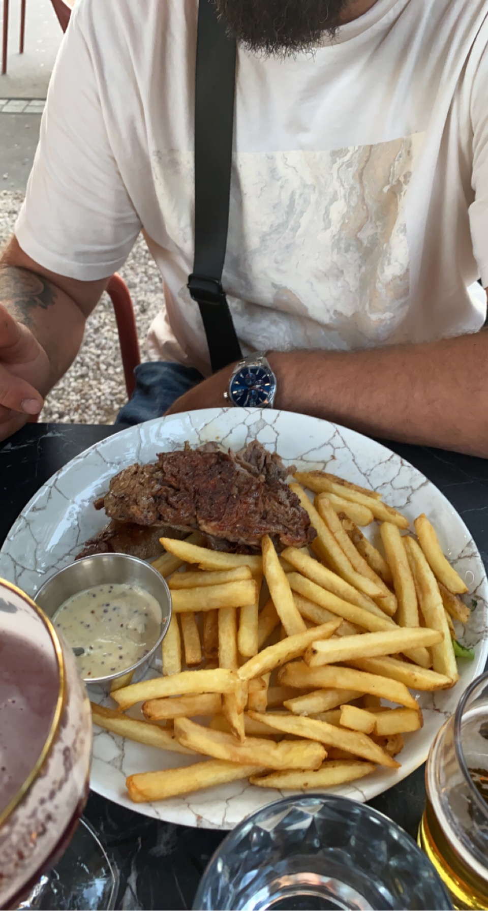 On demande une table pour 3 personnes. On nous installe dehors, puis après avoir donner commande les problèmes arrivent. Apéro : au moins 20-30 mins d'attente (une bière, un jus pressé et 2 bouteilles d'eau), (je voyais le plateau sur le bar mon jus de fruit pressé qui était déjà biphasé. A deux doigts d'aller chercher le plateau, des serveurs passaient devant et même pas ils le servent) Une fois l'apéro servi le plat arrive 2 mins après voir même en même temps. Une très mauvaise gestion, c'est une catastrophe. Les serveurs ne sont pas spécialement désagréable mais pas organisé, ça brasse du vent. Pour la cuisine, ce qui avait dans la l'assiette était convenable après je fais la même chose chez moi... Mais les personnes qui m'accompagnait on trouvé ça bon. Donc bon ça dépend de l'attente de chacun.