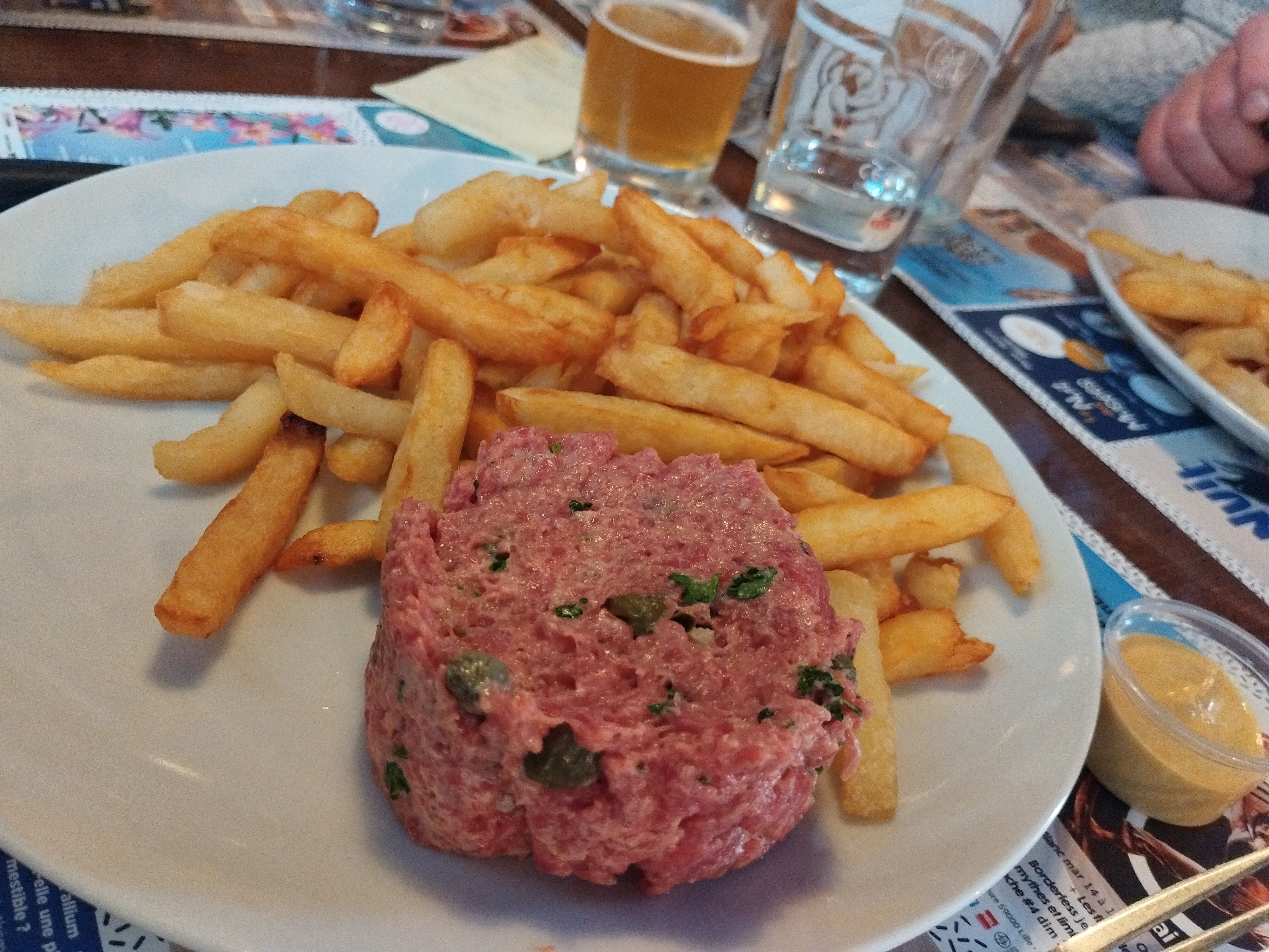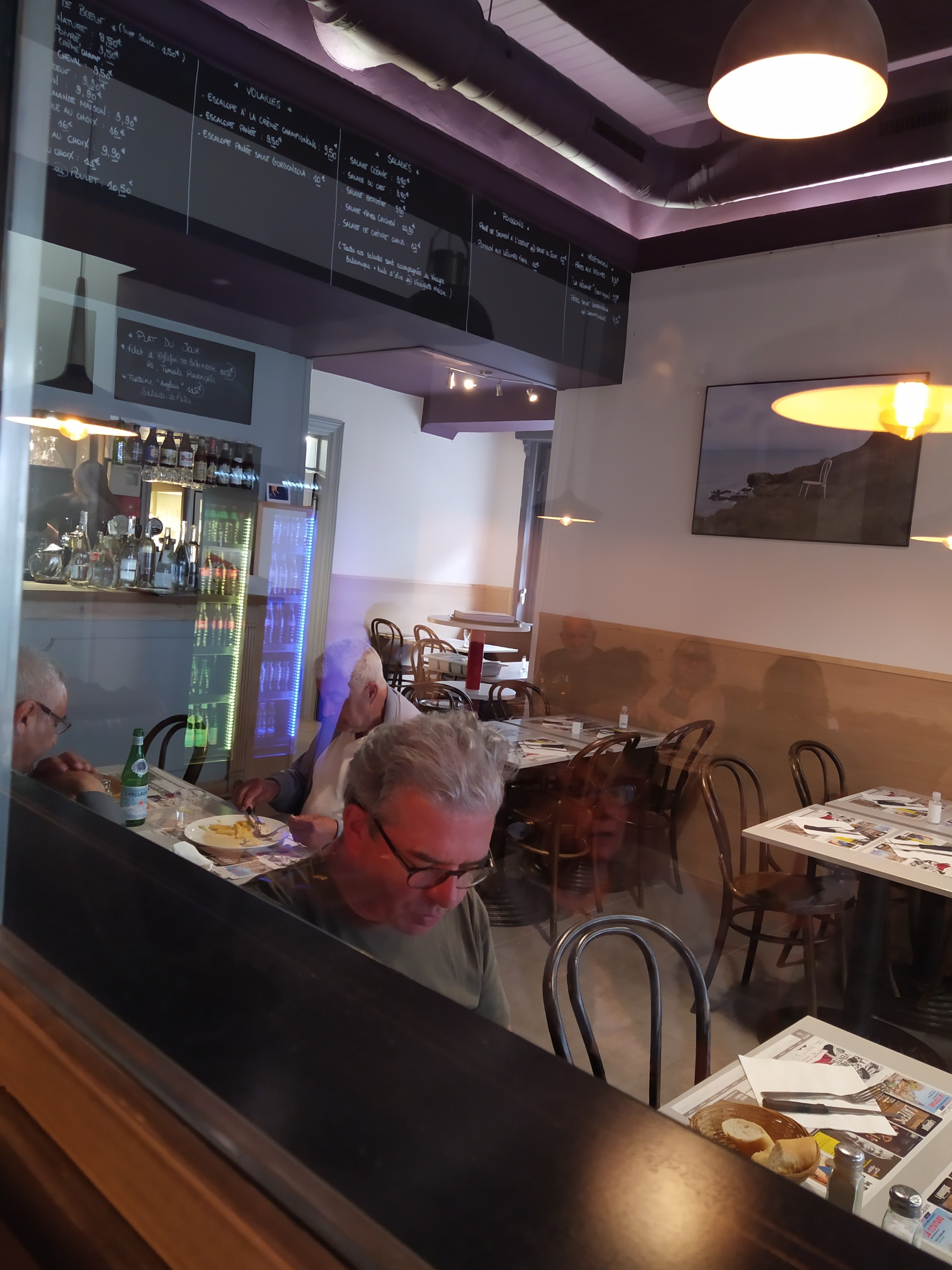 Je suis venue pour manger sur le pouce avec ma mère et ma tante, c'était un des seuls restaurants ouverts du coin un samedi midi et nous n'avons pas regretté notre choix. Deux plats du jour proposés ce jour là : tartare de boeuf ou dos de cabillaud sauce béarnaise avec riz et chou. Selon les dires des serveurs, tout est fait maison. Le personnel est super souriant et sympathique ! On a passé un bon moment. Nous nous sommes régalées. Le chou était super bon, le poisson bien cuit et les frites très bonnes. Seuls petits bémols : à notre arrivée nous n'avions pas eu de cartes / menus (je ne sais pas si c'est normal), alors nous avons dû nous lever regarder le menu affiché en haut du bar pour nous décider, et la sauce béarnaise était un peu trop rallongée à l'eau, mais elle restait tout de même bonne. Je recommande les yeux fermés ! Les prix sont raisonnables et beaucoup de garnitures proposées (riz, pdt vapeur, frites,...).