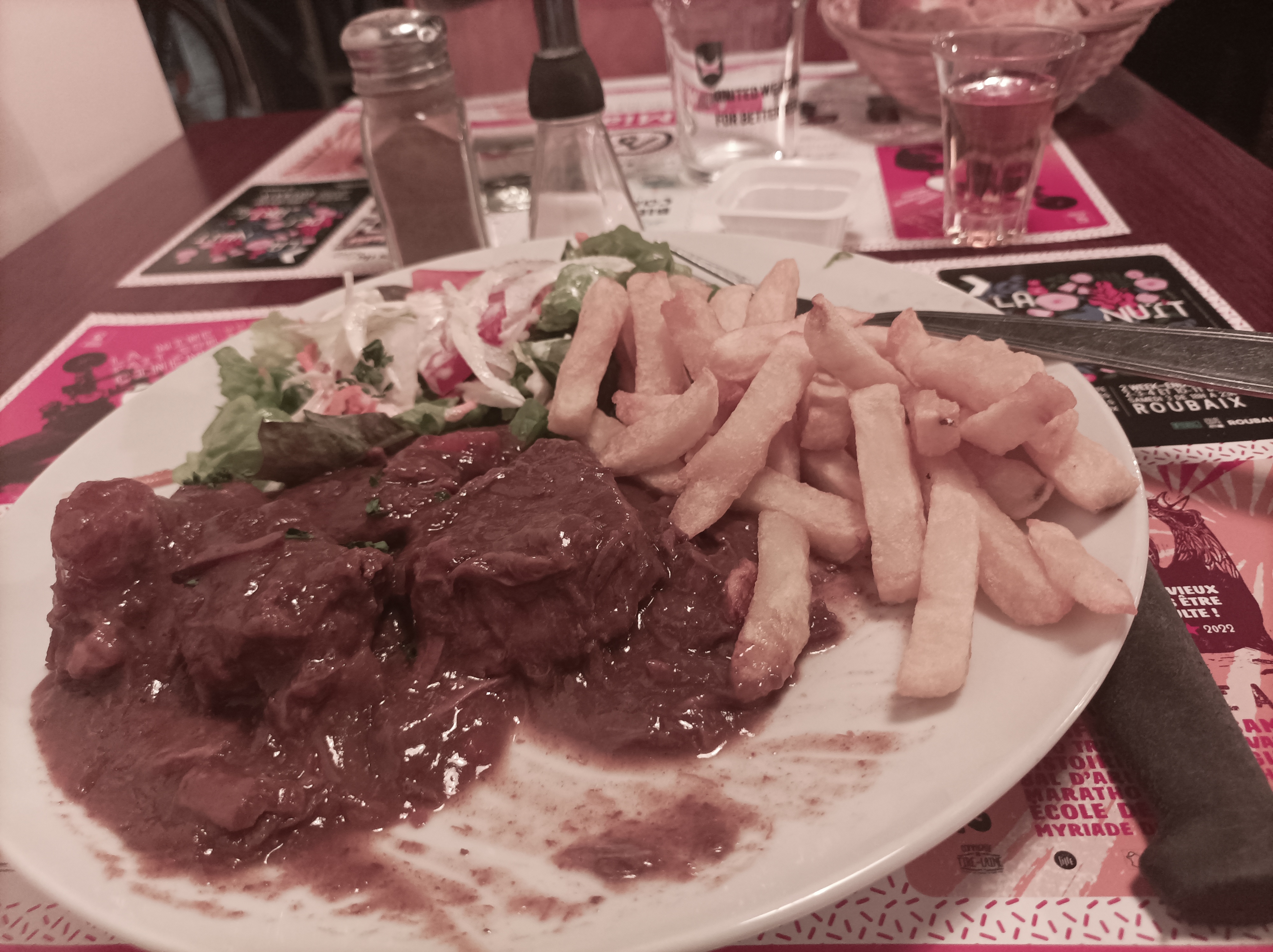 Oh moi je ne cuisine pas mais là, la carbonade est fondante est délicieuse. Les frites sont juste dorées comme il faut, pas grasses (ya du sel et du poivre mais j'en prends jamais). Le serveur est super cool et il sait jouer avec les clients et comprendre ce qu'ils ont besoin (du rhum, sans glace Aye! Aye!). Aux p'tits soins pour les détails du menus, accompagnements (je parle de la boisson) et attentifs aux attentes de chacun.