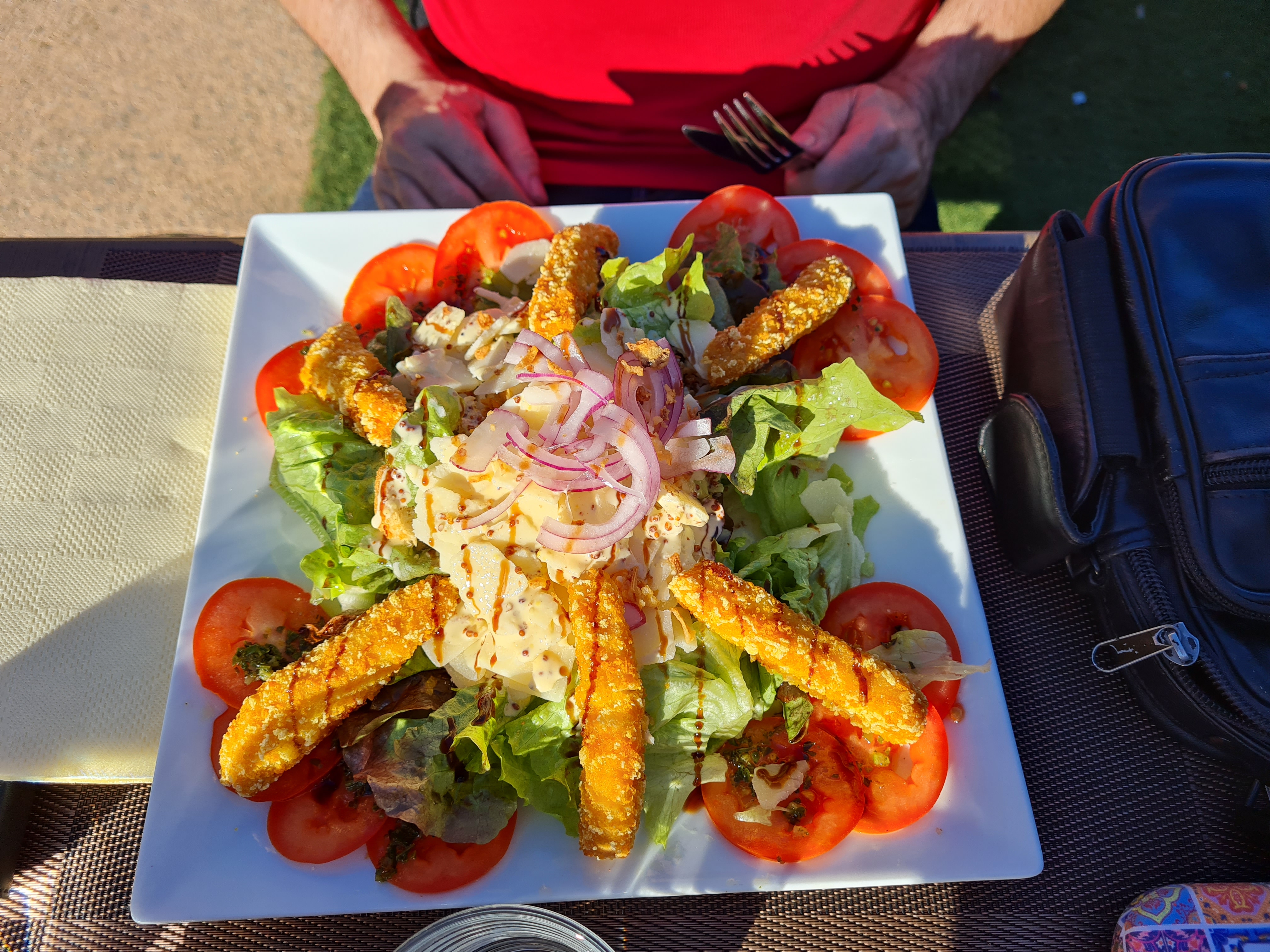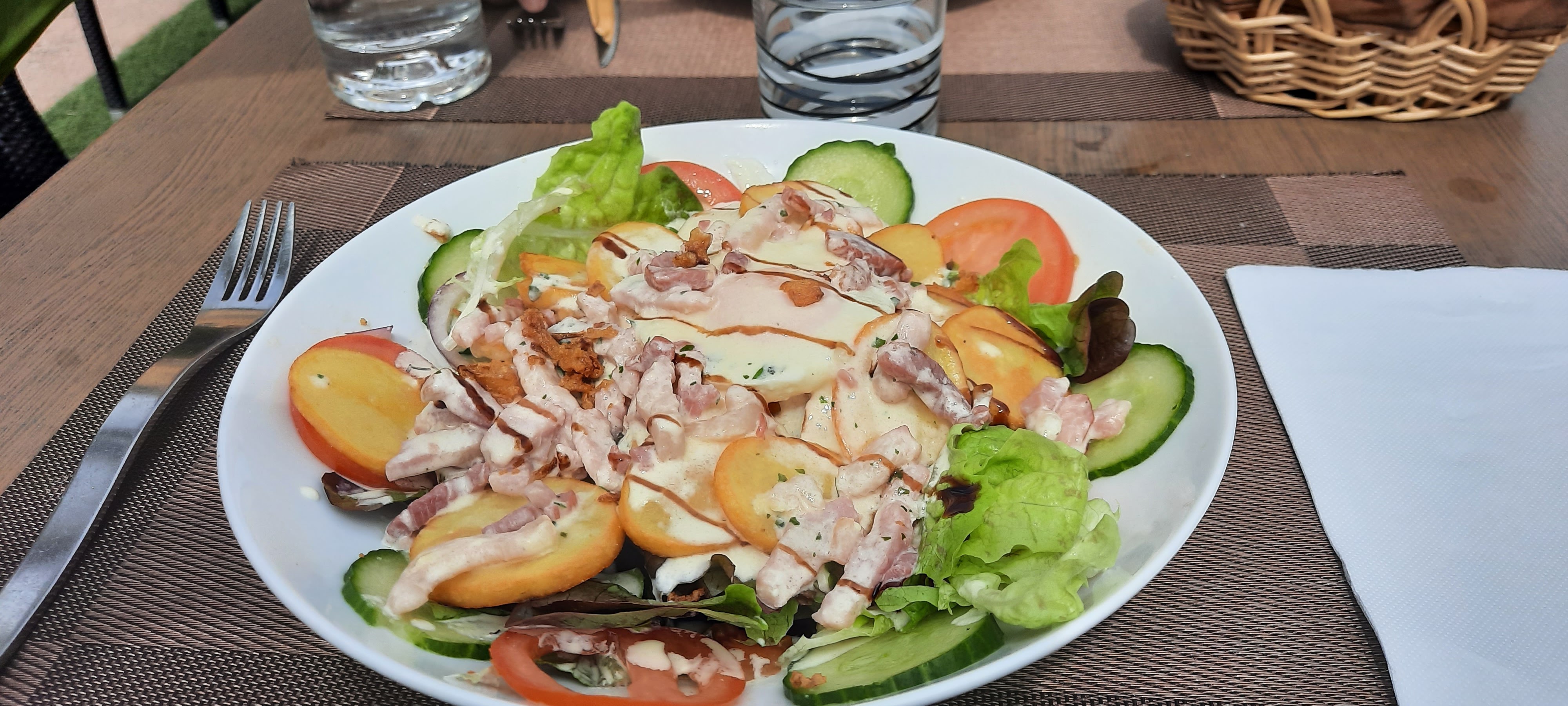 Superbes salades copieuses et délicieuses , servies en extérieur (italienne et César)..un régal ! Le service très bien également et les 2 serveurs attentifs au bien être des clients ...Rien à dire pour un excellent repas et un agréable moment de détente .Merci au chef d être passé voir ses clients . Au top !