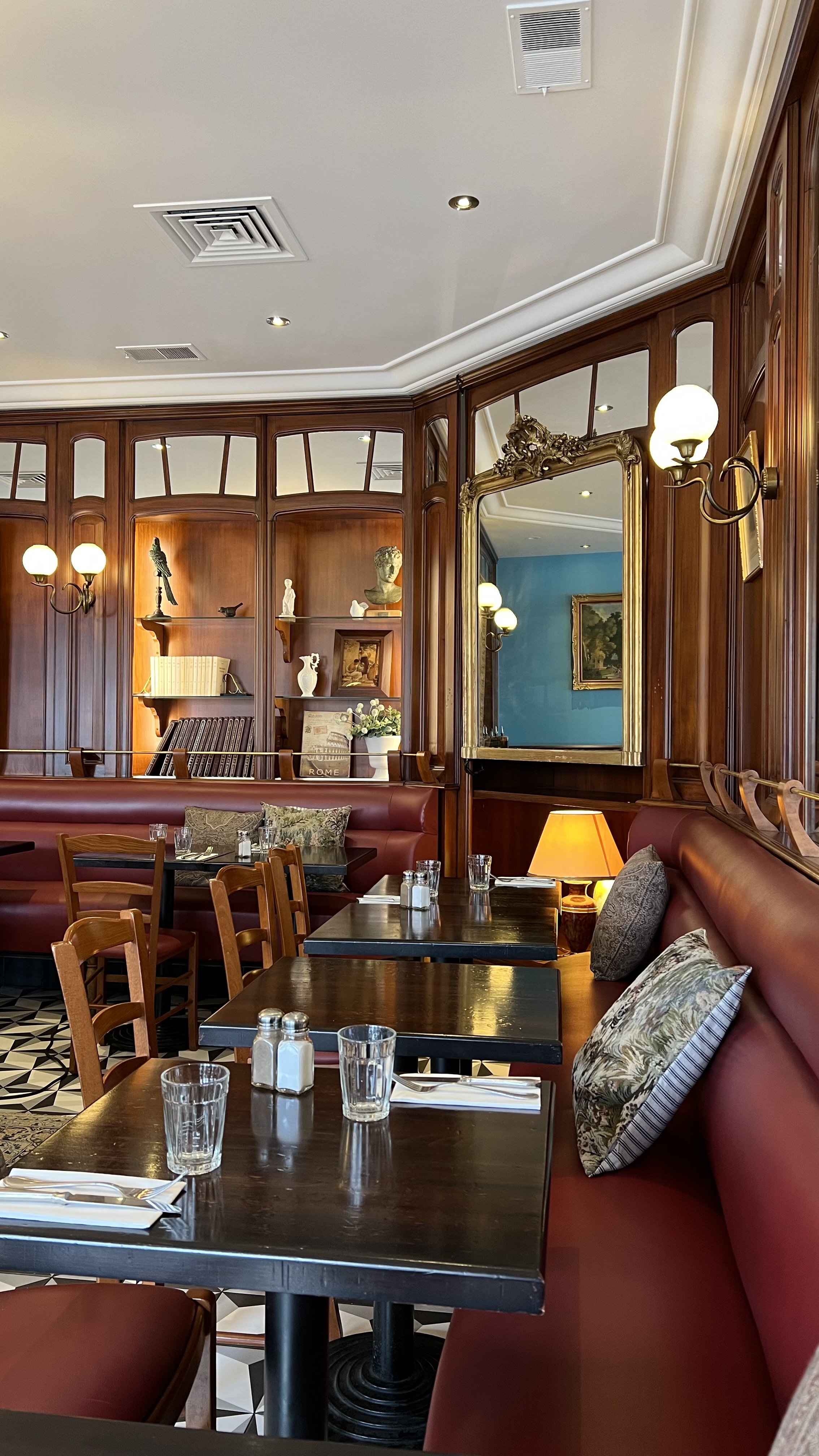❝ Bar-brasserie au décor lumineux avec banquettes bordeaux, boiseries et miroirs servant champagne et cocktails. ❞