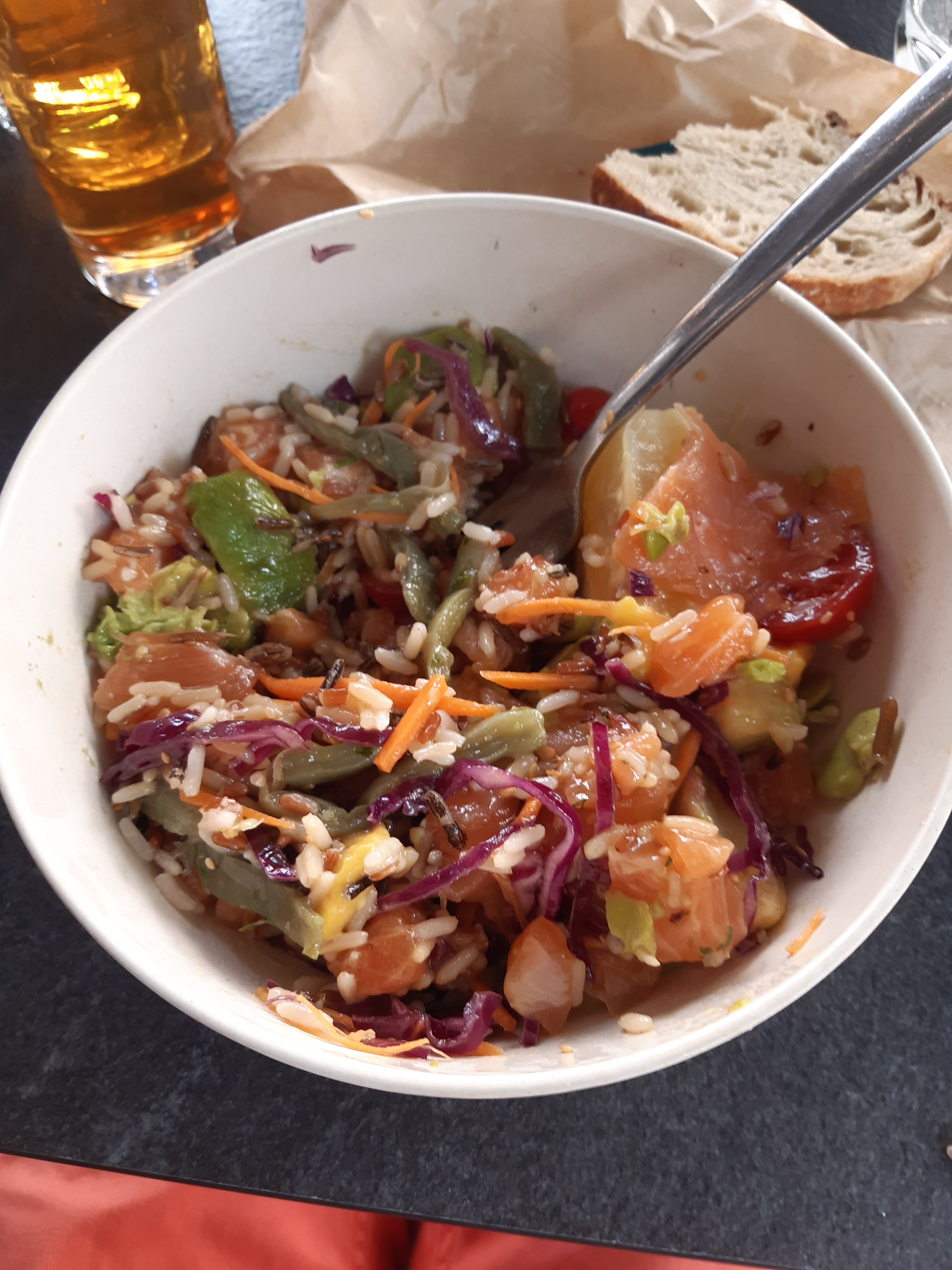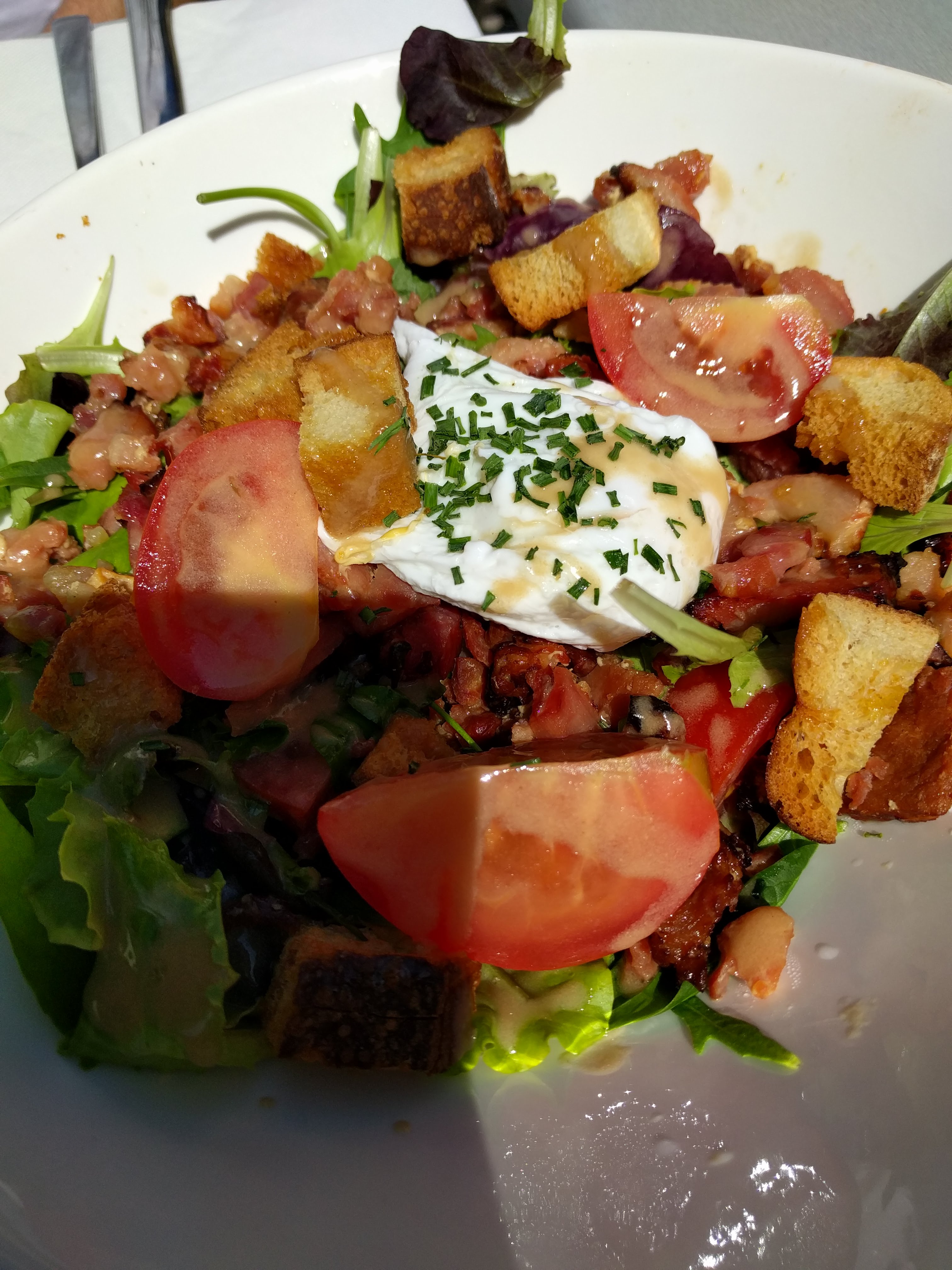 Une bonne adresse pour manger quelque chose au centre de Lyon. Lieu Est un bistro avec terrasse situé dans la rue de l'Hôpital. Un endroit très vivant. Service Un peu chaotique, les serveurs ne sont pas très nombreux et semblent avoir du mal à servir toutes les tables. Une fois installés, cela a pris environ 10 minutes. La nourriture est arrivée rapidement. Nourriture Nous avons déjeuné au République. Nous avons opté pour la salade lyonaise. Délicieux avec de nombreux lardons et un œuf parfaitement poché et de grosses portions. Pour le plat principal, le plat du jour était composé de côtelettes de porc sur un lit de riz brun et de légumes rôtis. Le plat était étonnamment bon et savoureux. C'est un bon endroit pour prendre une bière, une bouchée rapide ou un déjeuner.