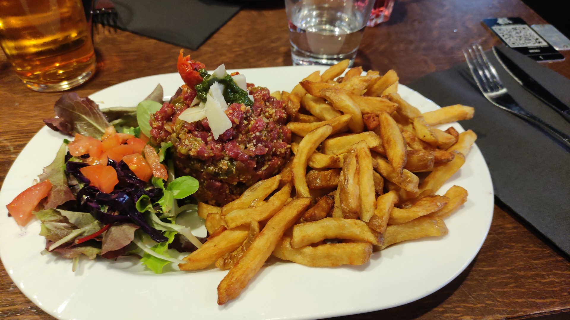 Parfait, service rapide et ultra souriant. Un très bon tartare de bœuf avec des frites maison. Prix raisonnable À refaire le midi
