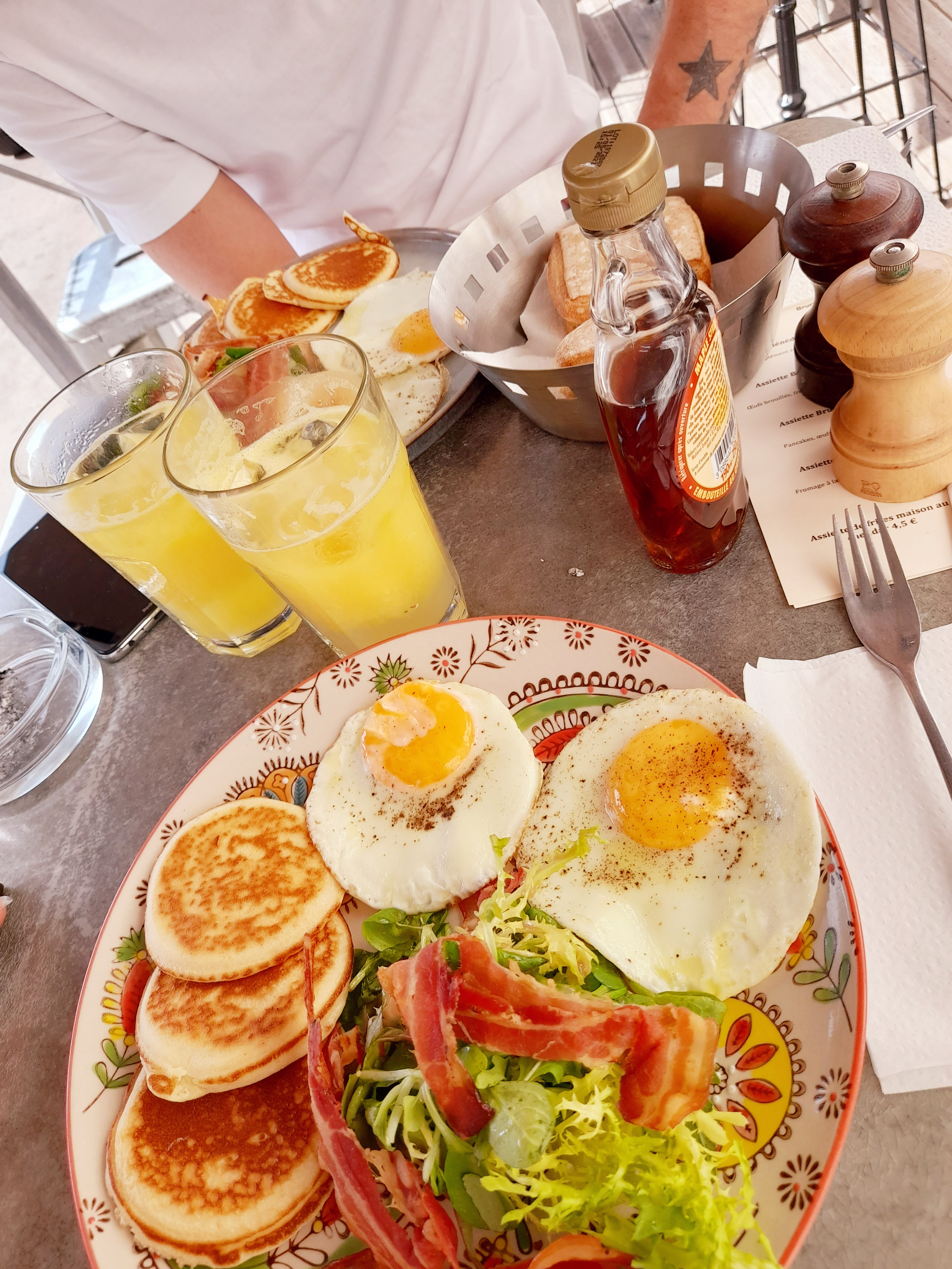 Nous nous faisions un plaisir de venir prendre un brunch après avoir consulté tous les bons avis sur internet. Nous avons été bien accueillies par la serveuse et placées rapidement. A partir de là, il a fallu attendre 15 minutes et une demande auprès de la serveuse pour obtenir les cartes, sachant que la salle/terrasse n'était même pas à demie pleine. J'ai pris le cocktail/smoothie violet, effectivement annoncé dilué avec de l'eau sur le flyer. Autant dire que malgré la couleur bien violette, le goût n'était que de l'eau, à peine aromatisée aux fruits... Lors de la commande, on nous annonce plus de yaourt, sachant qu'il était 11h et que le brunch finissait à 14h... Cela a enlevé plusieurs plats de la carte, mais cela peut arriver. Cependant, nous avons entendu quelques minutes plus tard, une autre table commander des plats avec du yaourt. Incompréhension, donc... Je commande un avocado toast et des pancakes aux fruits. De là, une attente de bien 45 minutes. Je reçois finalement l'avocado toast seul, et première déception en vue de la taille du plat par rapport au temps attendu et au prix.. 3 petits toasts et une salade sans sauce. La serveuse m'indique que les pancakes vont arriver. 15 nouvelles minutes se passent, au final, nous avons mangé le salé et la serveuse finit par annoncer qu'elle ne lance les pancakes que maintenant (une fois les plats débarrassés)... Nouvelle attente pendant plusieurs minutes. Je reçois les pancakes, malheureusement davantage de la taille de blinis que de pancakes, supposés être fruits et sirop d'érable. Les fruits sont bien là mais le sirop d'érable est manquant.. Nous demandons à la serveuse si cela est normal, et elle indique que cela a été remplacé par du miel. Cela n'avait aucunement été indiqué, et il n'y avait pas plus de miel dans l'assiette... Elle en a rapidement ramené un petit pot, mais en vue de tous les éléments déjà cités, on peut s'attendre à au moins une arrivée des plats correcte, mais ça n'a pas été le cas... Addition salée donc (30 euros pour les 3 éléments), en vue de tous les constats. Bien dommage...