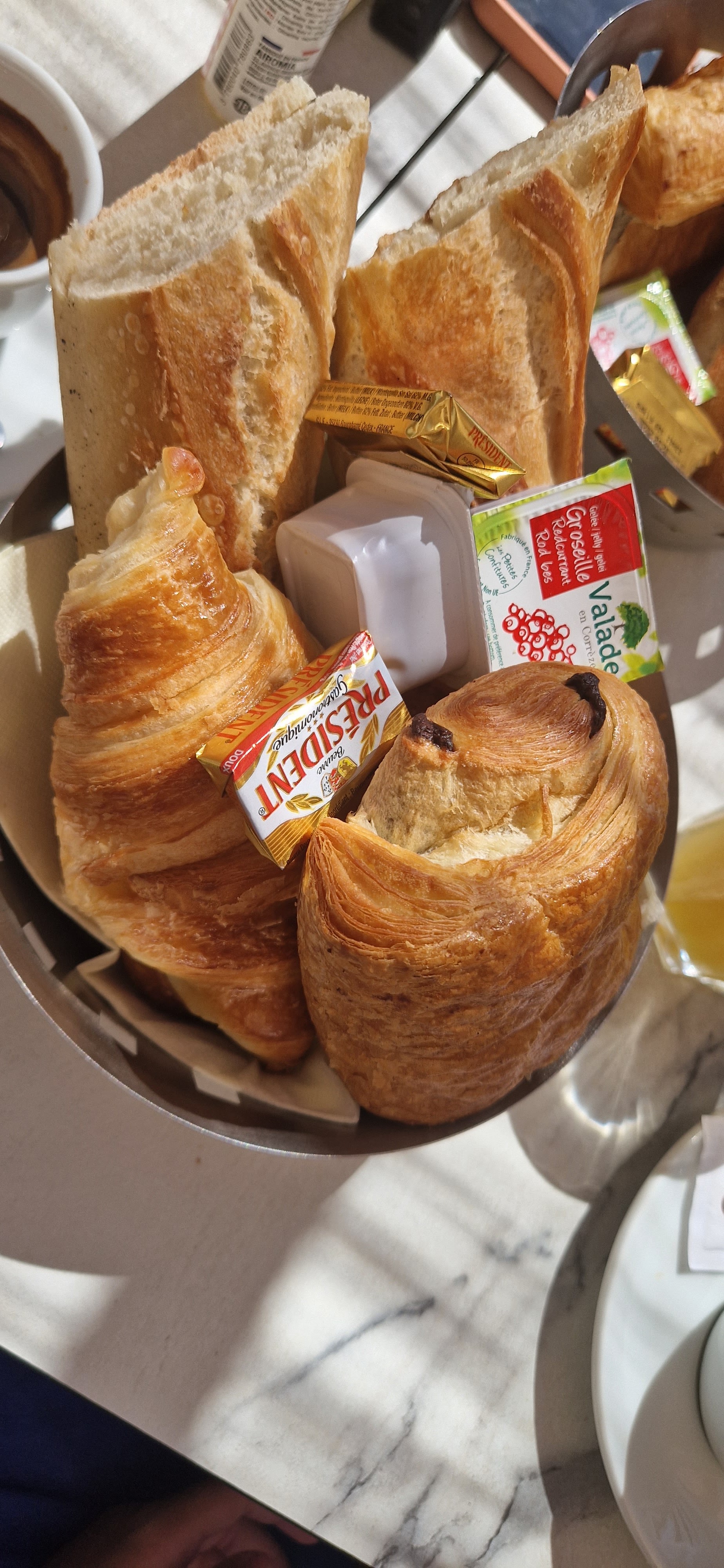 Courtois, petit déjeuner avec baguette, beurre, confiture, croissant et jus d'orange, excellent cappuccino, face au marché et au port, nous avons passé un très bon moment