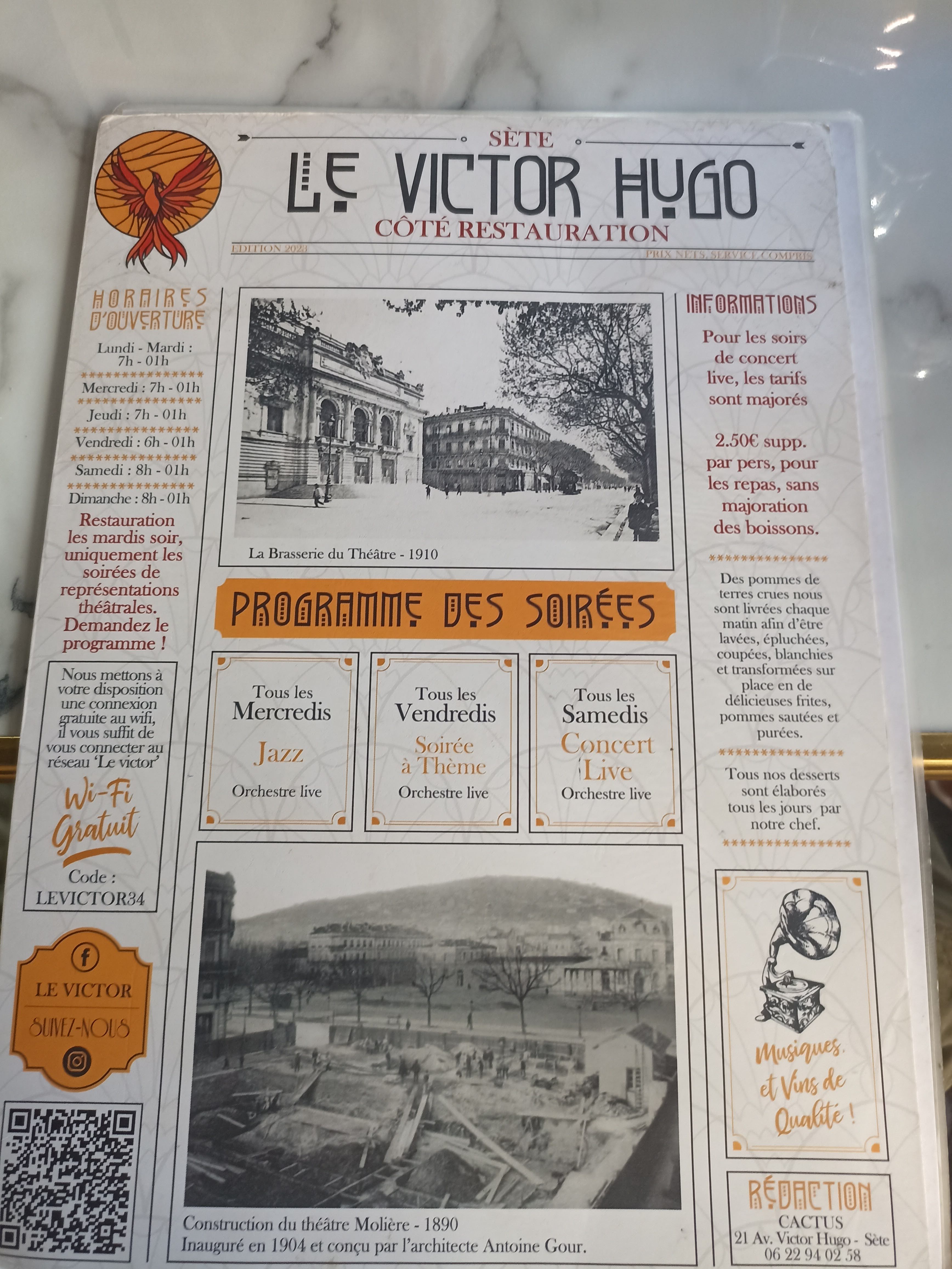 Le Victor, un bar aux allures de brasserie, un restaurant, un lieu que sétois.e.s ou non apprécient beaucoup pour son ambiance, son atmosphère, aujourd'hui élevé au rang d'institution de par son ancienneté dans le paysage local. Qu'il soit en journée bar ou restaurant, bordé par le grand marché hebdomadaire, ou qu'il soit en soirée le restaurant, avec ou sans animation musicale..... c'est avant tout la qualité de ses produits, de ses prestations, l'amabilité et l'efficacité de son équipe qui nous appellent et nous retiennent, nous les clients d'un jour ou les clients de toujours.