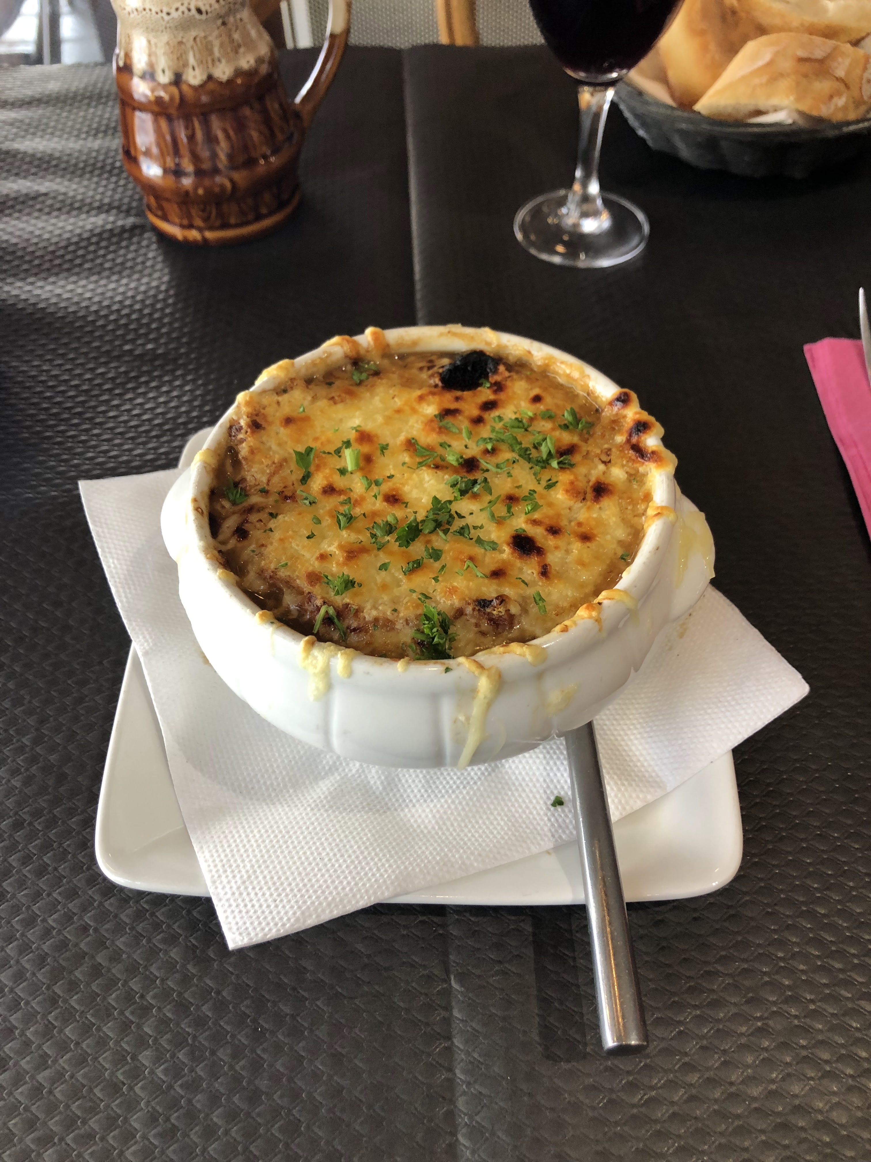 La soupe à l'oignon française était excellente mais les plats principaux étaient décevants. Canard et bœuf à la fois moelleux et trop cuits.