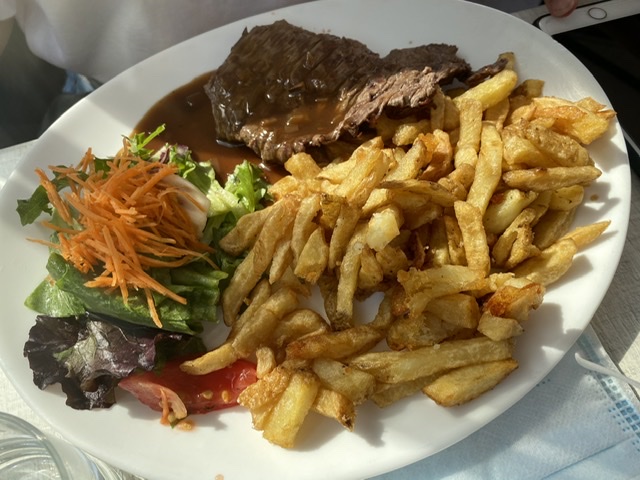 Brasserie en mode efficace… Pas de service à table (sauf les boissons). On choisit, on paye et on vient chercher son plat quand ça bip. C’est bon mais rien d’affolant (blanc de poulet bardé de lard et farci au Boursin) Plat + café + boisson à moins de 20€