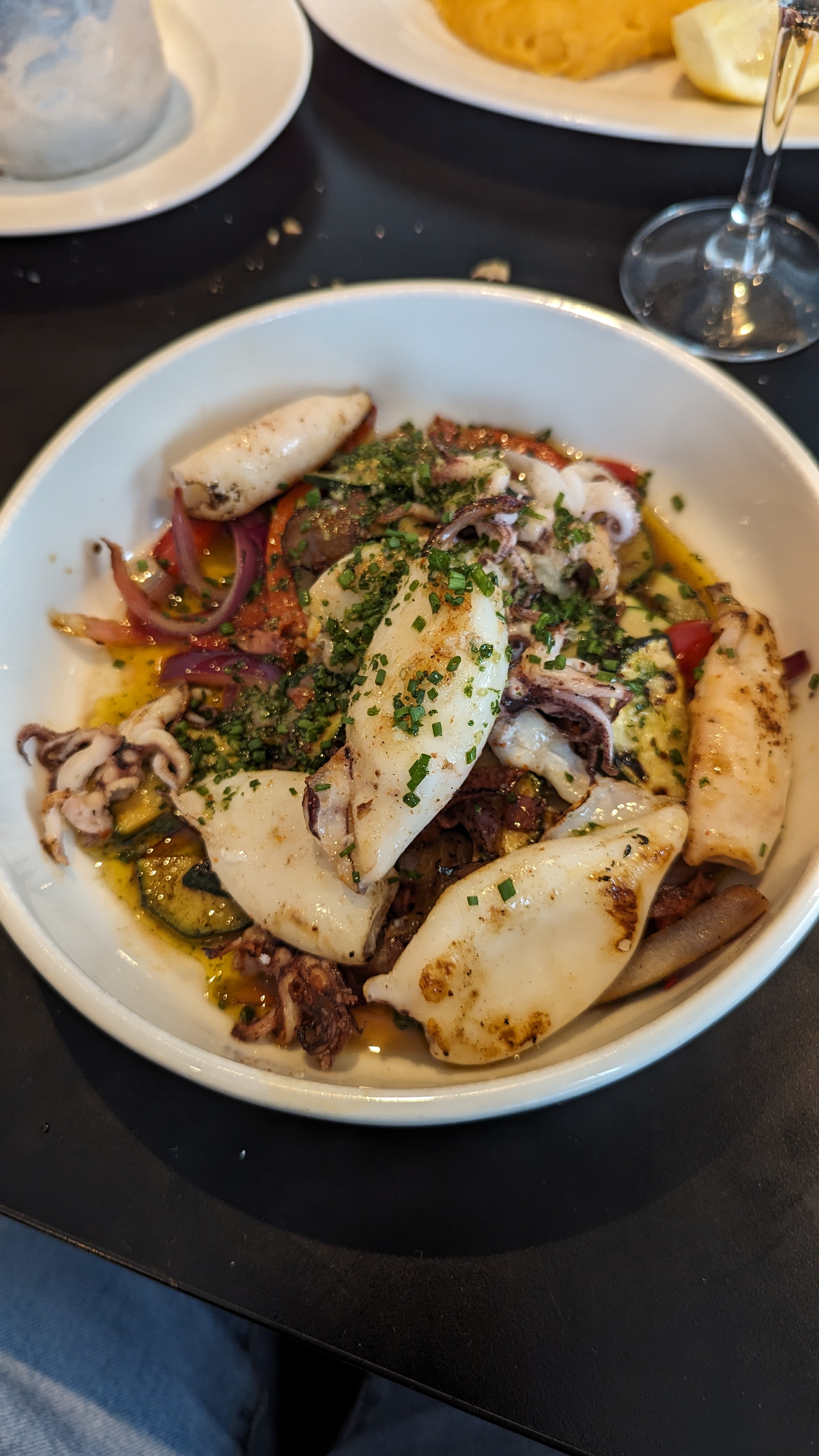 Délicieux encornets, un vrai régal ! En revanche, viande trop cuite (mais les brasseries ont toujours du mal à cuire une viande saignante), et service débordé et peu aimable... devant l'attente interminable, nous avons d'ailleurs abandonné le dessert...