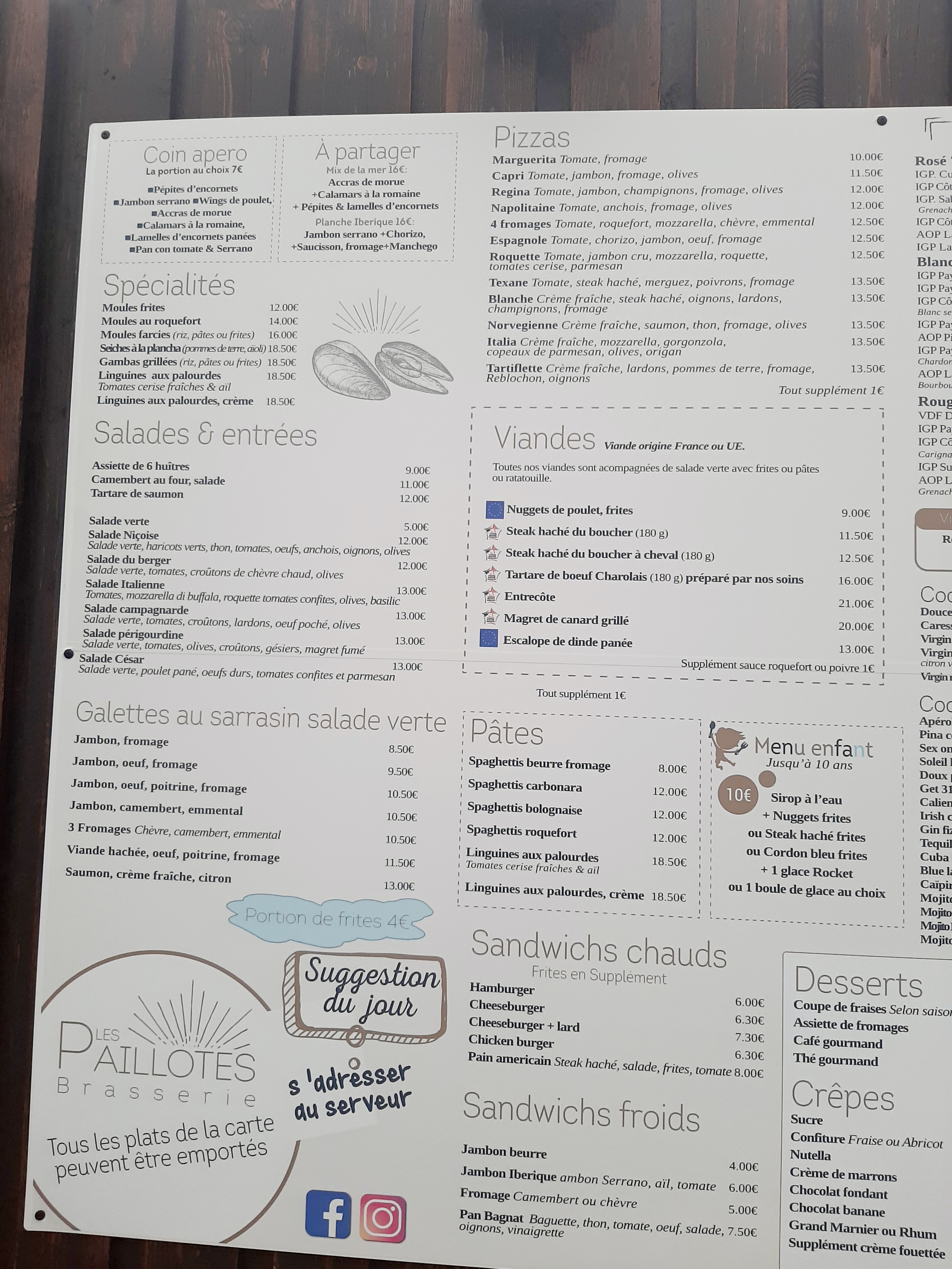 Très bon rapport qualité prix. 2ème Année que nous allons manger à la brasserie les paillotes. Toujours un régal ! Un repas les pieds 👣 dans le sable 🏖️ les Vacances bec un grand V !! Les enfants peuvent jouer tranquillement pendant que les parents profitent 😅 ! Je recommande les linguines à la palourdes à la crème, excellent ! 😋 menus enfants à 10,50€ avec un steack très bon. Accueil agréable, service de qualité.
