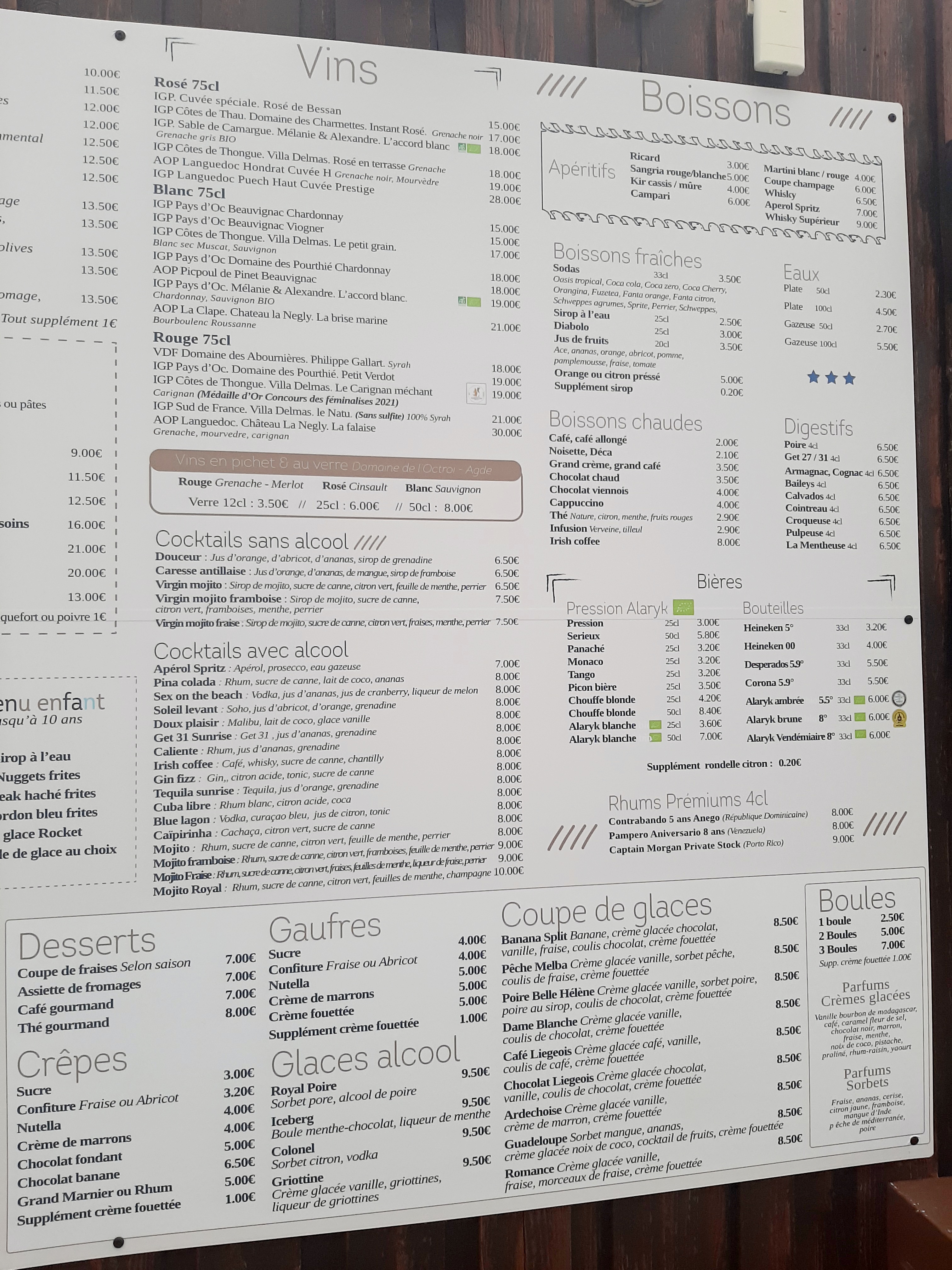 Nous avons mangé dans cet établissement en fin de saison, et en fin de soirée. Le service est sympathique et courtois même si il y a fallu demander 3 fois une carafe d’eau. Le serveur nous demande après 20 bonnes minutes si nous attendons encore nos desserts, ba oui mais on a le temps nous sommes en vacances ! Bref il était plus dépité que nous sur la situation, il doit y avoir de l’ambiance en cuisine ! Niveau cuisine c’est le minimum à notre goût au vu des prix pratiqués. Beaucoup de se qui sort de la cuisine ressemble à de l’industriel. Mais pourquoi pas à la rigueur quand il y a autant de tables ont ne peut pas faire du fait maison. Pour résumer nous n’avons pas passé là meilleur soirée des nos vacances mais pas la pire non plus ! Si vous êtes exigeant ce n’est pas un établissement pour vous. Un seul gros point négatif à la dame qui ressemble fort à la patronne, que l’on a pas vu sourire une seul fois.