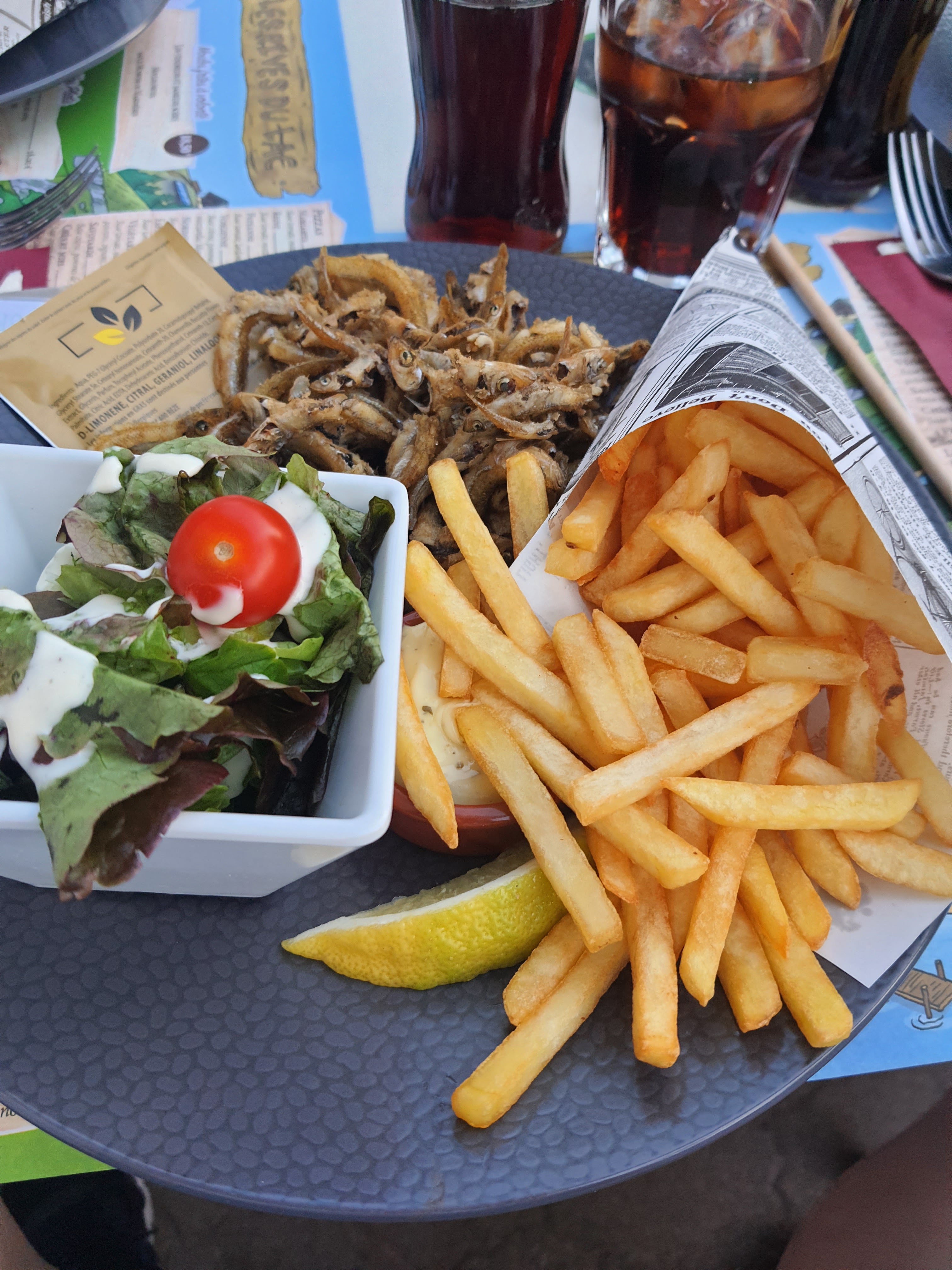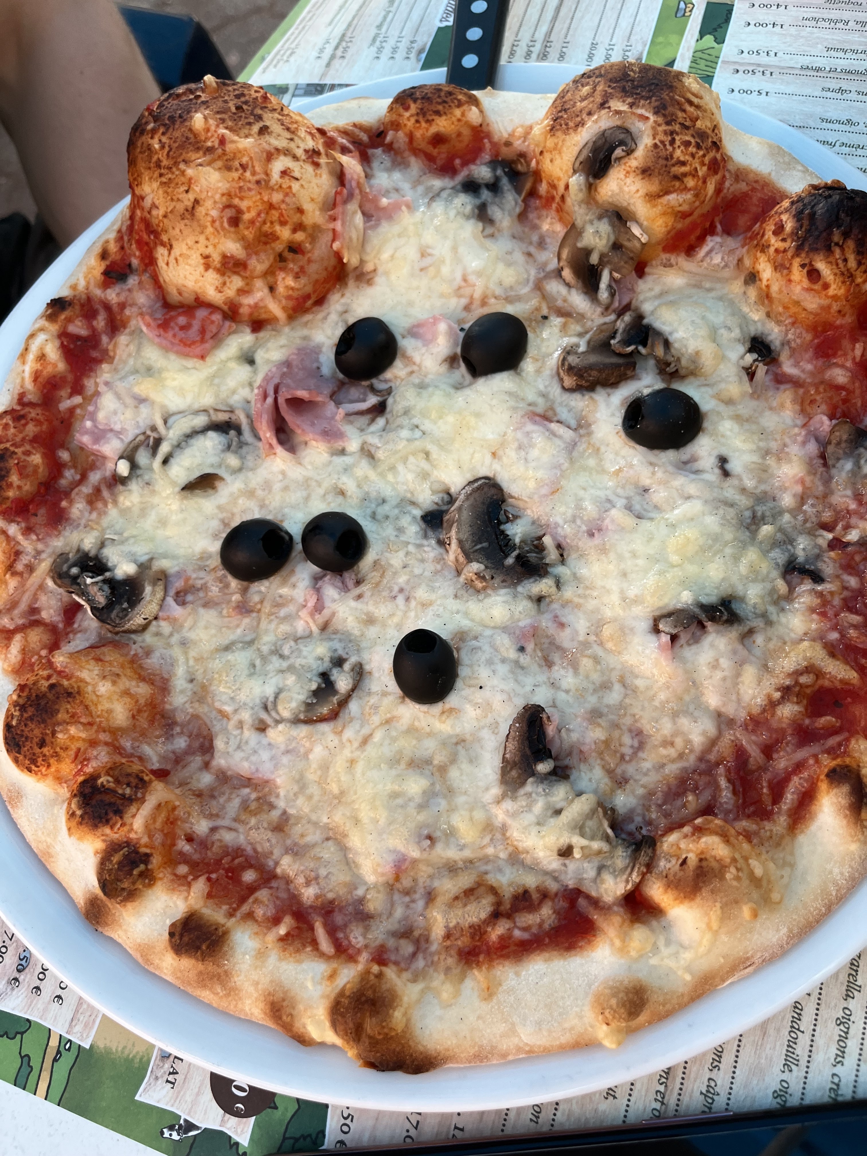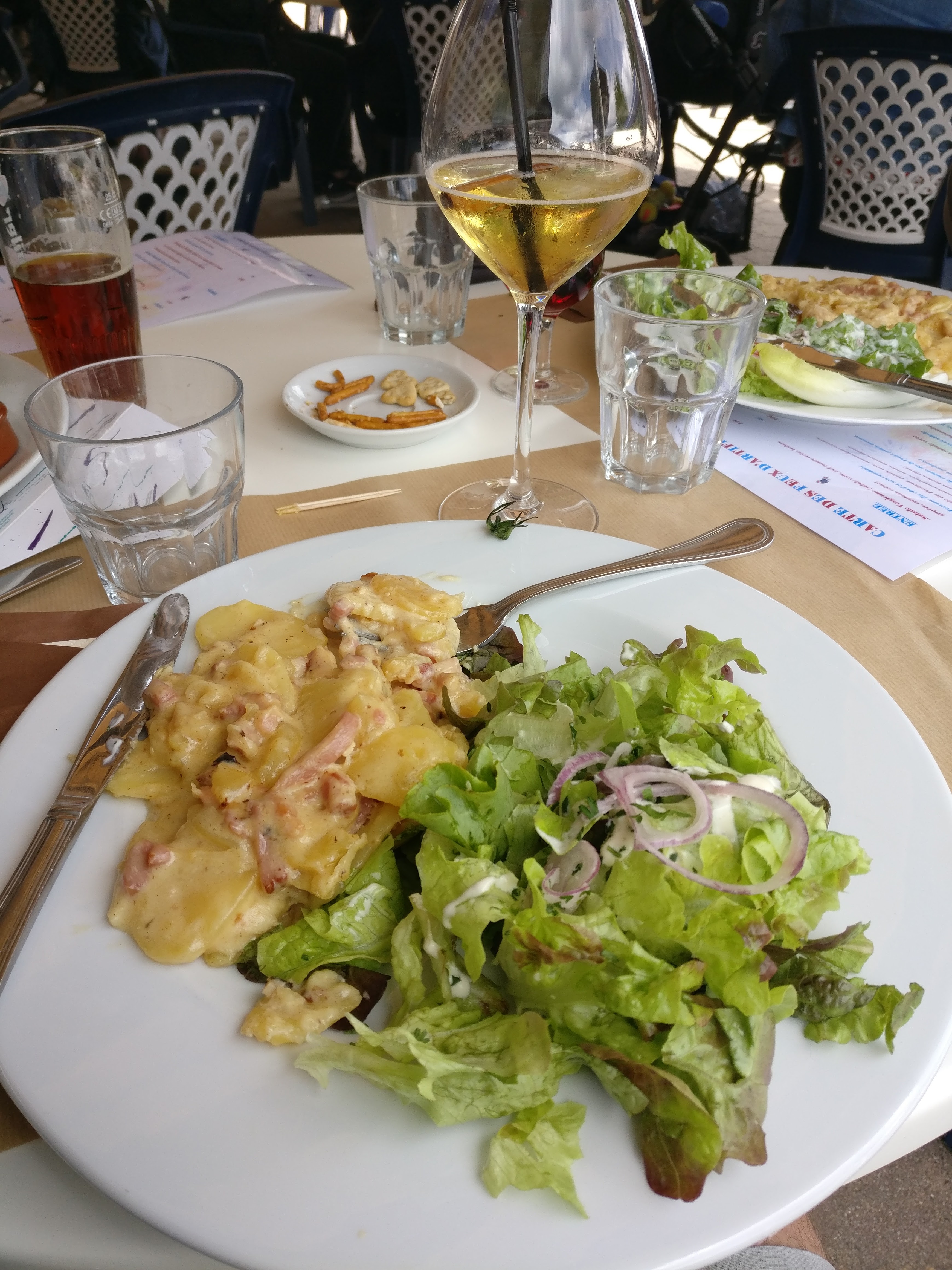 On paye le lieu (8,30€ le Spritz, 5,60 les deux boules de glace !! Plus cher qu’a Paris). Il y a du monde donc certes il faut être patient (la majorité des critiques sont basées la dessus). Le service est dynamique et les serveurs se démènent. Coté plat, on a testé : pizza au saumon (tres correcte) et salade Vosgienne (moyenne et si croutons industriels secs), crepe au sucre (il faut les aimer souples et peu grillées).
